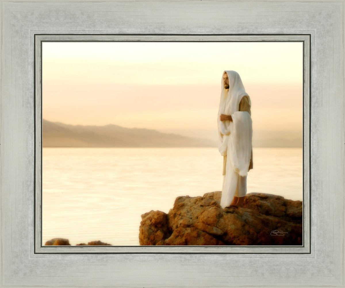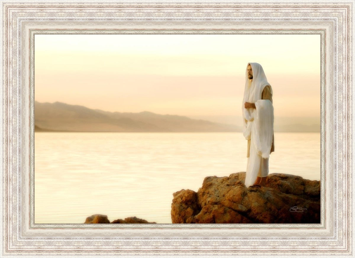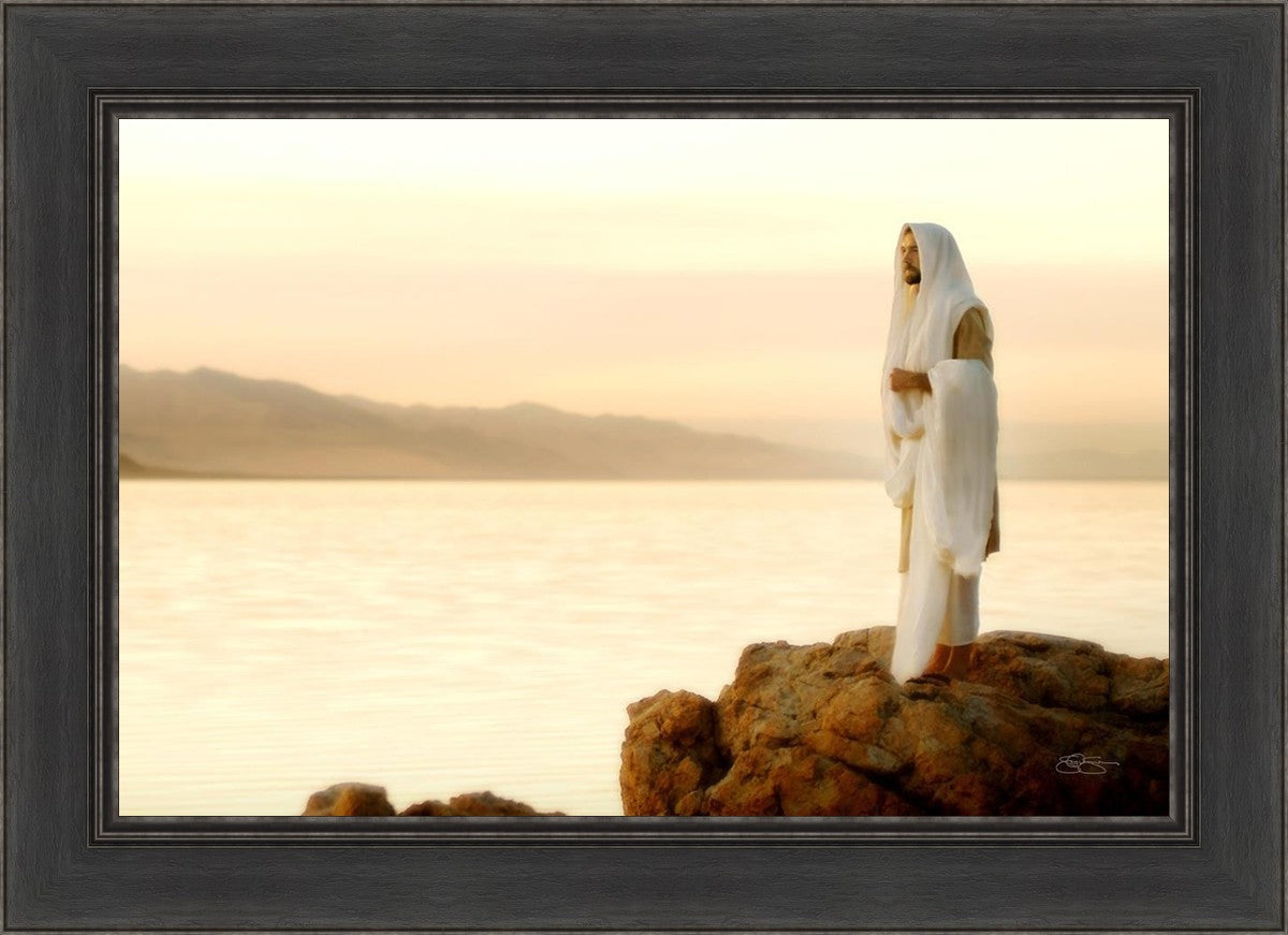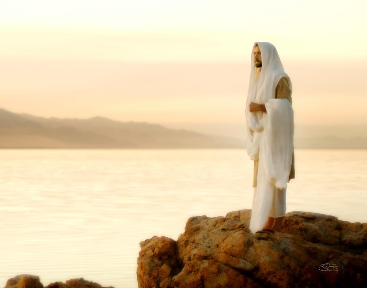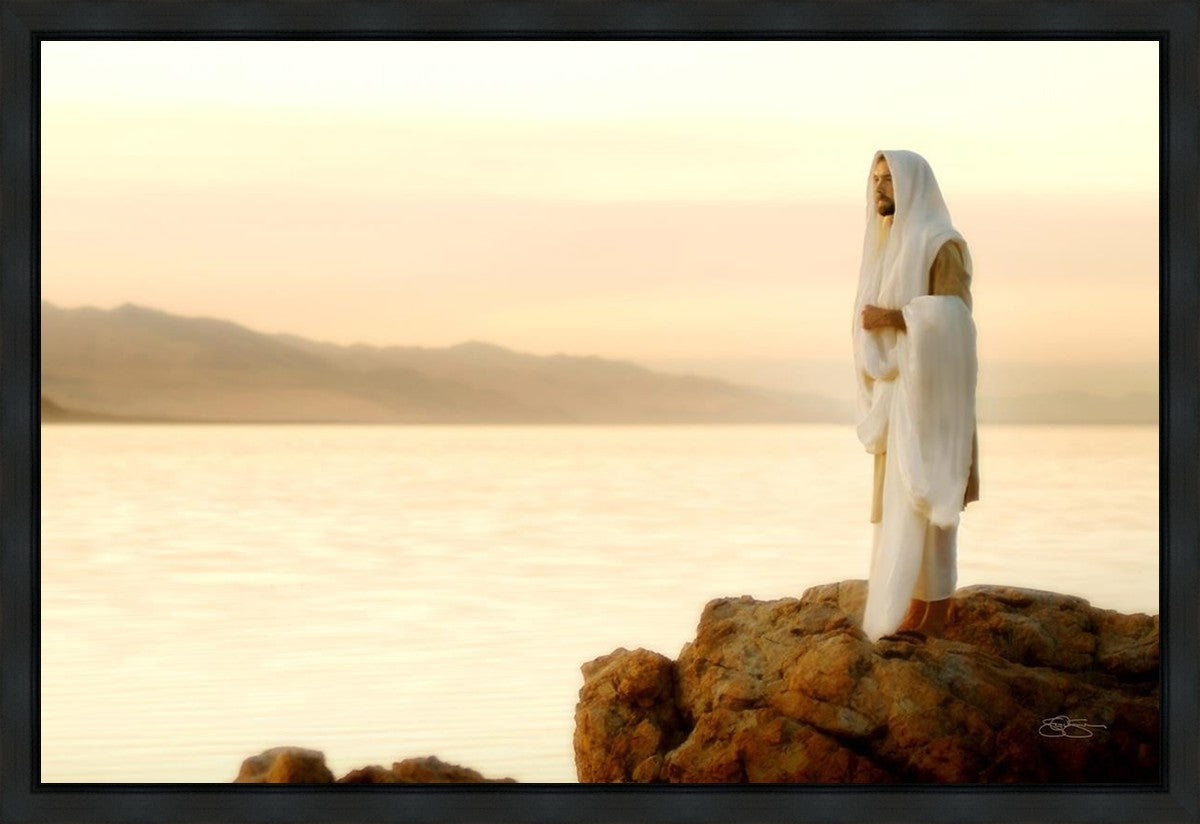 "Light of the World" by Scott Sumner depicts Jesus Christ the light of the world standing on shoreline rocks overlooking the Sea of Galilee.