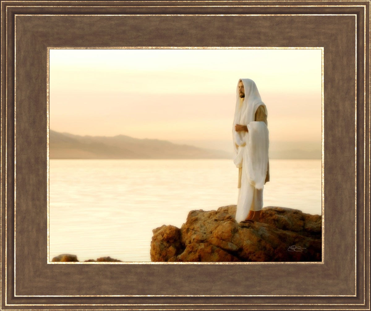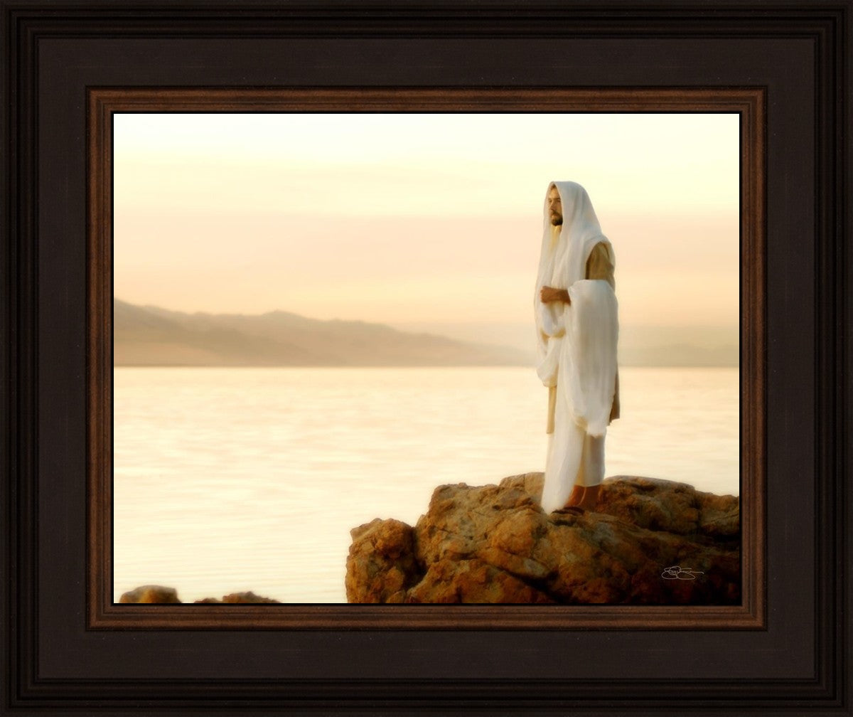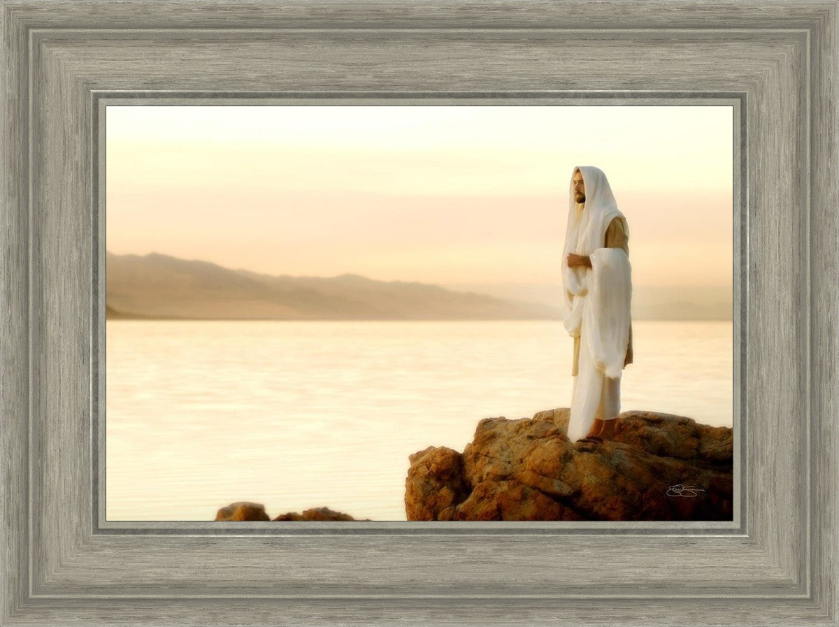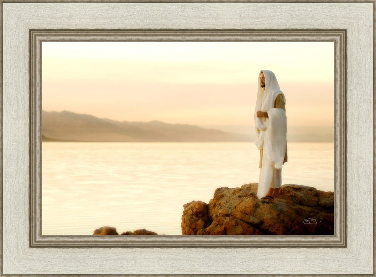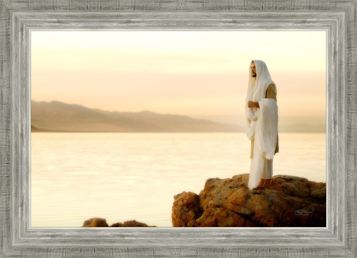 "Light of the World" by Scott Sumner depicts Jesus Christ the light of the world standing on shoreline rocks overlooking the Sea of Galilee.