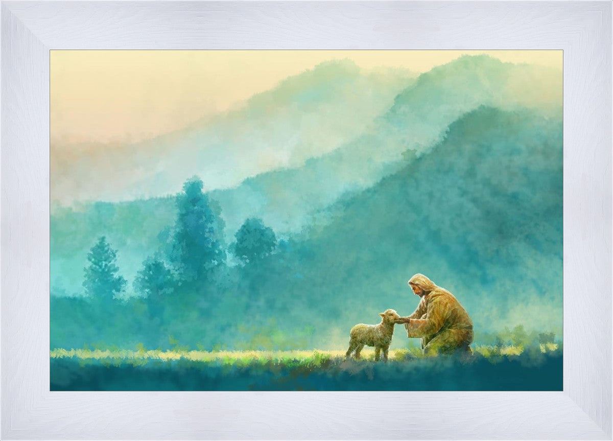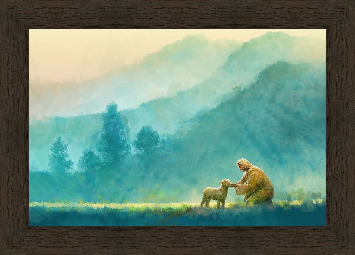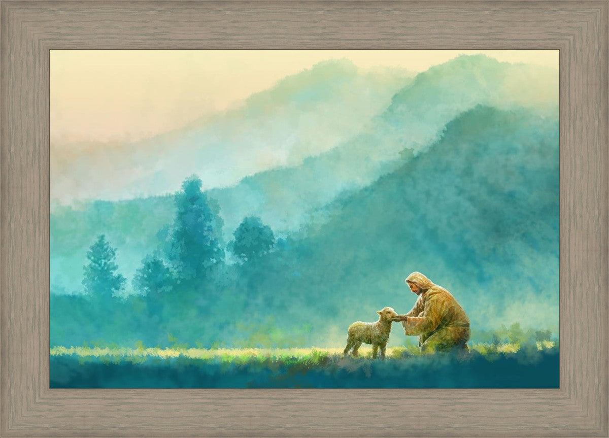 "Little One" by Yongsung Kim is a painting showcasing Jesus Christ tenderly caring for a lost lamb in a vast field, symbolizing His role as the Good Shepherd. This captivating artwork by Yongsung Kim captures the essence of divine care and compassion, for each and every member of His flock.