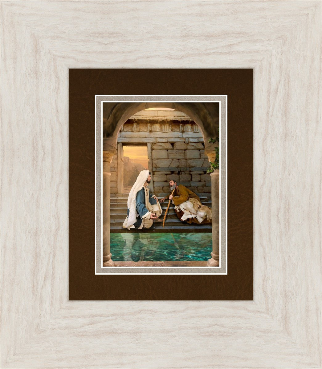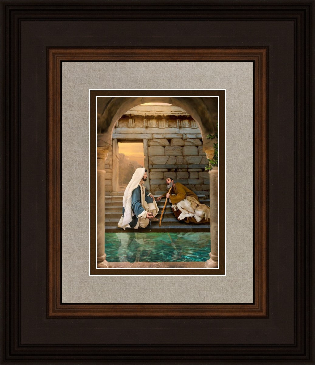 Nativity scene of the birth of Christ near the watchtower of the flock just outside of Bethlehem. It was here that these special sheperds watched over the sacrificial Lambs. These lambs were wrapped in swaddling cloths at birth to protect them as they had to be The Savior as a perfect example goes and ministers where the people are. Here we find Jesus at the waters of Bethesda teaching and healing the man. Suggesting that the Savior is really the source of living water.