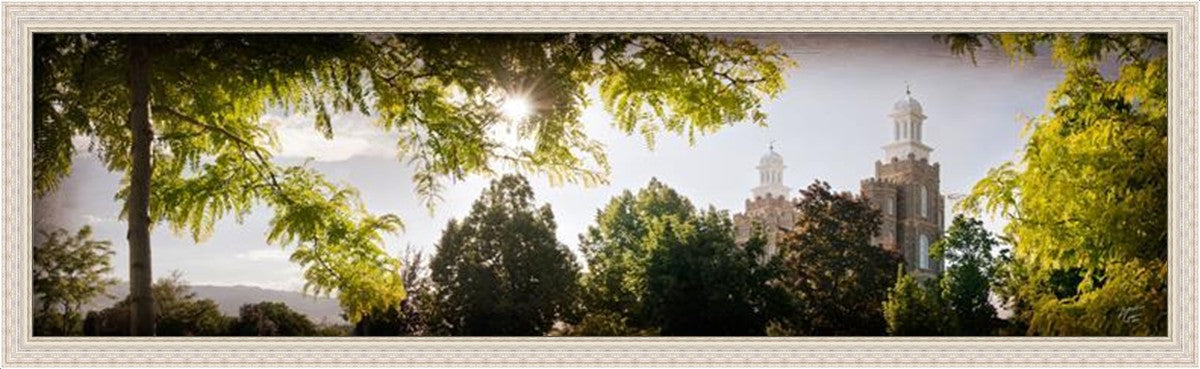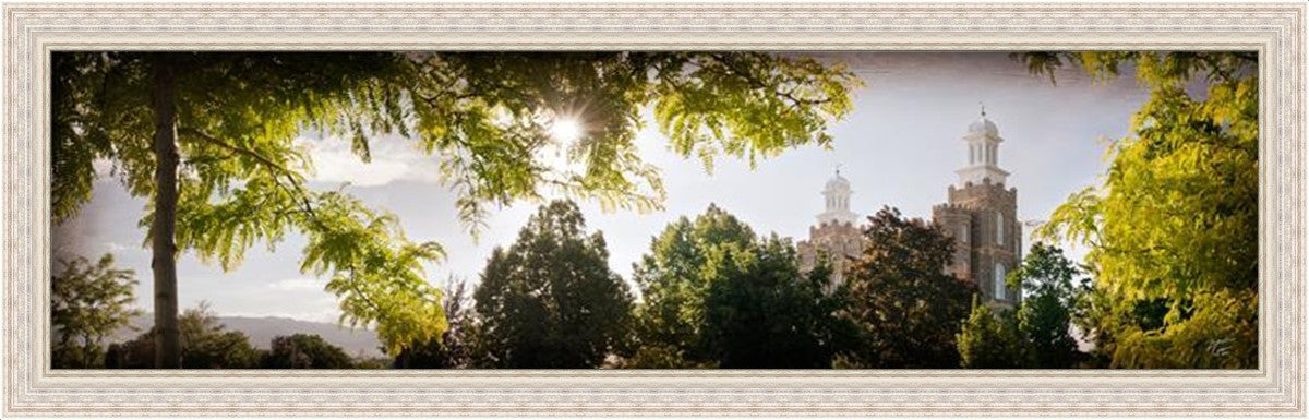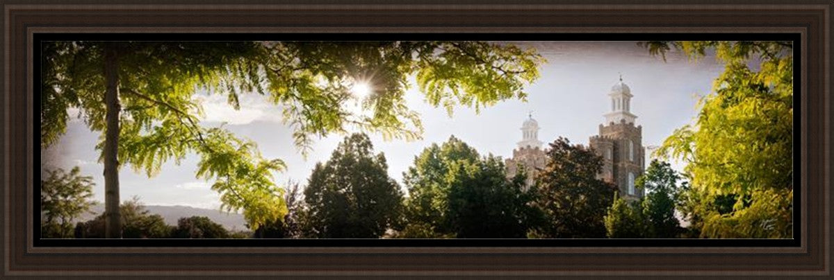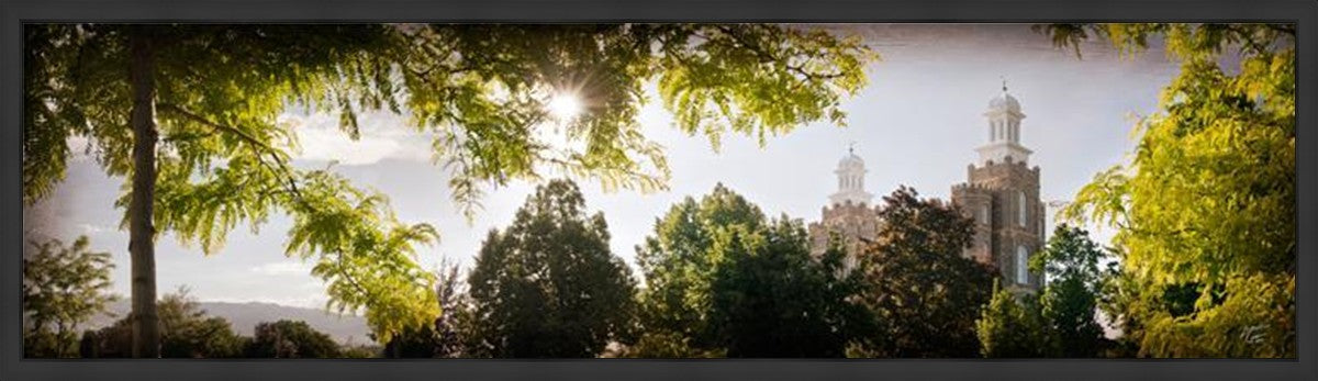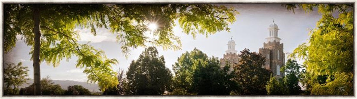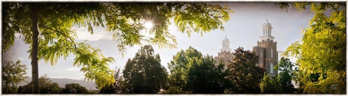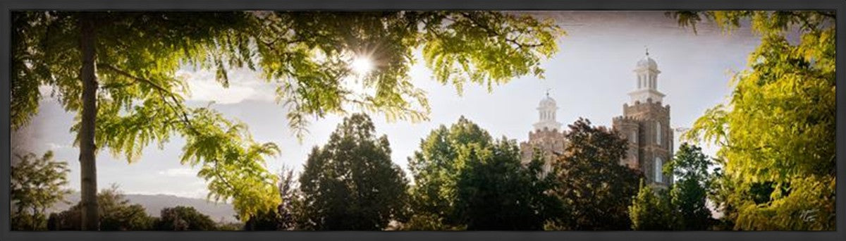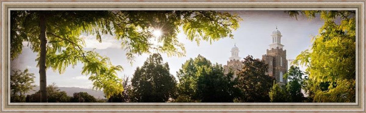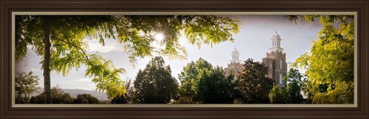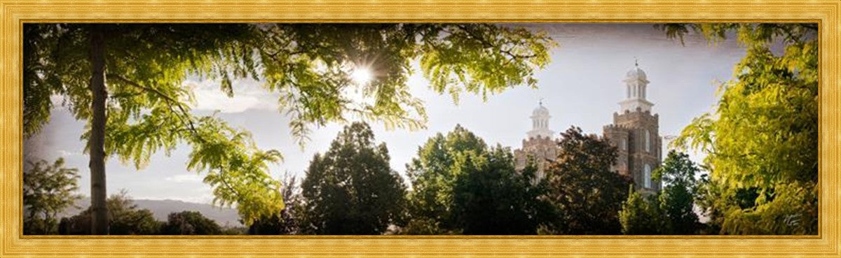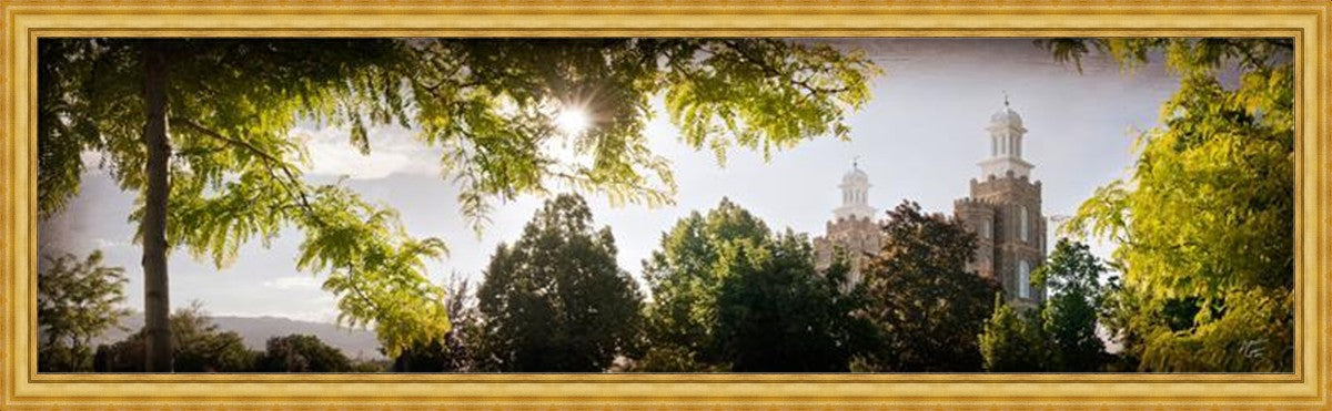 Since 1999 Landon has worked as an artisan in nearly 40 temples doing the decorative paint and gold leaf. He continues to do so as well as wood repair and graining. He was married in 2001 to Jacey Thomas in the Manti Utah temple. When she couldn’t find an image of the temple that she liked enough to purchase for their home, he decided to take one himself. That desire to create something original and different inspired his current series of temple art. They are taken from a panoramic viewpoint and stylized with an artistic border that reflect his paintings. All modern structures apart from the temple have been omitted.