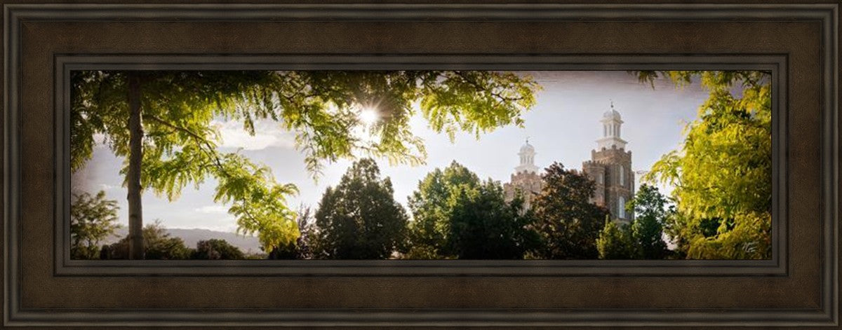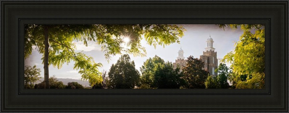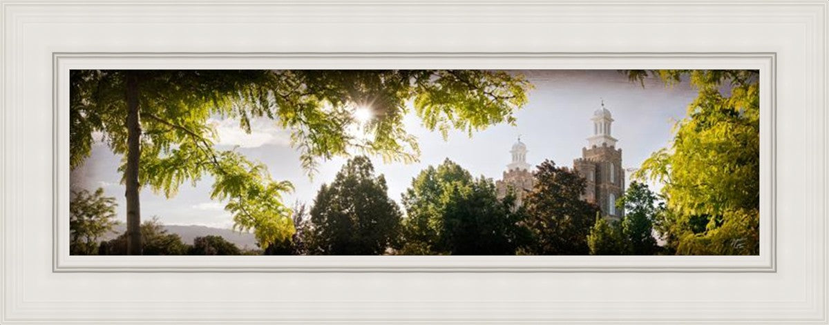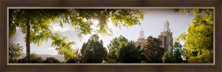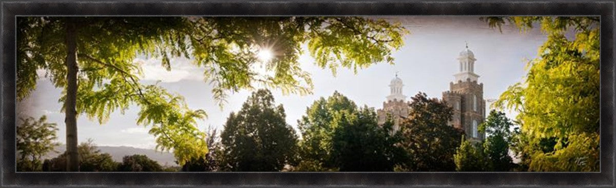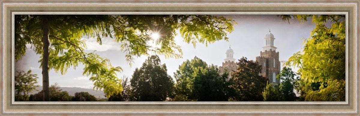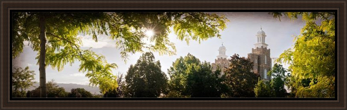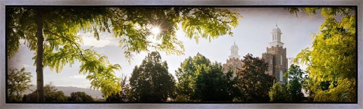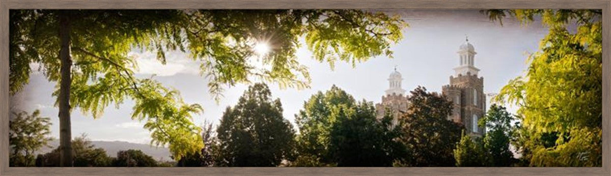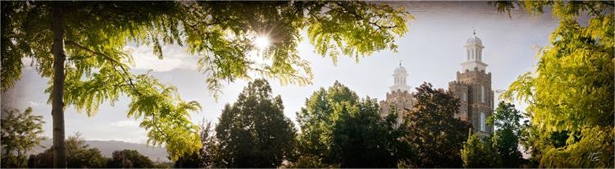 Since 1999 Landon has worked as an artisan in nearly 40 temples doing the decorative paint and gold leaf. He continues to do so as well as wood repair and graining. He was married in 2001 to Jacey Thomas in the Manti Utah temple. When she couldn’t find an image of the temple that she liked enough to purchase for their home, he decided to take one himself. That desire to create something original and different inspired his current series of temple art. They are taken from a panoramic viewpoint and stylized with an artistic border that reflect his paintings. All modern structures apart from the temple have been omitted.
