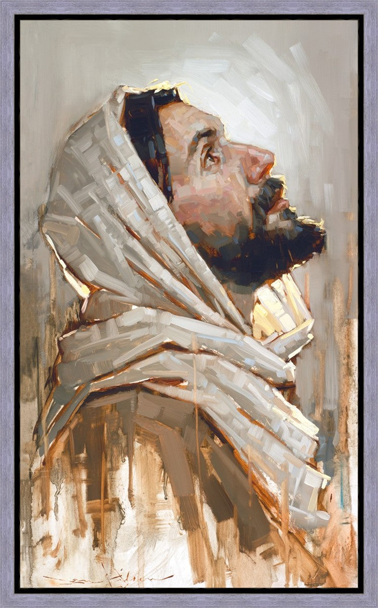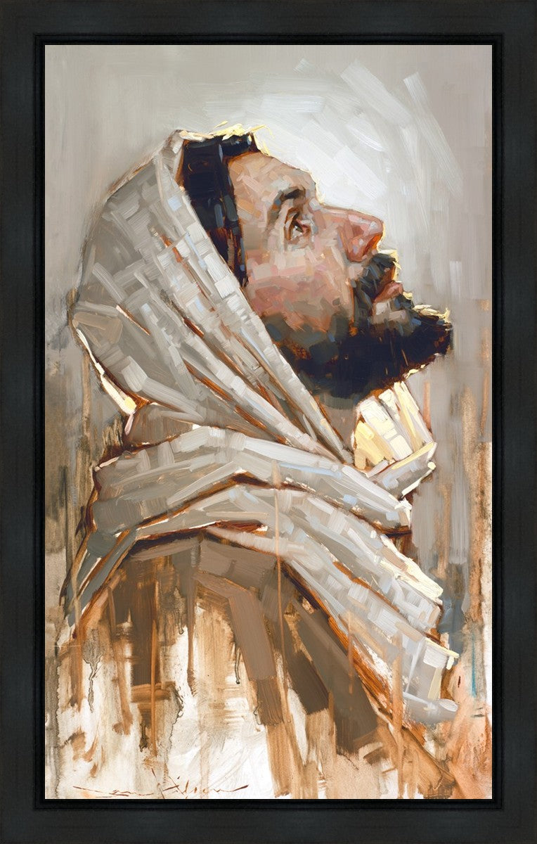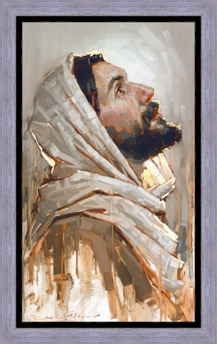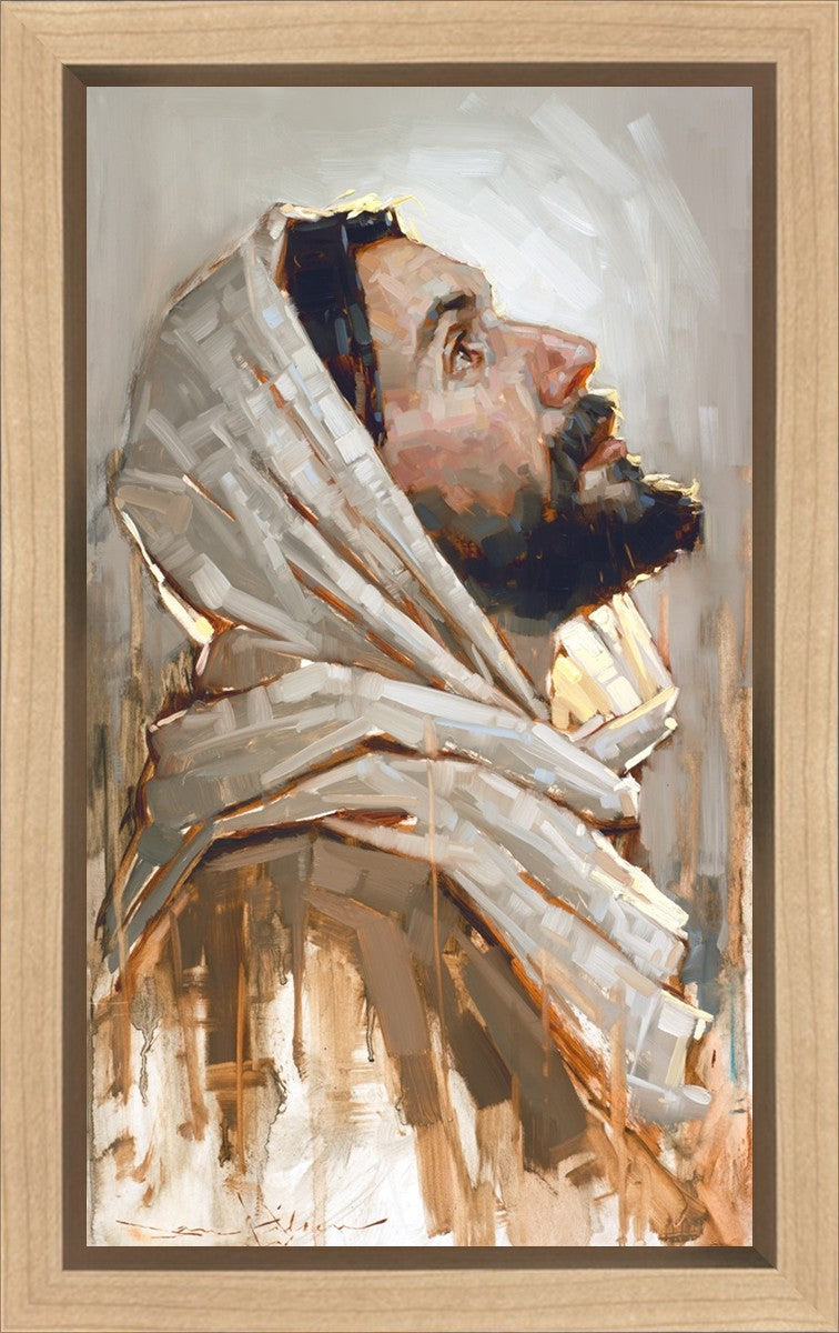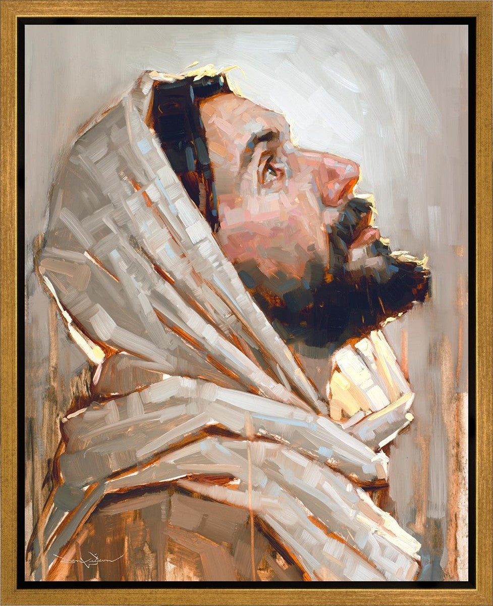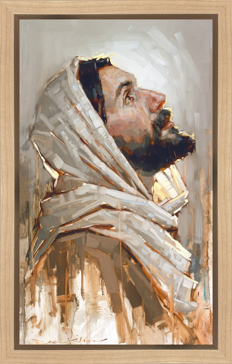 Look to God and Live" painting by Dan Wilson is an inspiring painting depicting Jesus' side profile, gazing upwards toward heaven amidst turbulent waves, symbolizing the importance of turning to God for guidance and salvation. This Christian artwork by Dan Wilson embodies themes of faith, hope, redemption, and the transformative power of turning to Him.