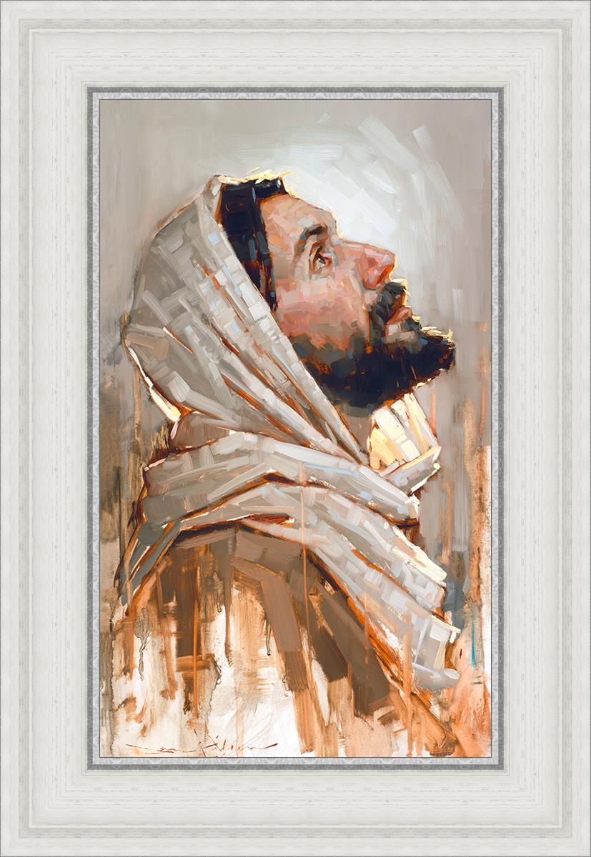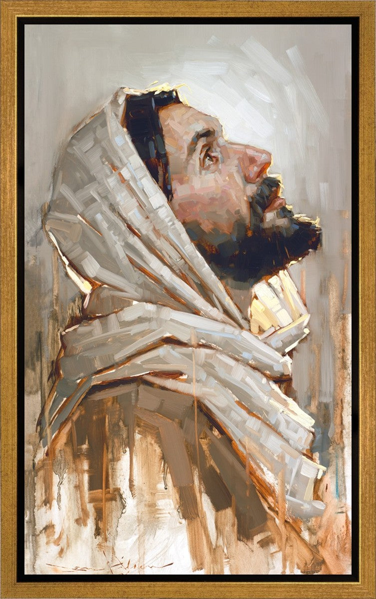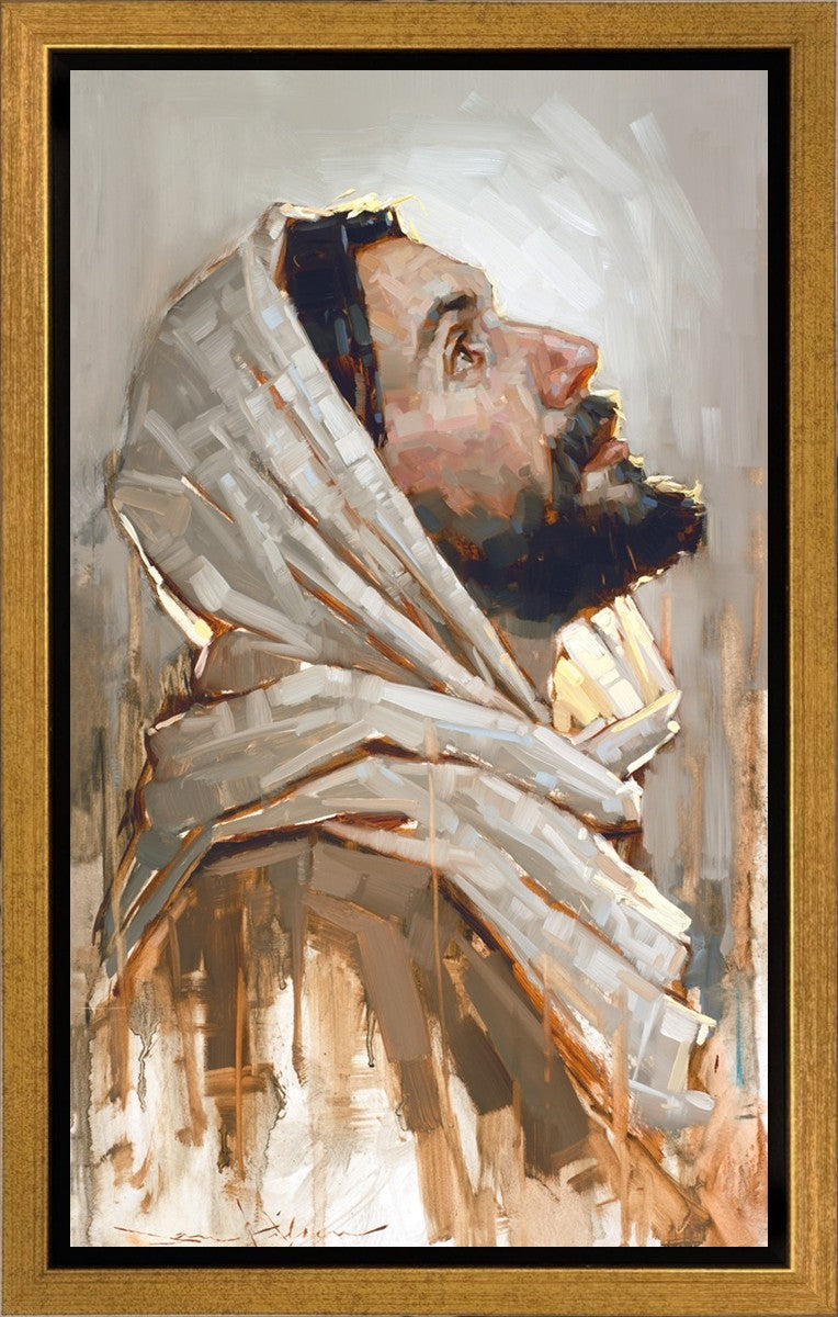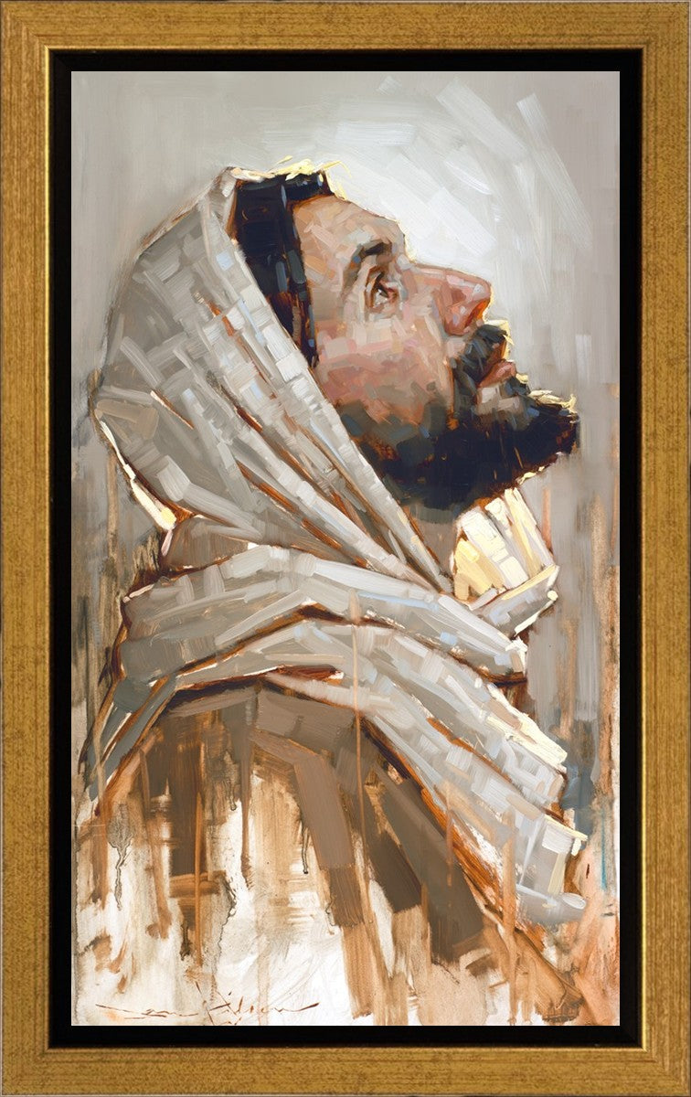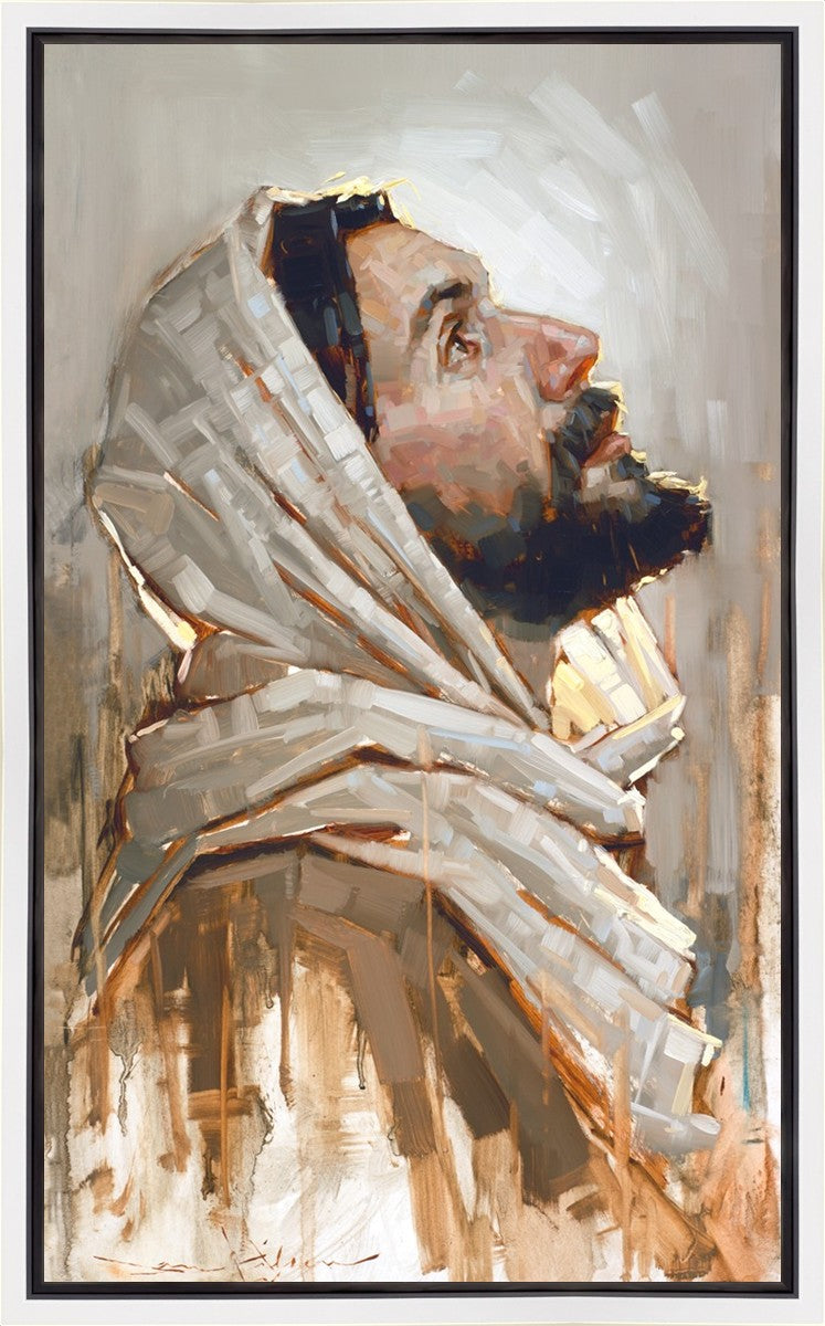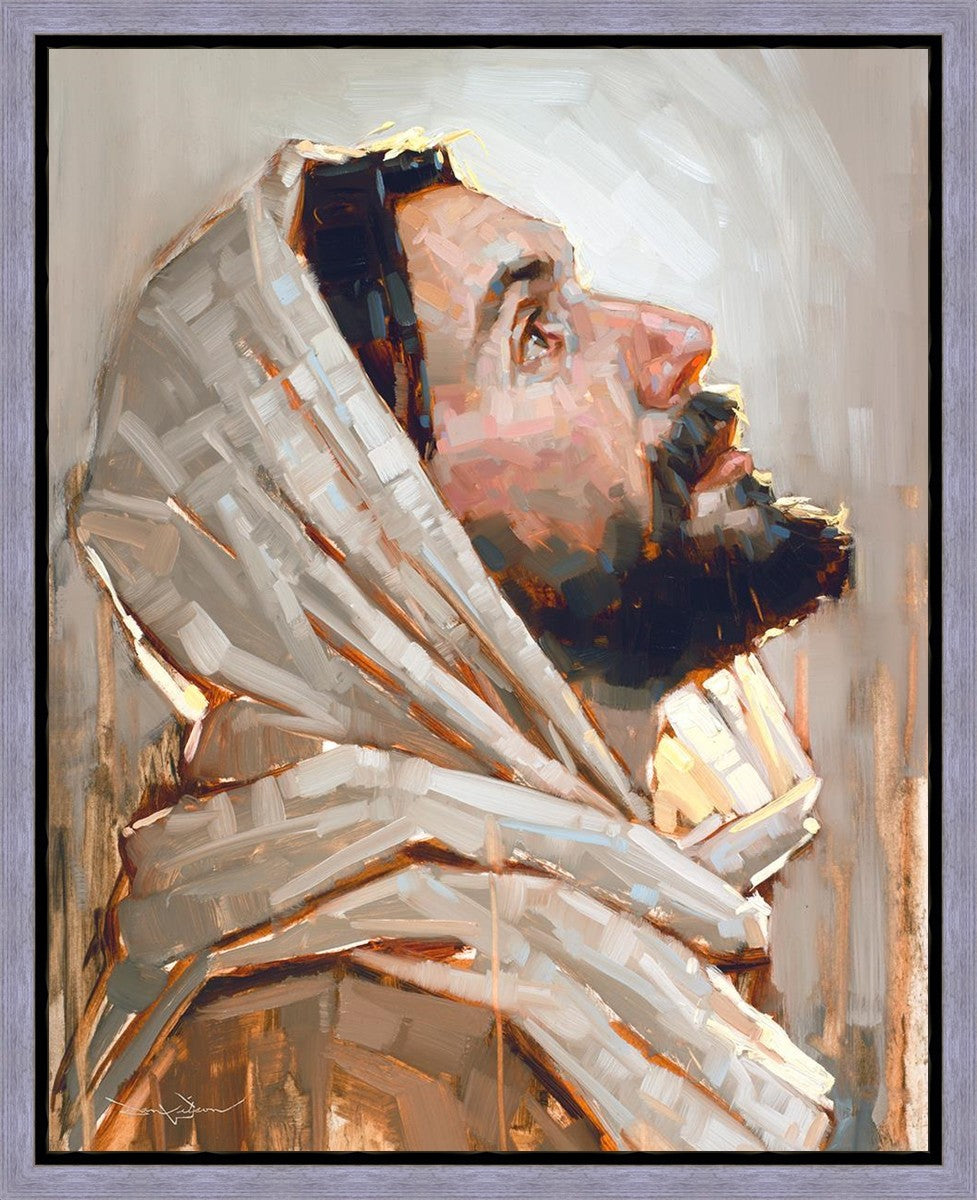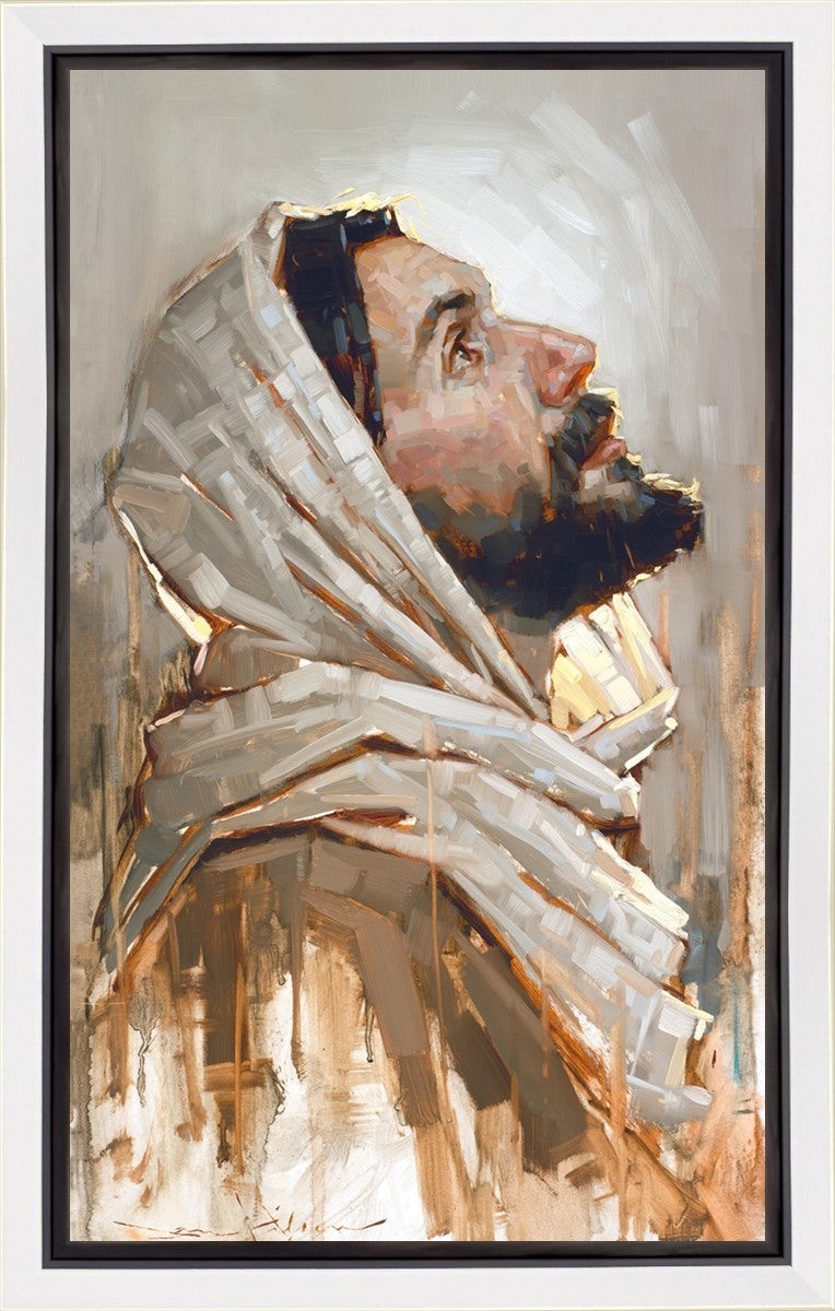Look to God and Live" painting by Dan Wilson is an inspiring painting depicting Jesus' side profile, gazing upwards toward heaven amidst turbulent waves, symbolizing the importance of turning to God for guidance and salvation. This Christian artwork by Dan Wilson embodies themes of faith, hope, redemption, and the transformative power of turning to Him.