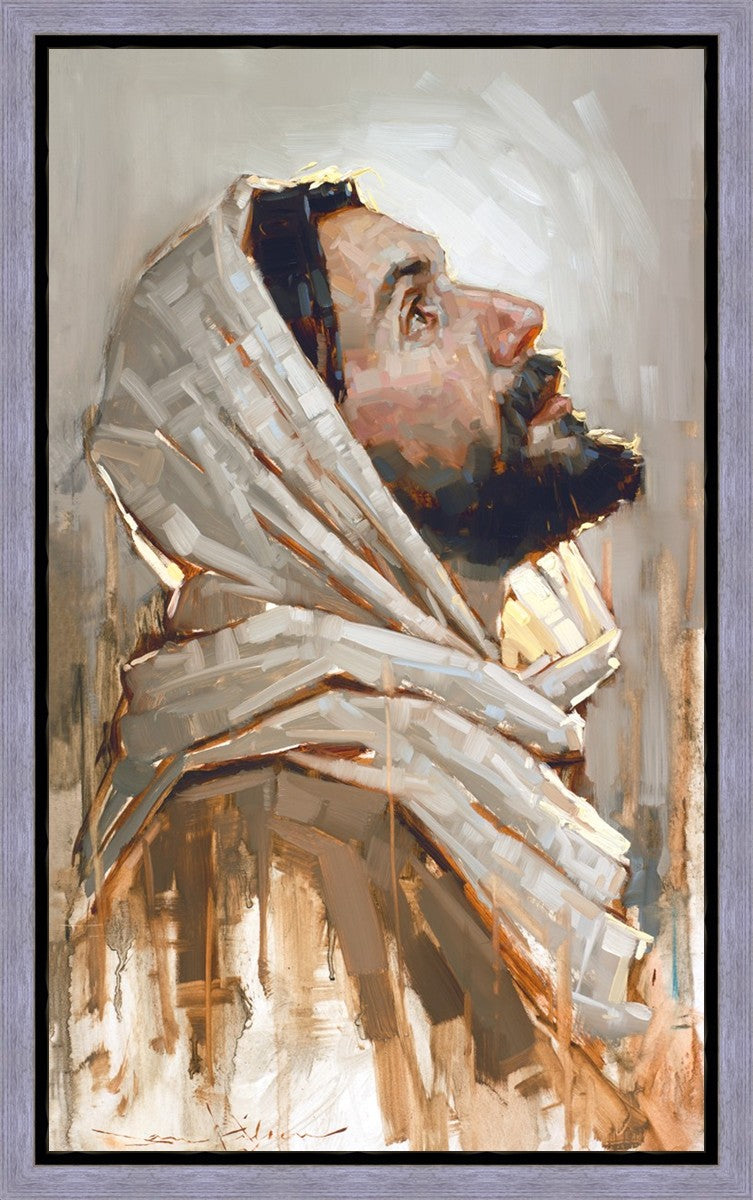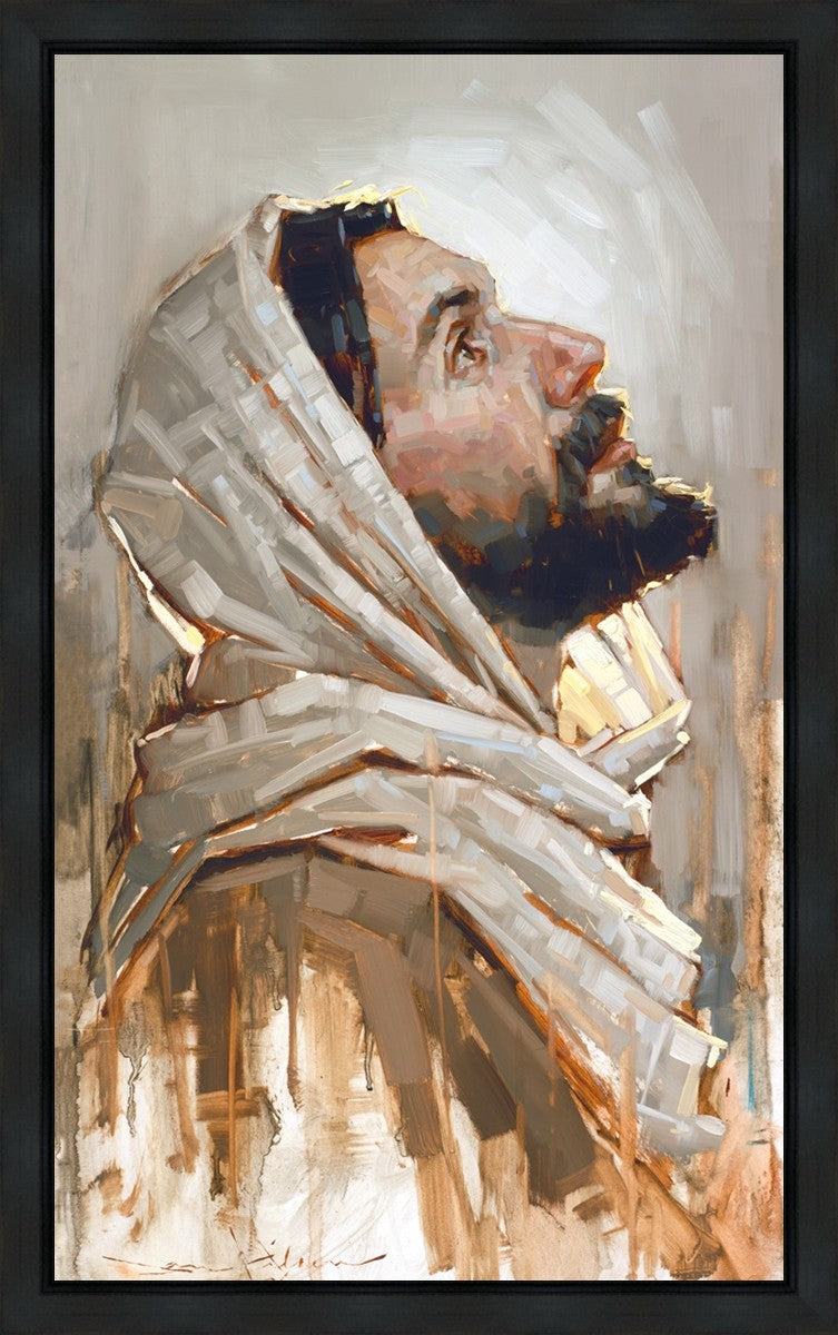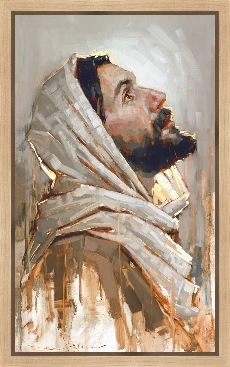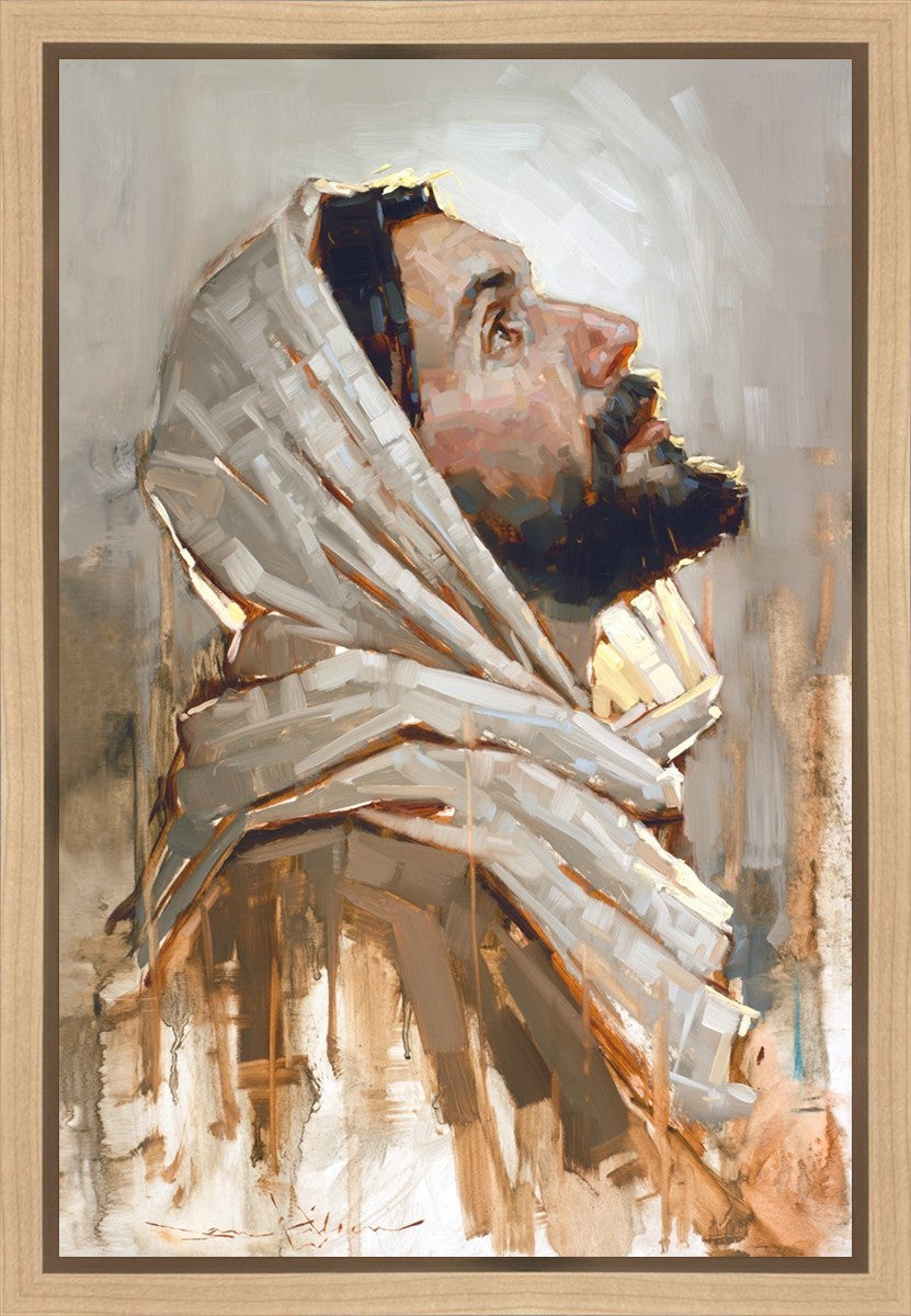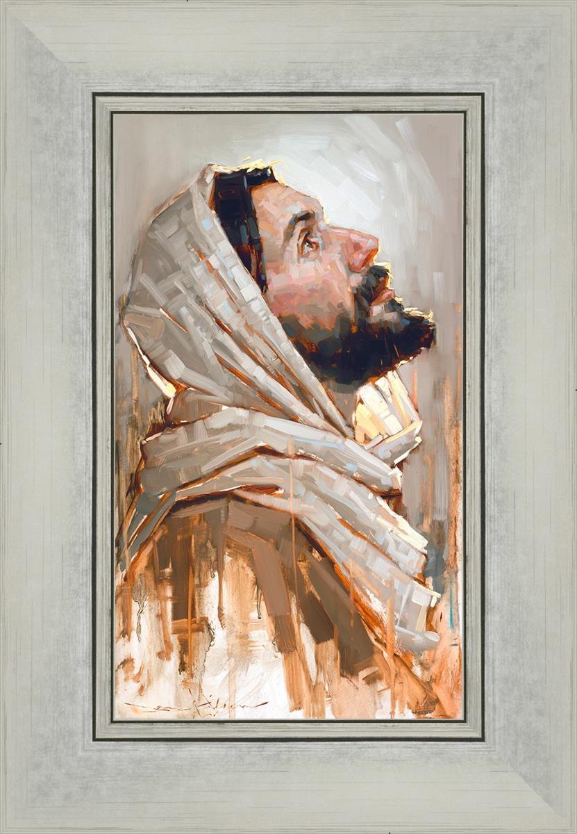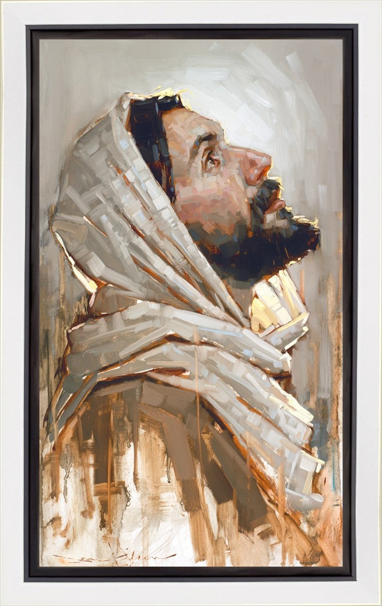 Look to God and Live" painting by Dan Wilson is an inspiring painting depicting Jesus' side profile, gazing upwards toward heaven amidst turbulent waves, symbolizing the importance of turning to God for guidance and salvation. This Christian artwork by Dan Wilson embodies themes of faith, hope, redemption, and the transformative power of turning to Him.