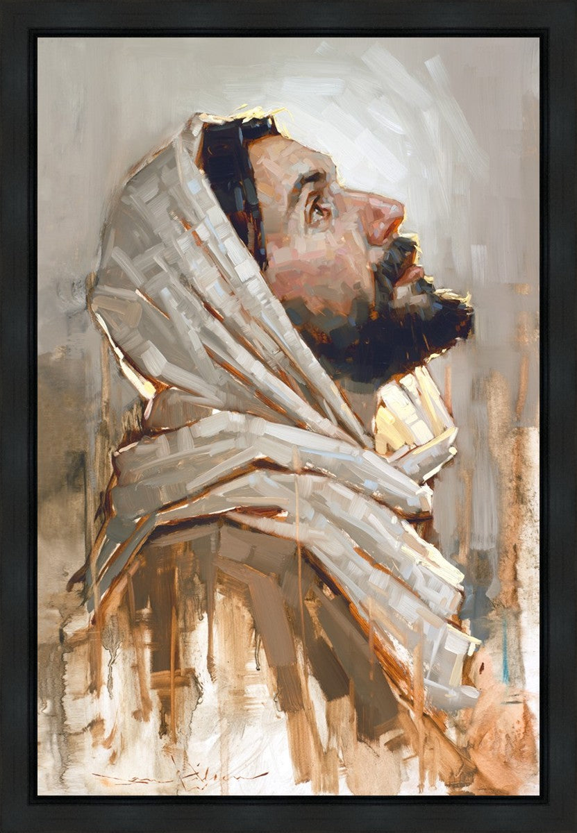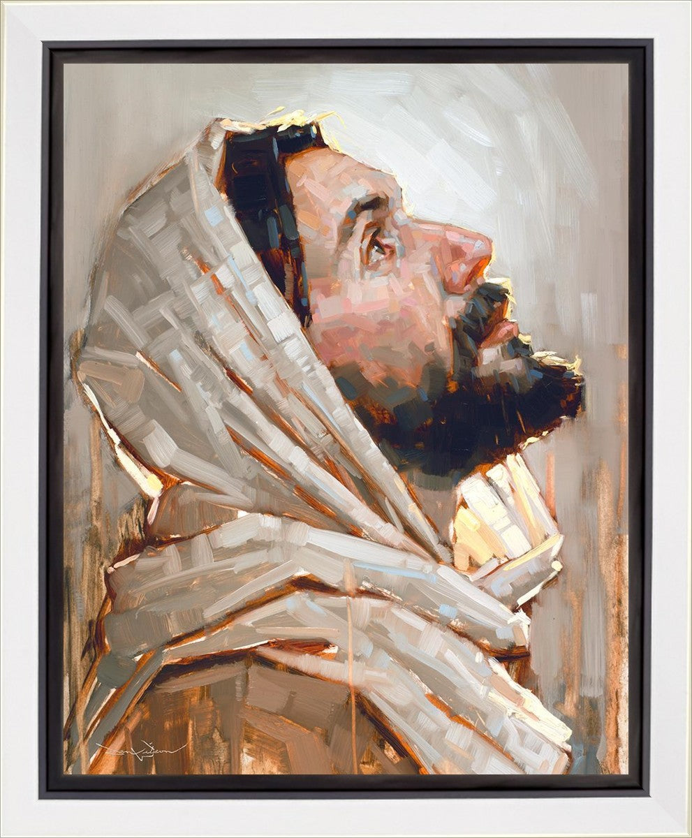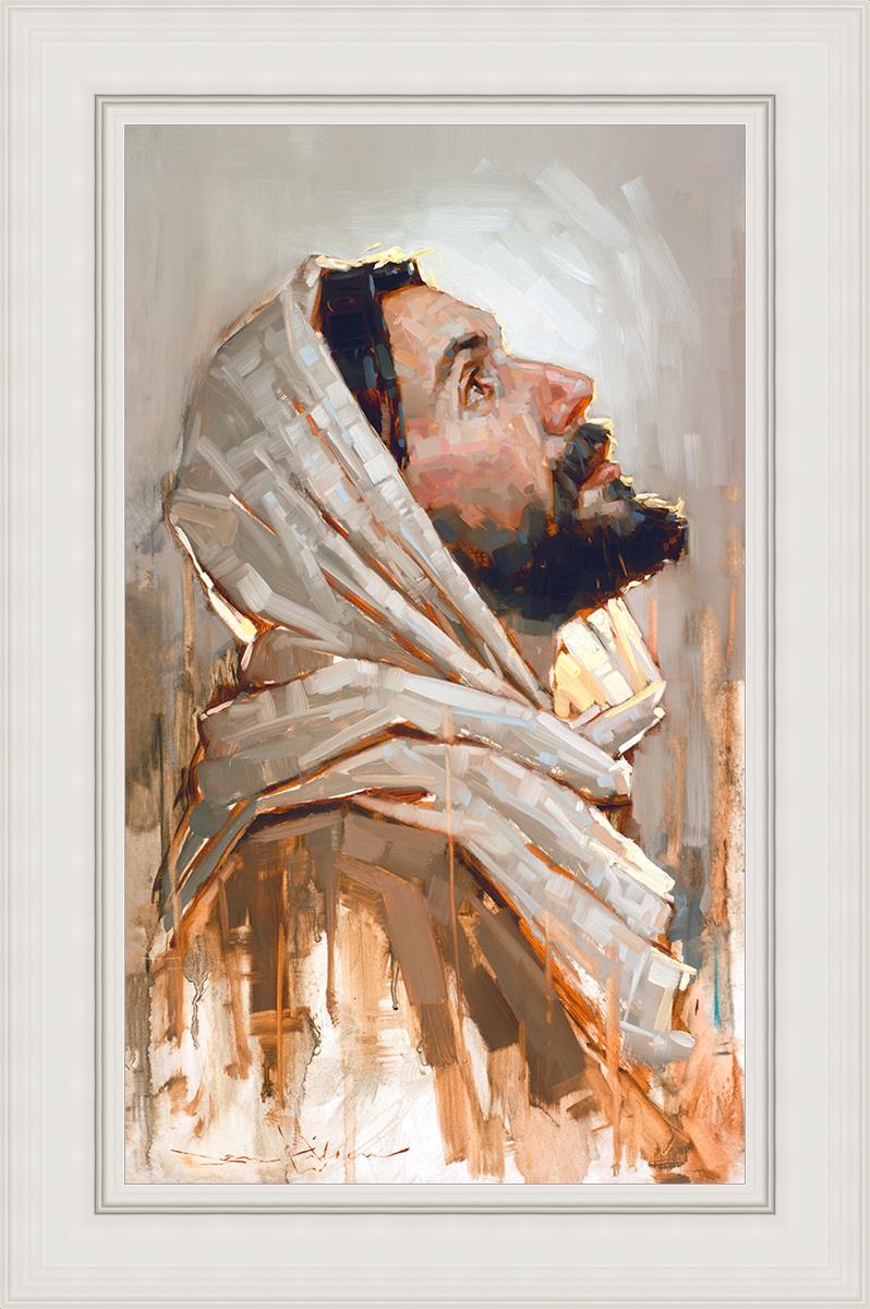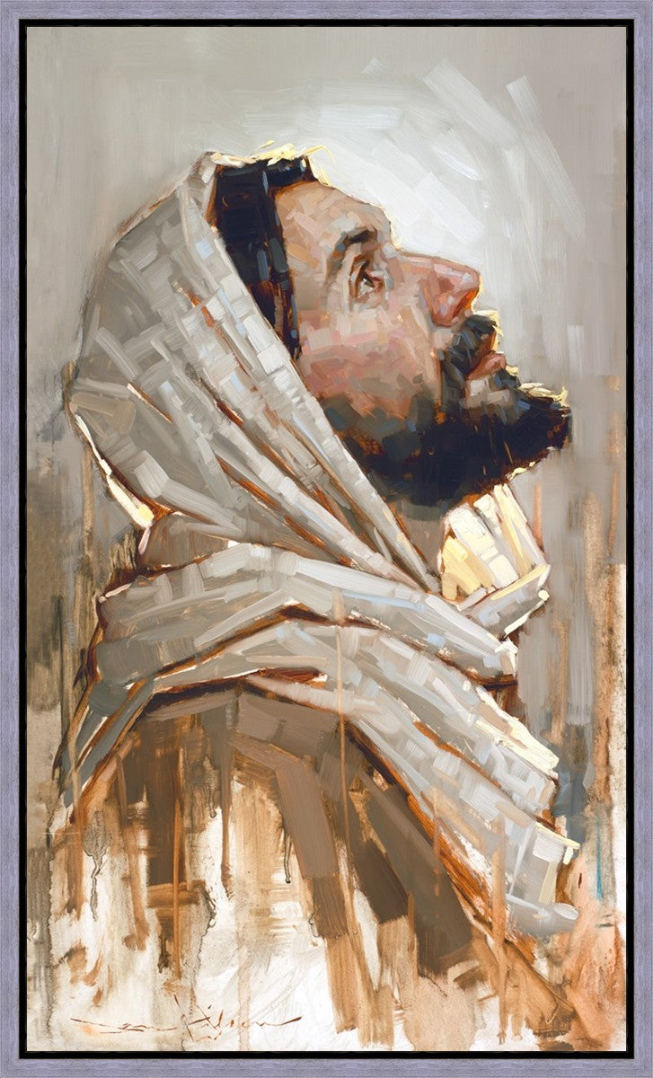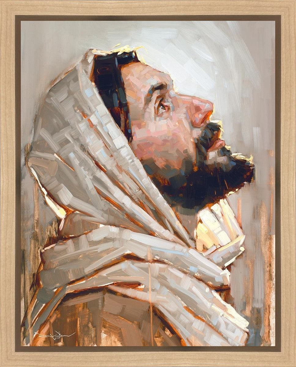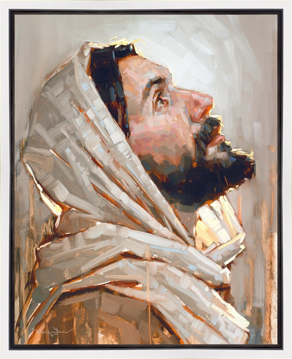 Look to God and Live" painting by Dan Wilson is an inspiring painting depicting Jesus' side profile, gazing upwards toward heaven amidst turbulent waves, symbolizing the importance of turning to God for guidance and salvation. This Christian artwork by Dan Wilson embodies themes of faith, hope, redemption, and the transformative power of turning to Him.