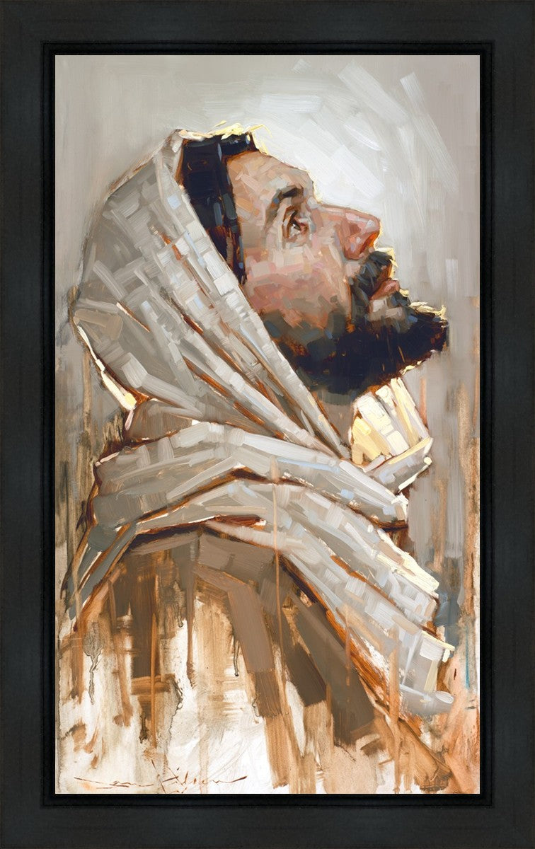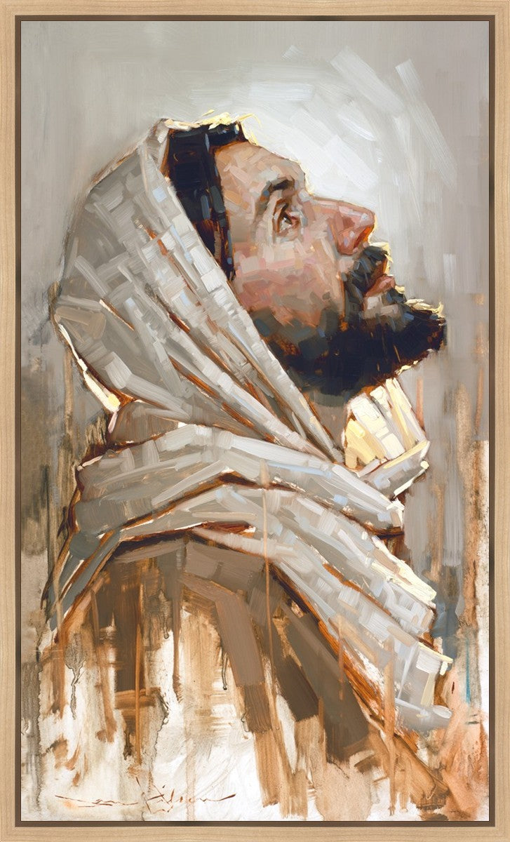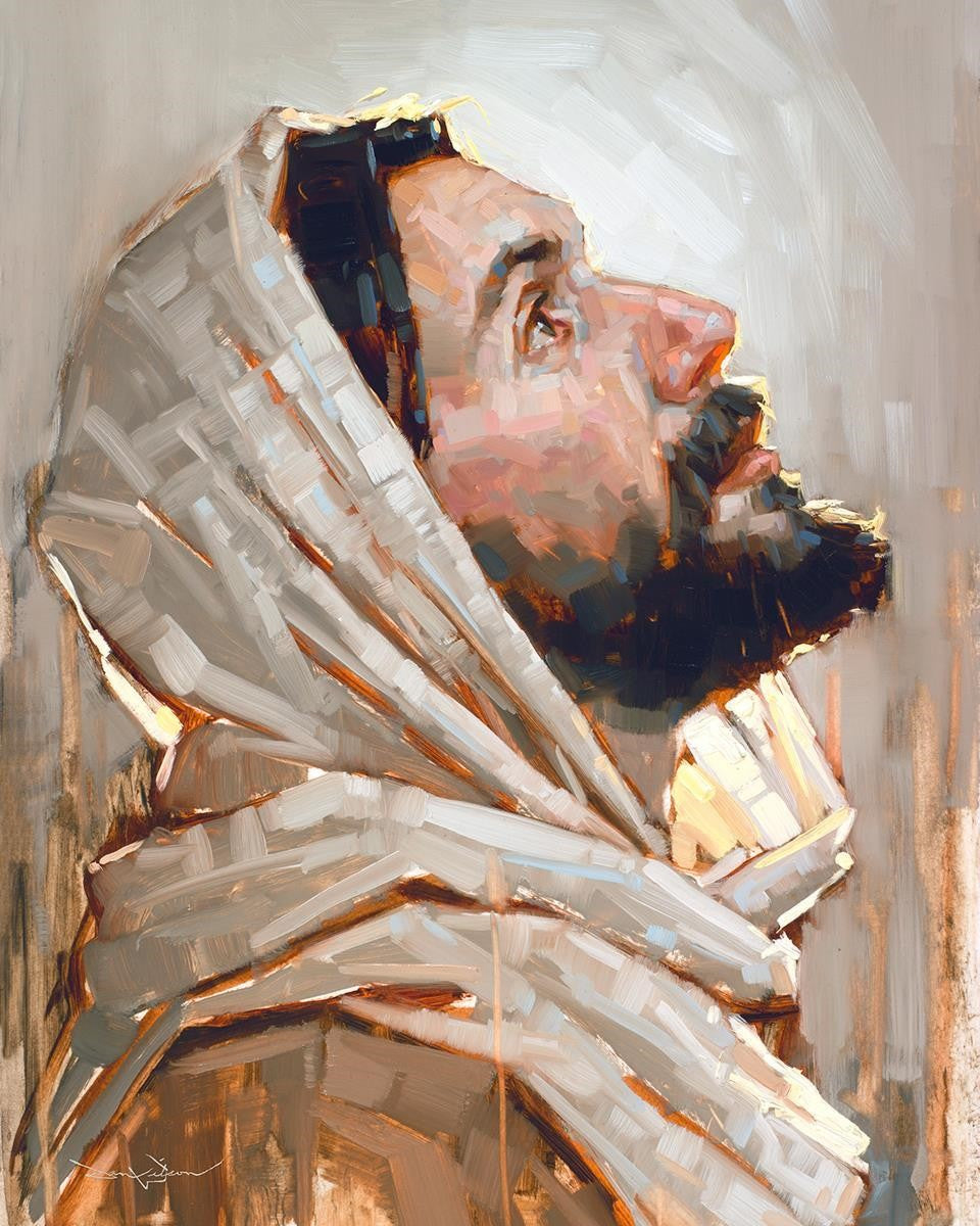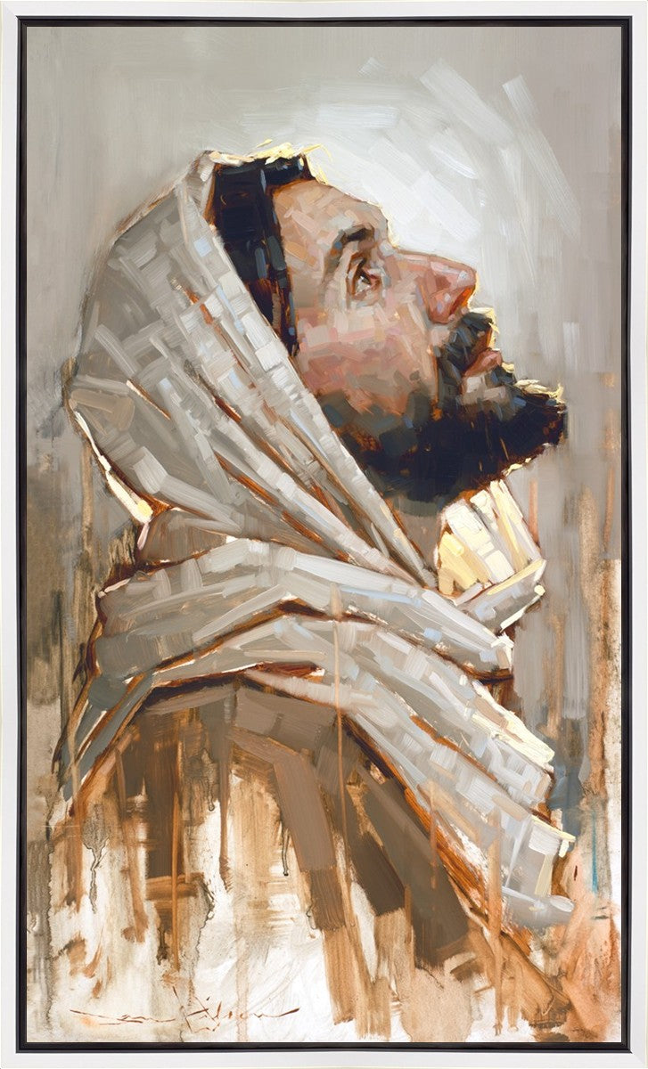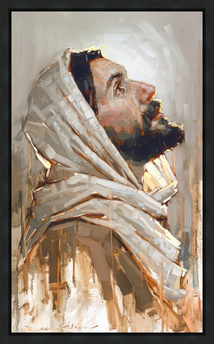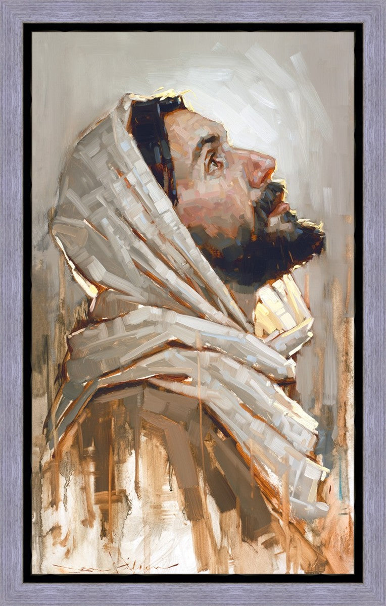 Look to God and Live" painting by Dan Wilson is an inspiring painting depicting Jesus' side profile, gazing upwards toward heaven amidst turbulent waves, symbolizing the importance of turning to God for guidance and salvation. This Christian artwork by Dan Wilson embodies themes of faith, hope, redemption, and the transformative power of turning to Him.