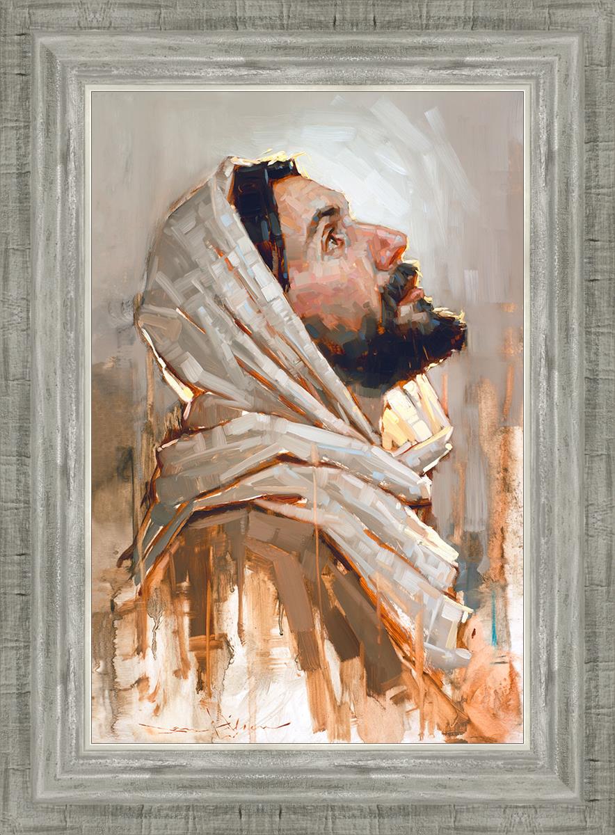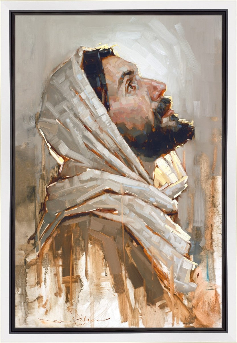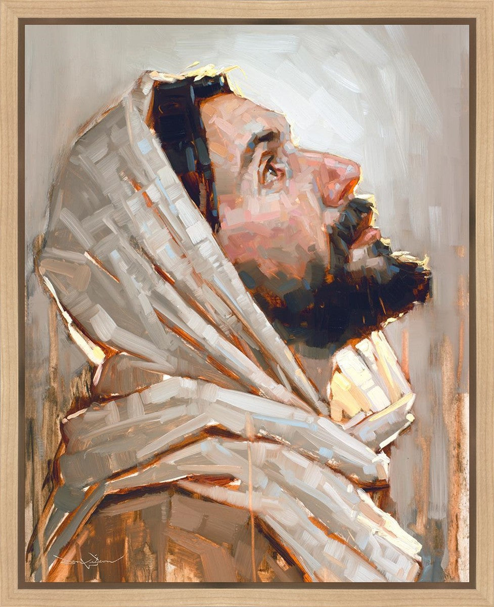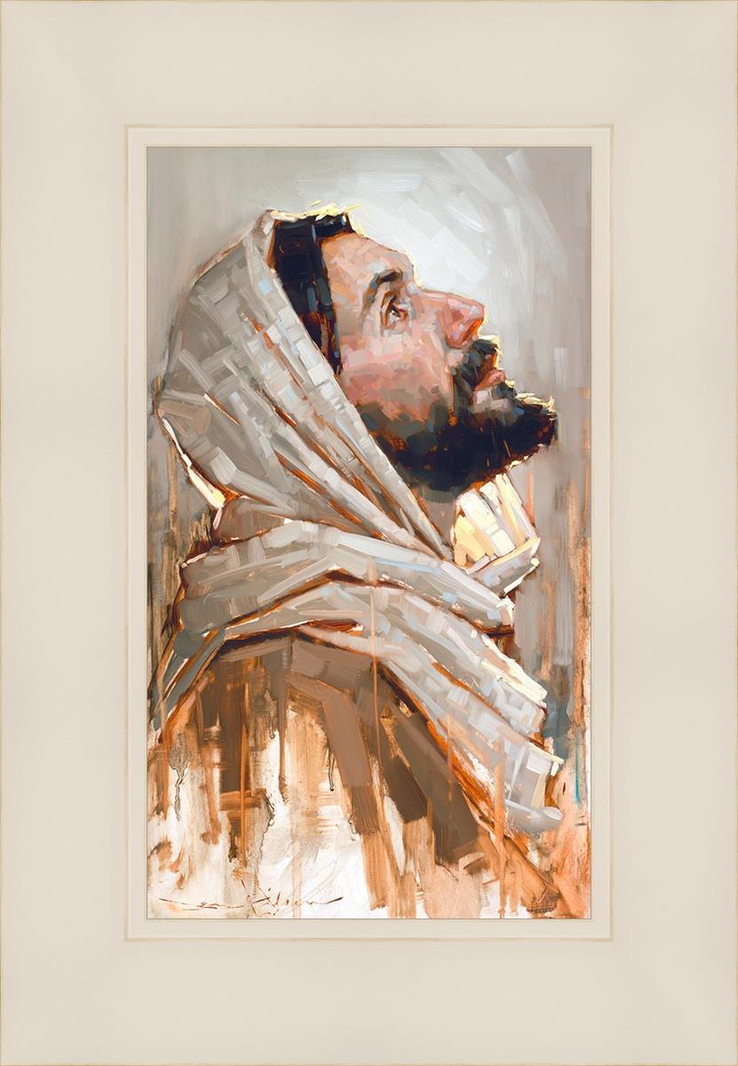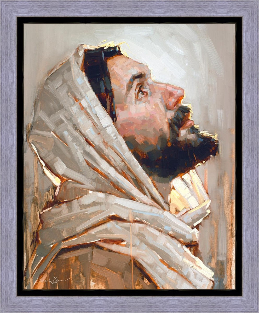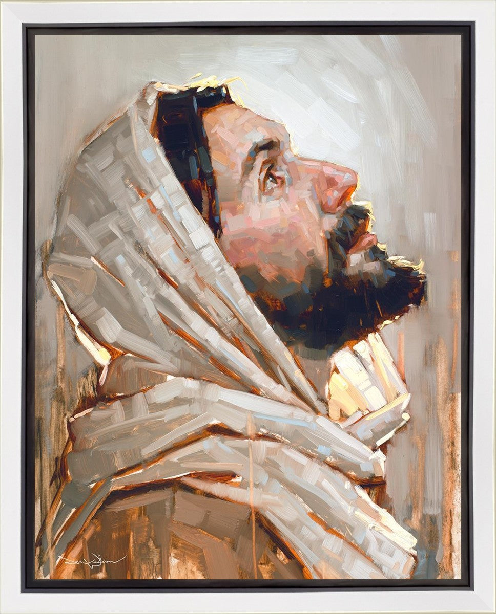 Look to God and Live" painting by Dan Wilson is an inspiring painting depicting Jesus' side profile, gazing upwards toward heaven amidst turbulent waves, symbolizing the importance of turning to God for guidance and salvation. This Christian artwork by Dan Wilson embodies themes of faith, hope, redemption, and the transformative power of turning to Him.