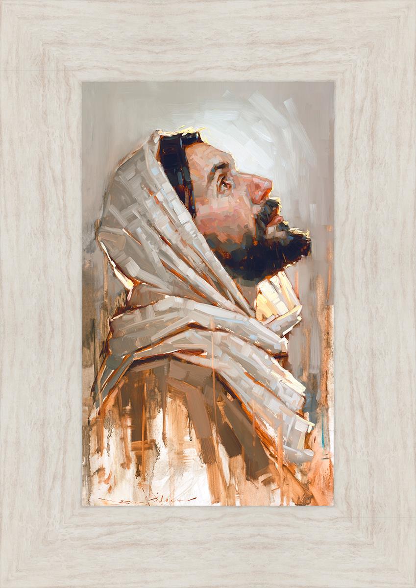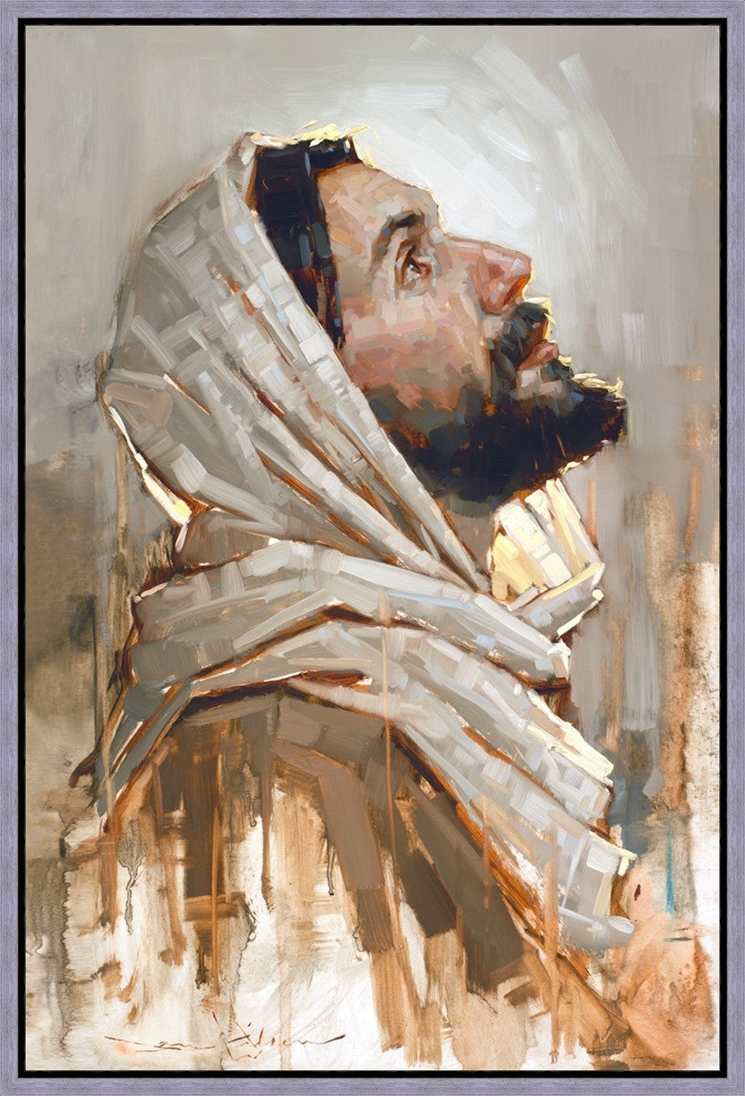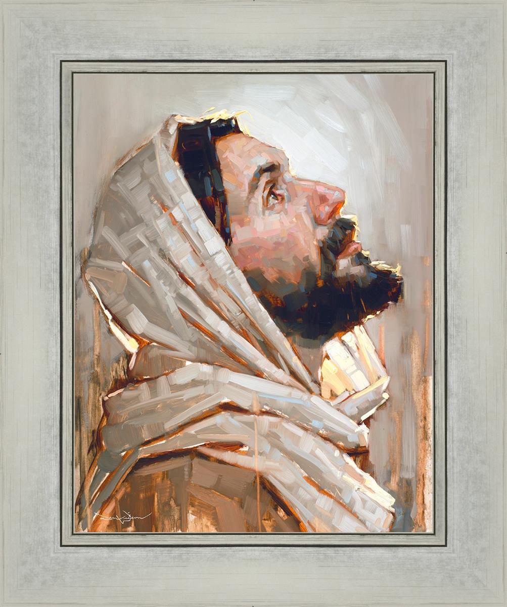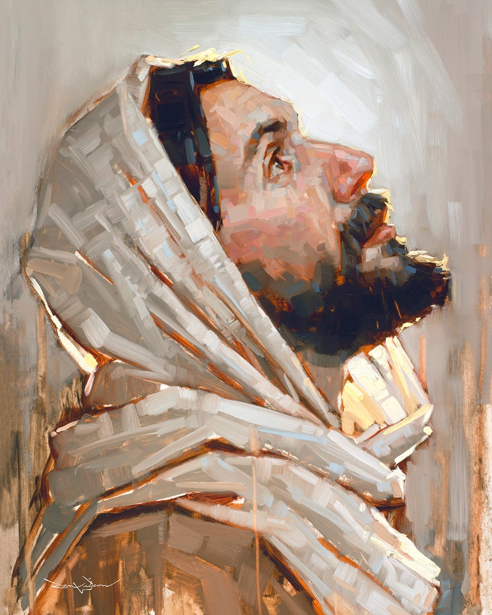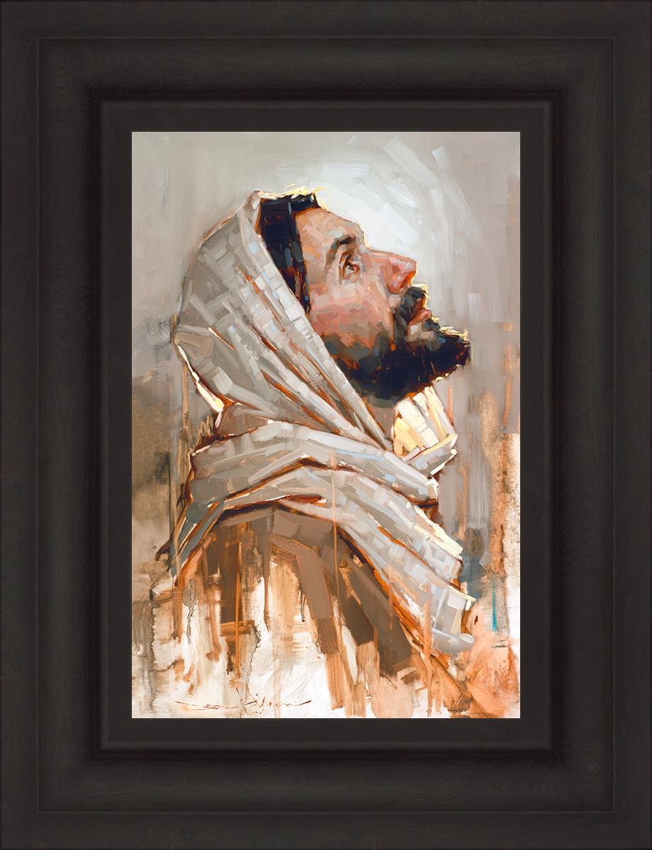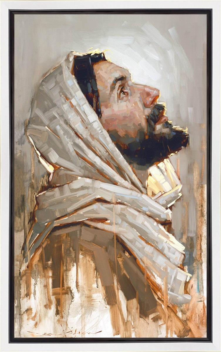 Look to God and Live" painting by Dan Wilson is an inspiring painting depicting Jesus' side profile, gazing upwards toward heaven amidst turbulent waves, symbolizing the importance of turning to God for guidance and salvation. This Christian artwork by Dan Wilson embodies themes of faith, hope, redemption, and the transformative power of turning to Him.