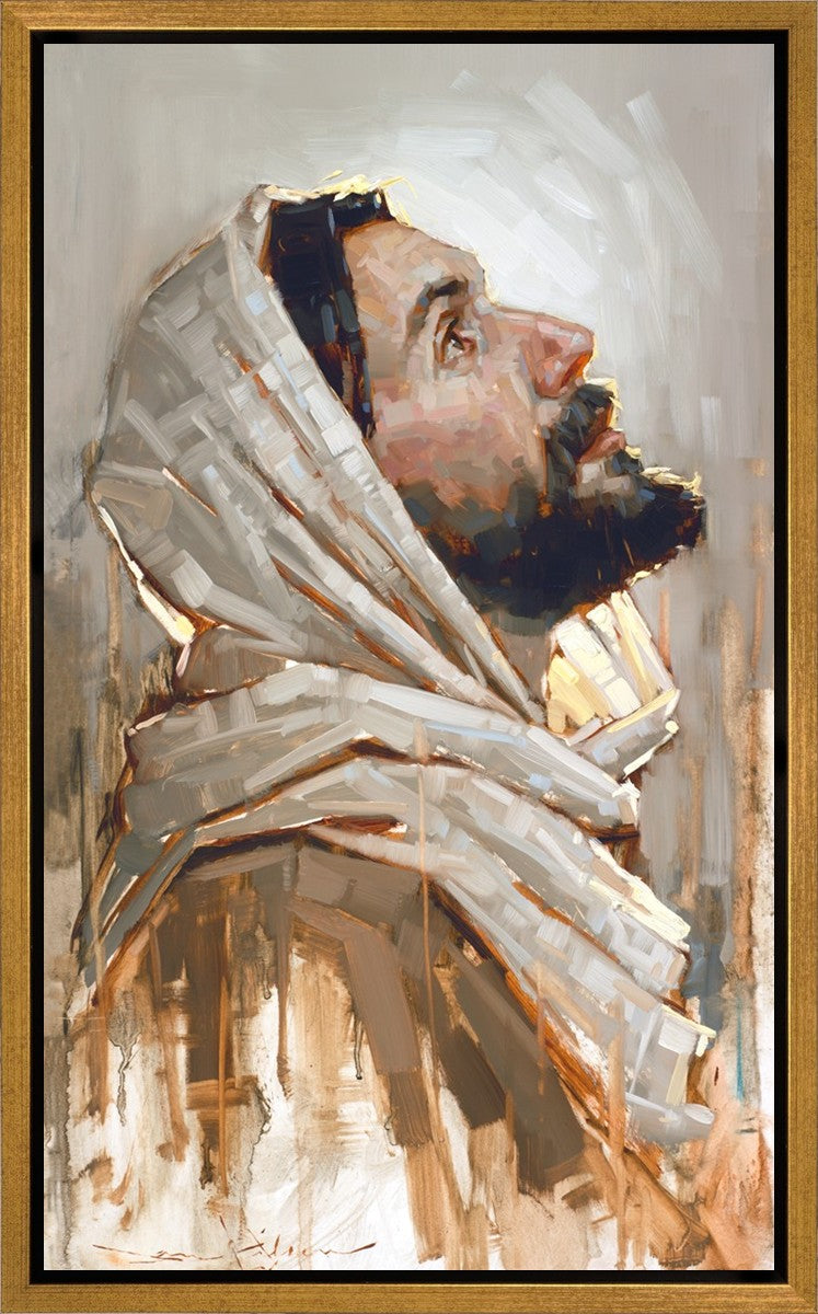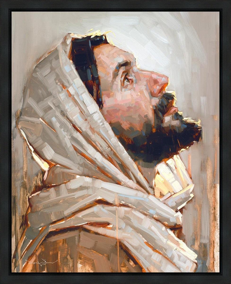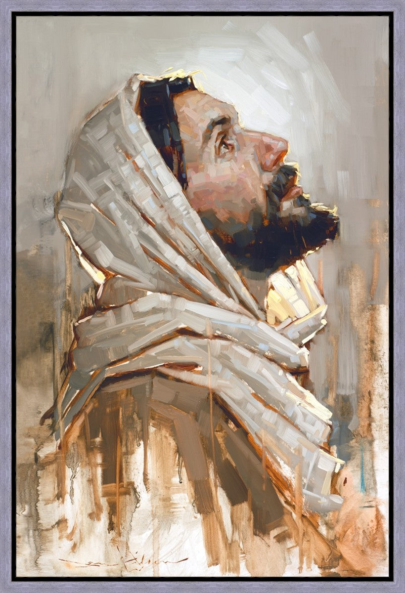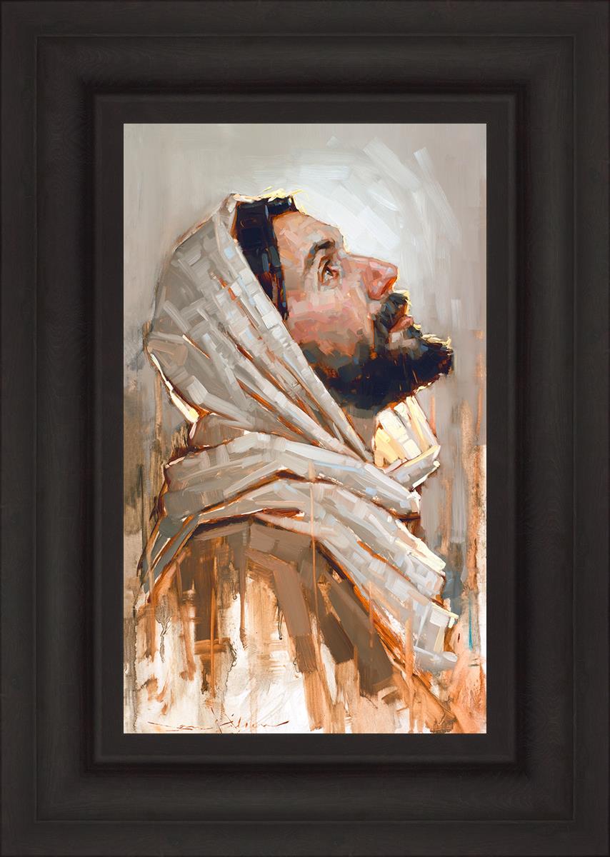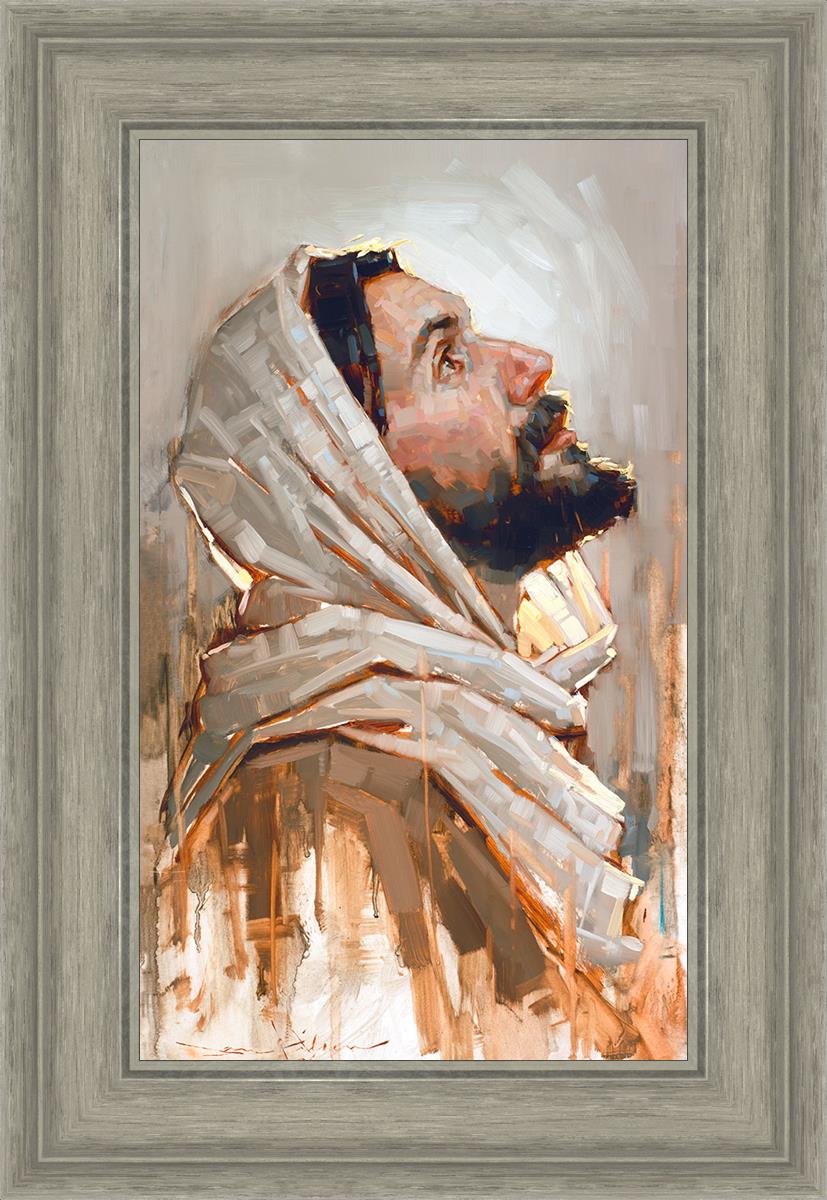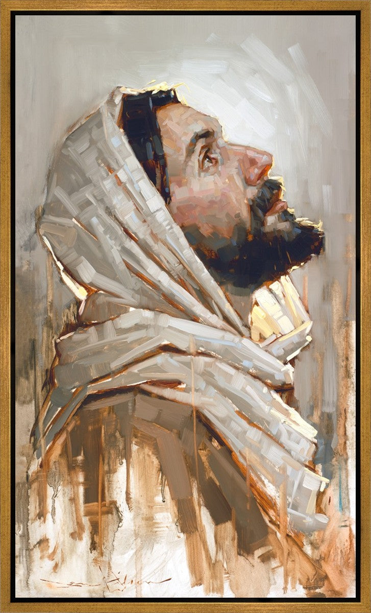 Look to God and Live" painting by Dan Wilson is an inspiring painting depicting Jesus' side profile, gazing upwards toward heaven amidst turbulent waves, symbolizing the importance of turning to God for guidance and salvation. This Christian artwork by Dan Wilson embodies themes of faith, hope, redemption, and the transformative power of turning to Him.