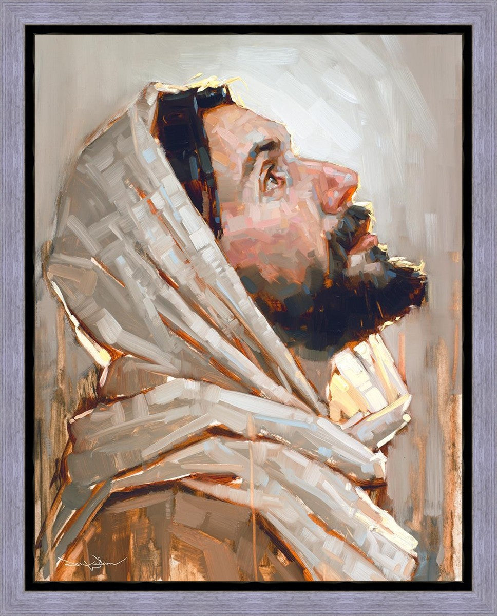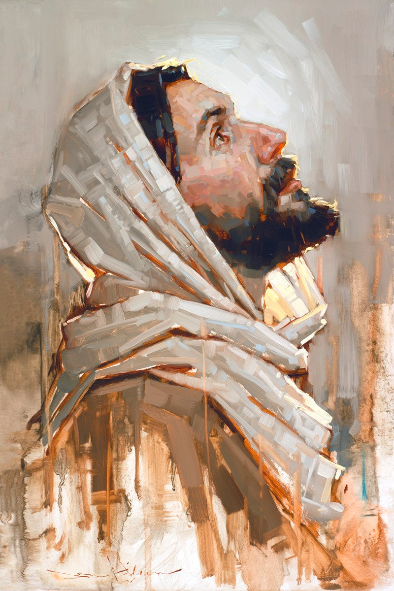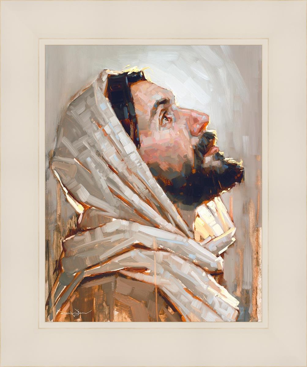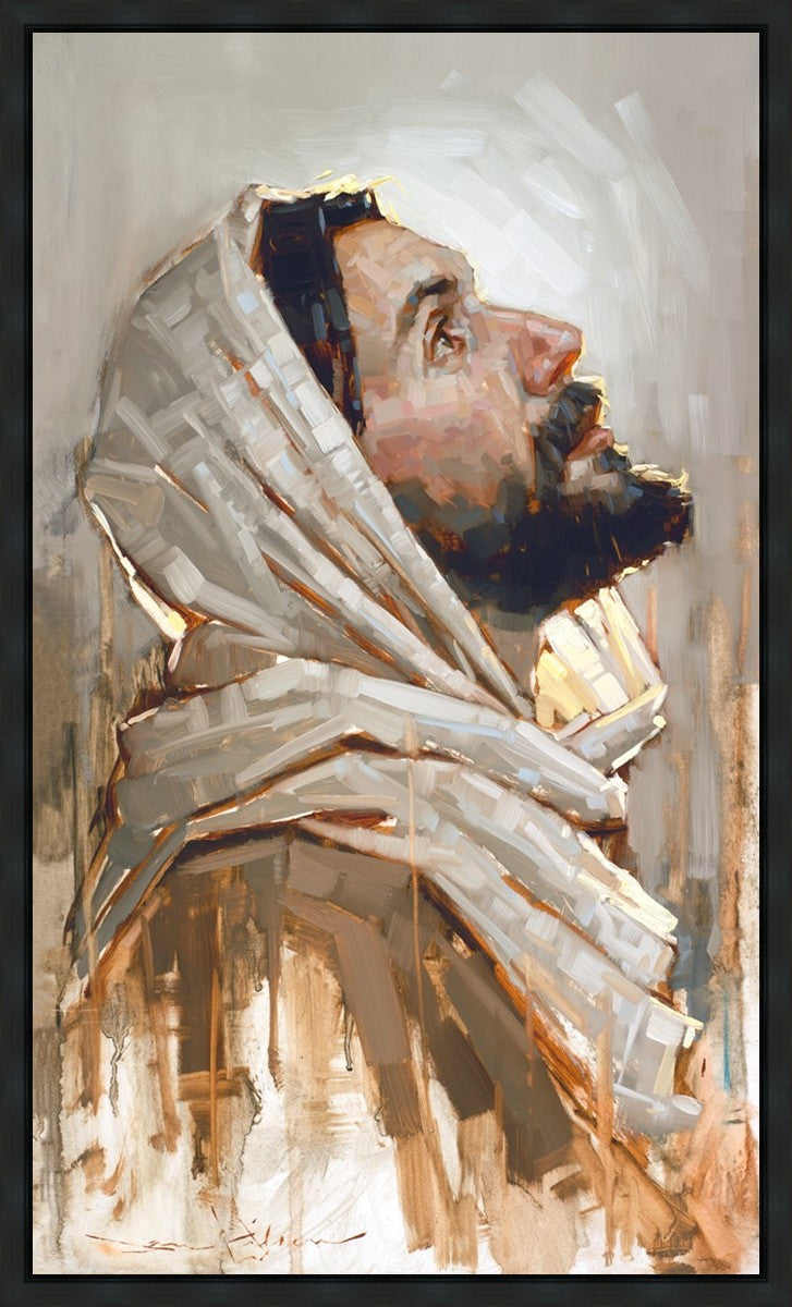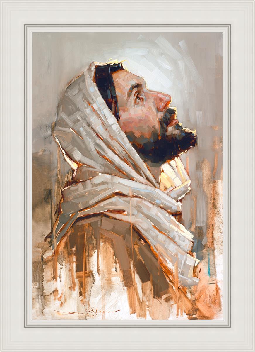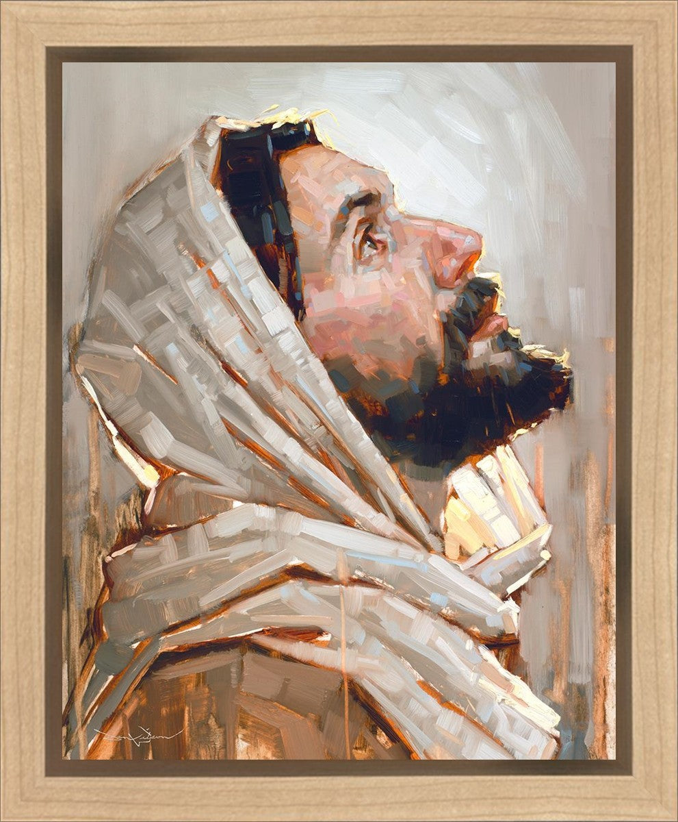 Look to God and Live" painting by Dan Wilson is an inspiring painting depicting Jesus' side profile, gazing upwards toward heaven amidst turbulent waves, symbolizing the importance of turning to God for guidance and salvation. This Christian artwork by Dan Wilson embodies themes of faith, hope, redemption, and the transformative power of turning to Him.