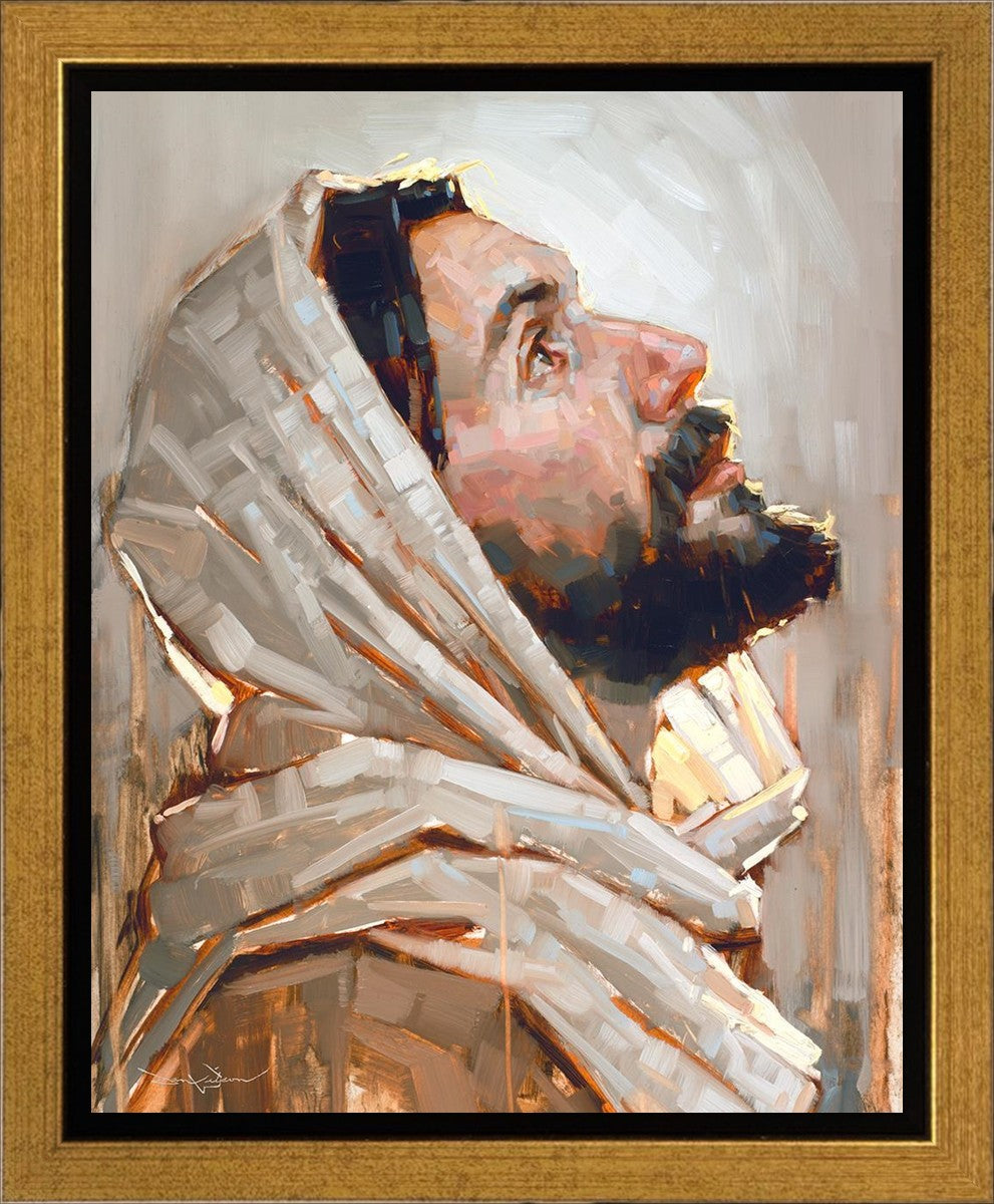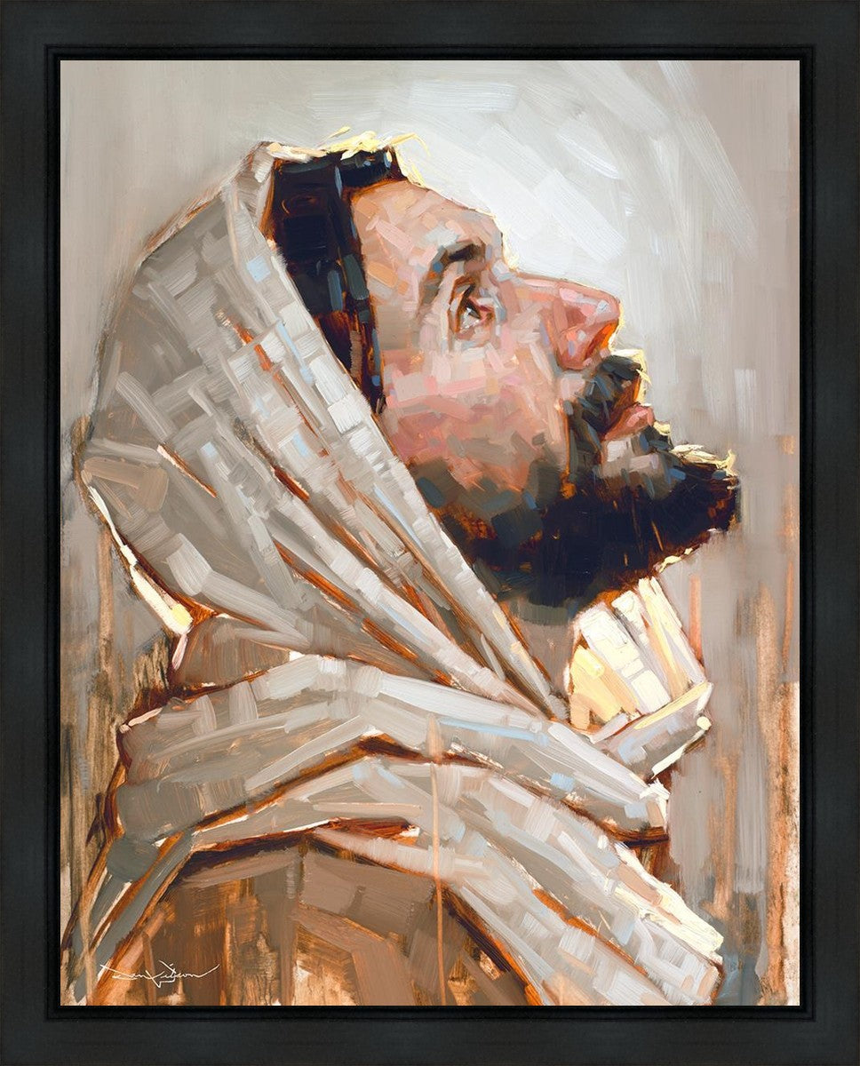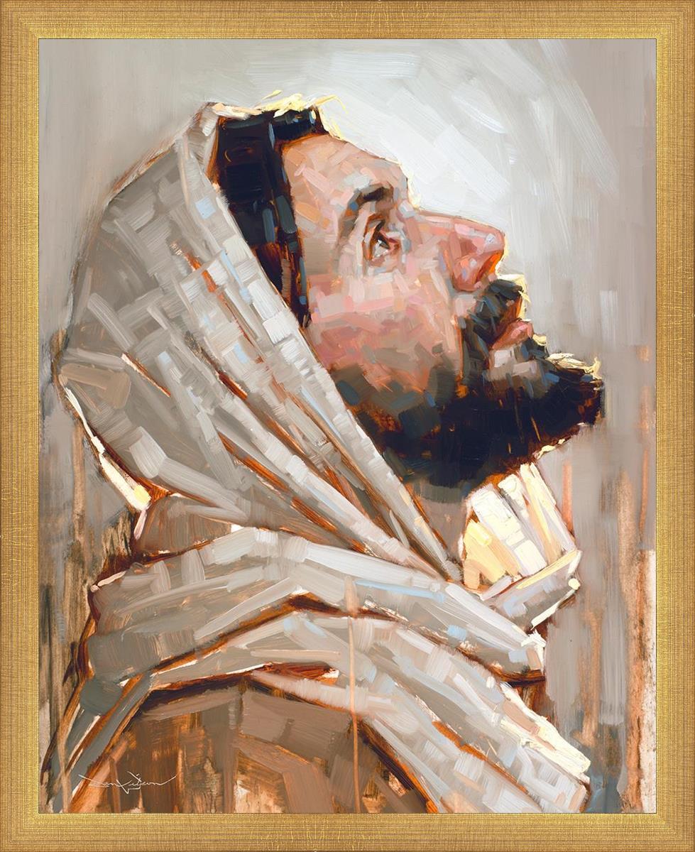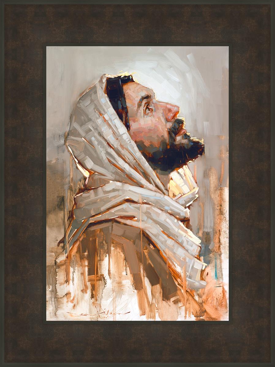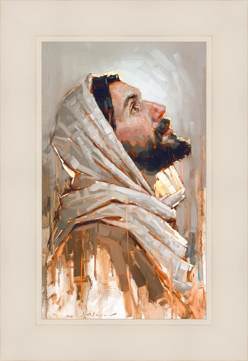 Look to God and Live" painting by Dan Wilson is an inspiring painting depicting Jesus' side profile, gazing upwards toward heaven amidst turbulent waves, symbolizing the importance of turning to God for guidance and salvation. This Christian artwork by Dan Wilson embodies themes of faith, hope, redemption, and the transformative power of turning to Him.