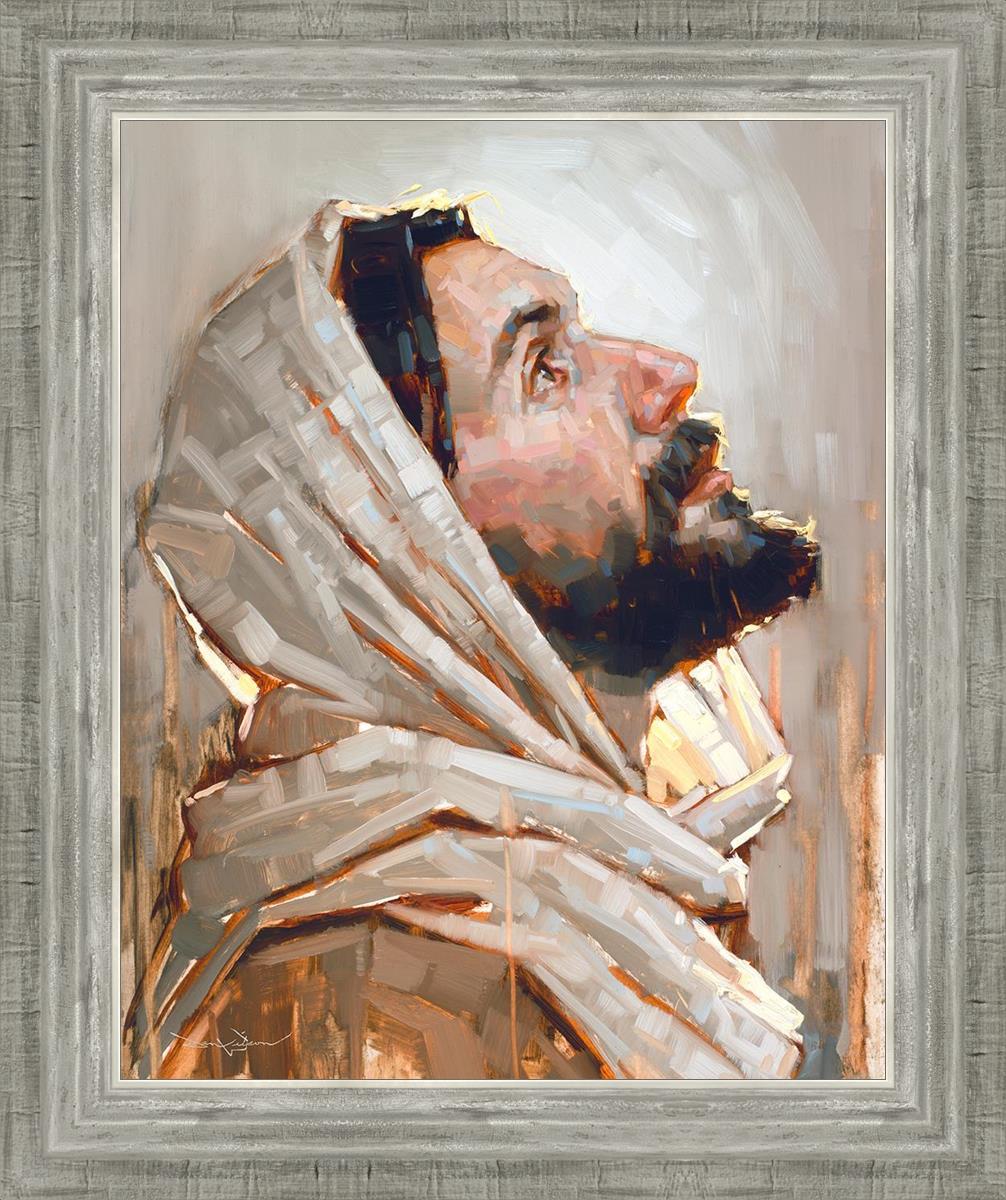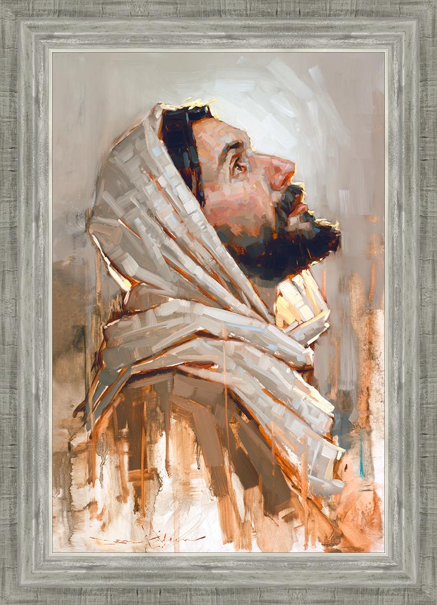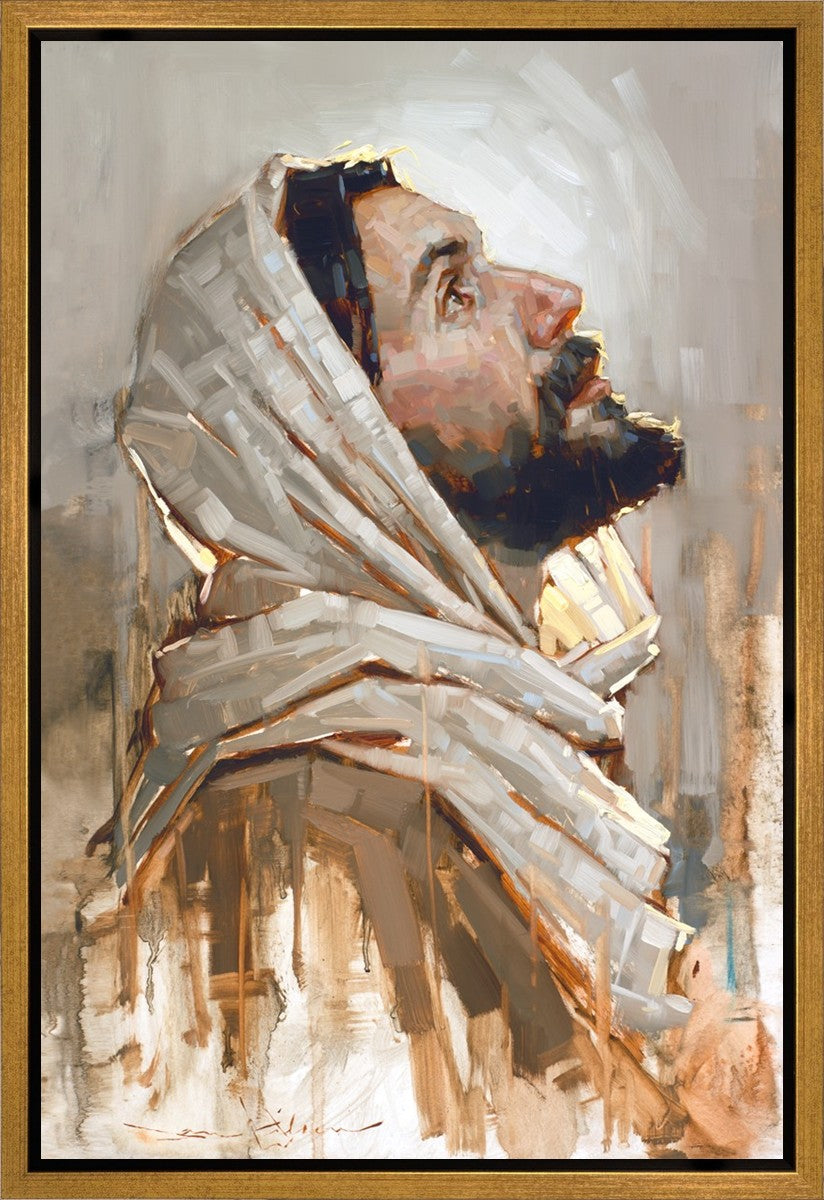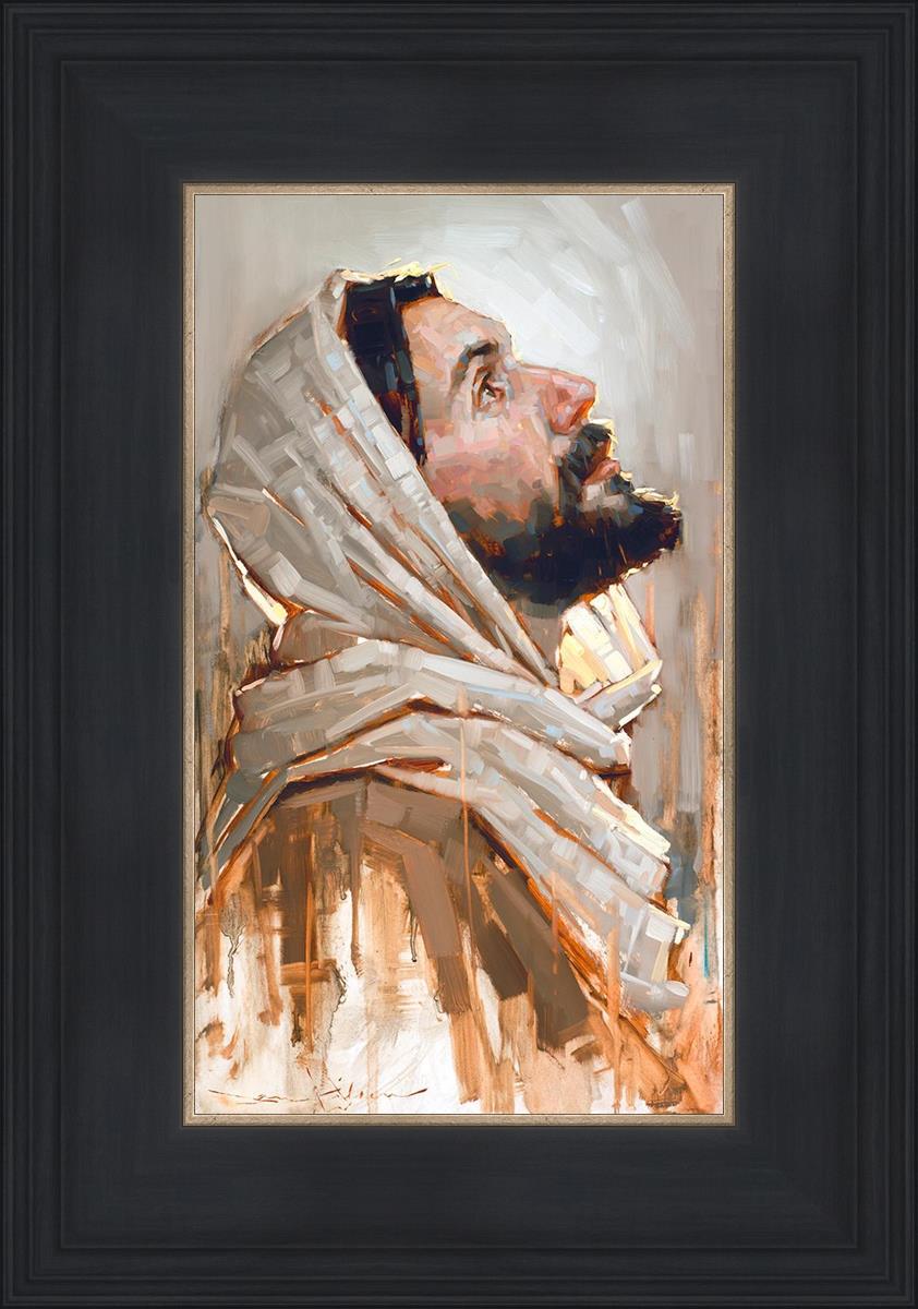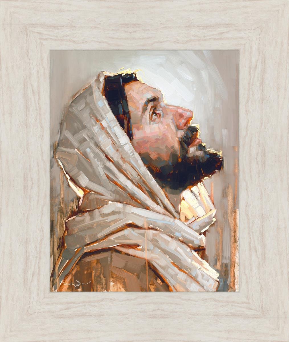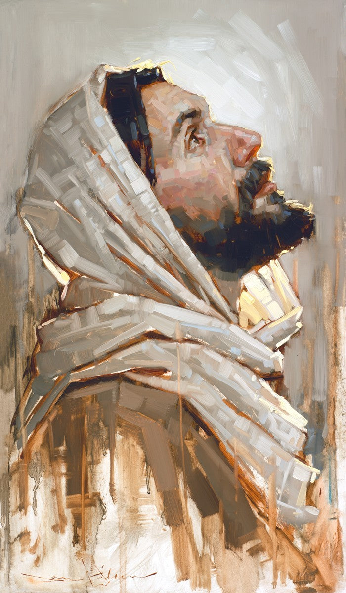 Look to God and Live" painting by Dan Wilson is an inspiring painting depicting Jesus' side profile, gazing upwards toward heaven amidst turbulent waves, symbolizing the importance of turning to God for guidance and salvation. This Christian artwork by Dan Wilson embodies themes of faith, hope, redemption, and the transformative power of turning to Him.