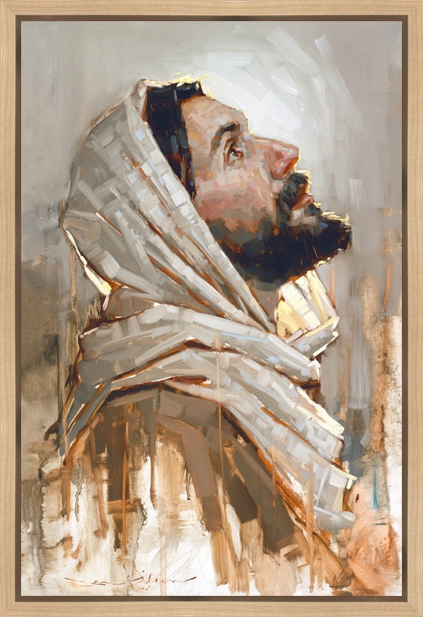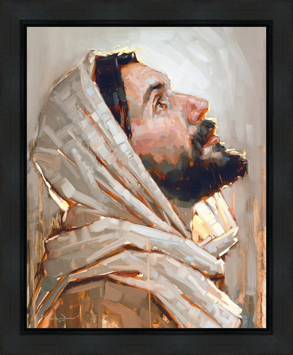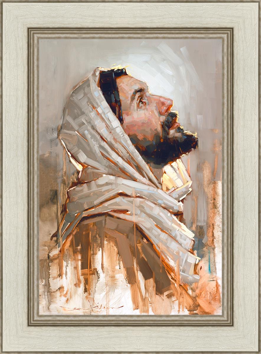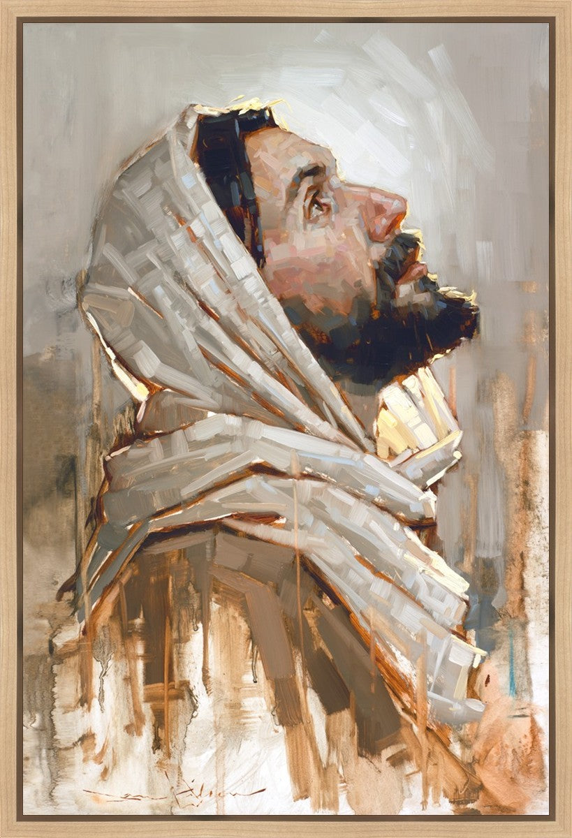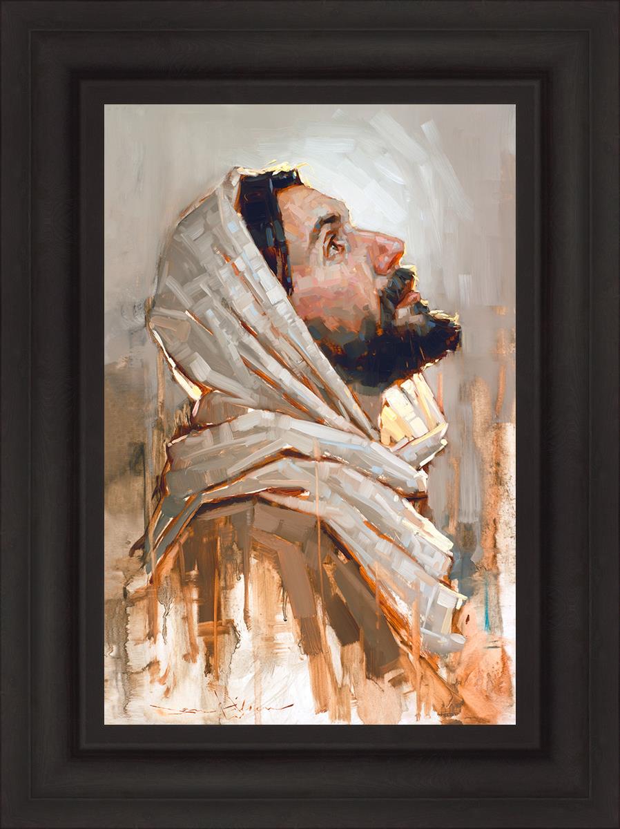 Look to God and Live" painting by Dan Wilson is an inspiring painting depicting Jesus' side profile, gazing upwards toward heaven amidst turbulent waves, symbolizing the importance of turning to God for guidance and salvation. This Christian artwork by Dan Wilson embodies themes of faith, hope, redemption, and the transformative power of turning to Him.