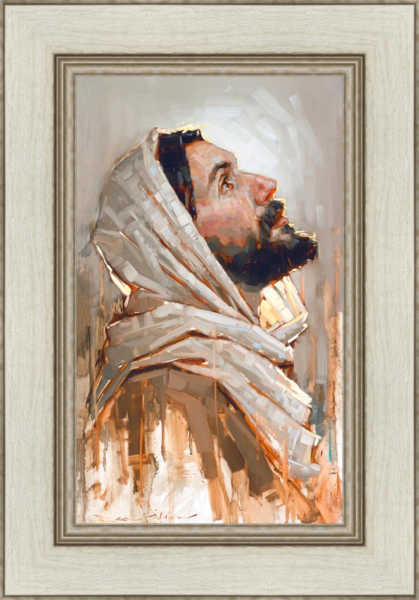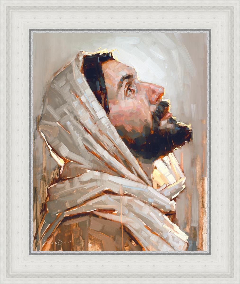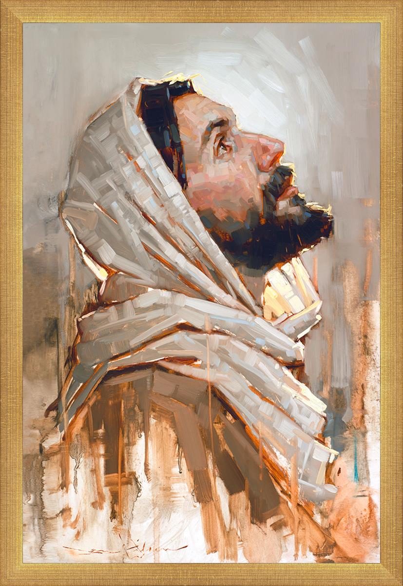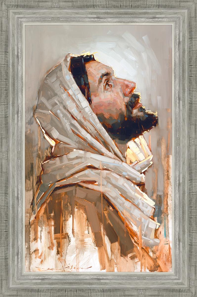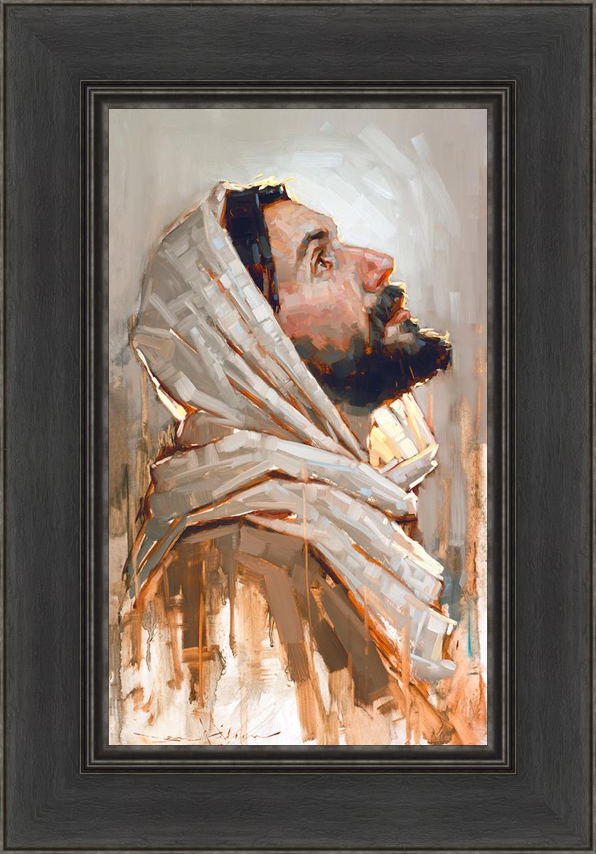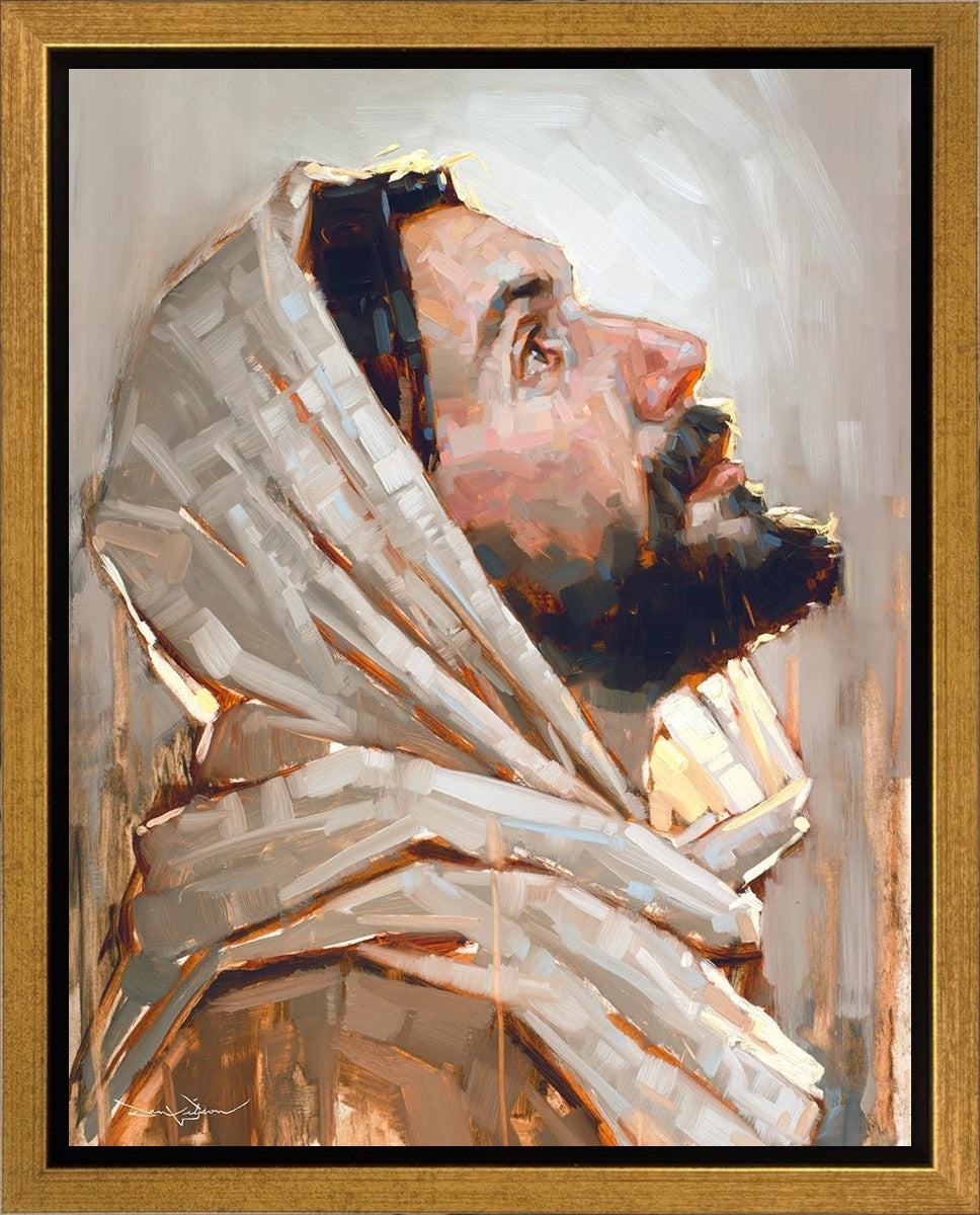Look to God and Live" painting by Dan Wilson is an inspiring painting depicting Jesus' side profile, gazing upwards toward heaven amidst turbulent waves, symbolizing the importance of turning to God for guidance and salvation. This Christian artwork by Dan Wilson embodies themes of faith, hope, redemption, and the transformative power of turning to Him.