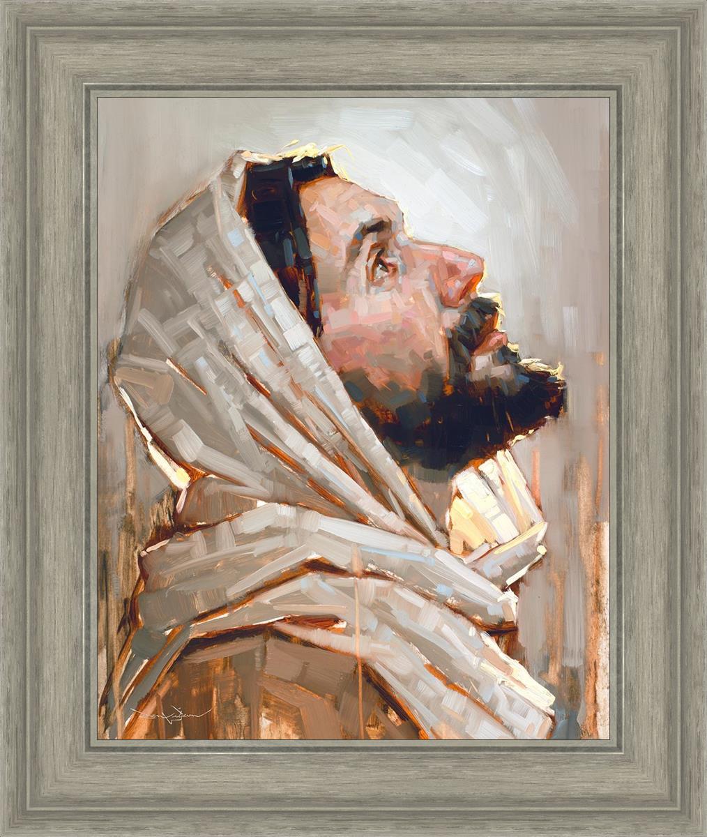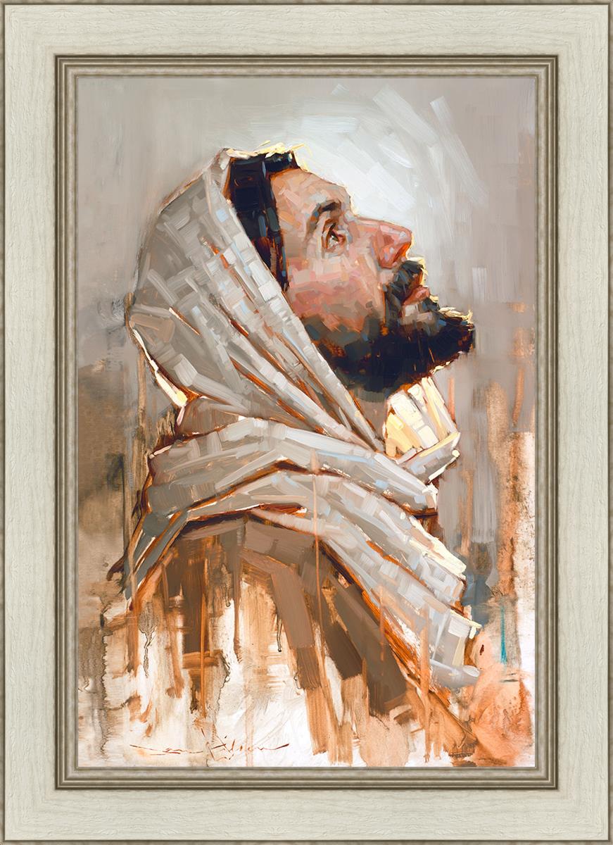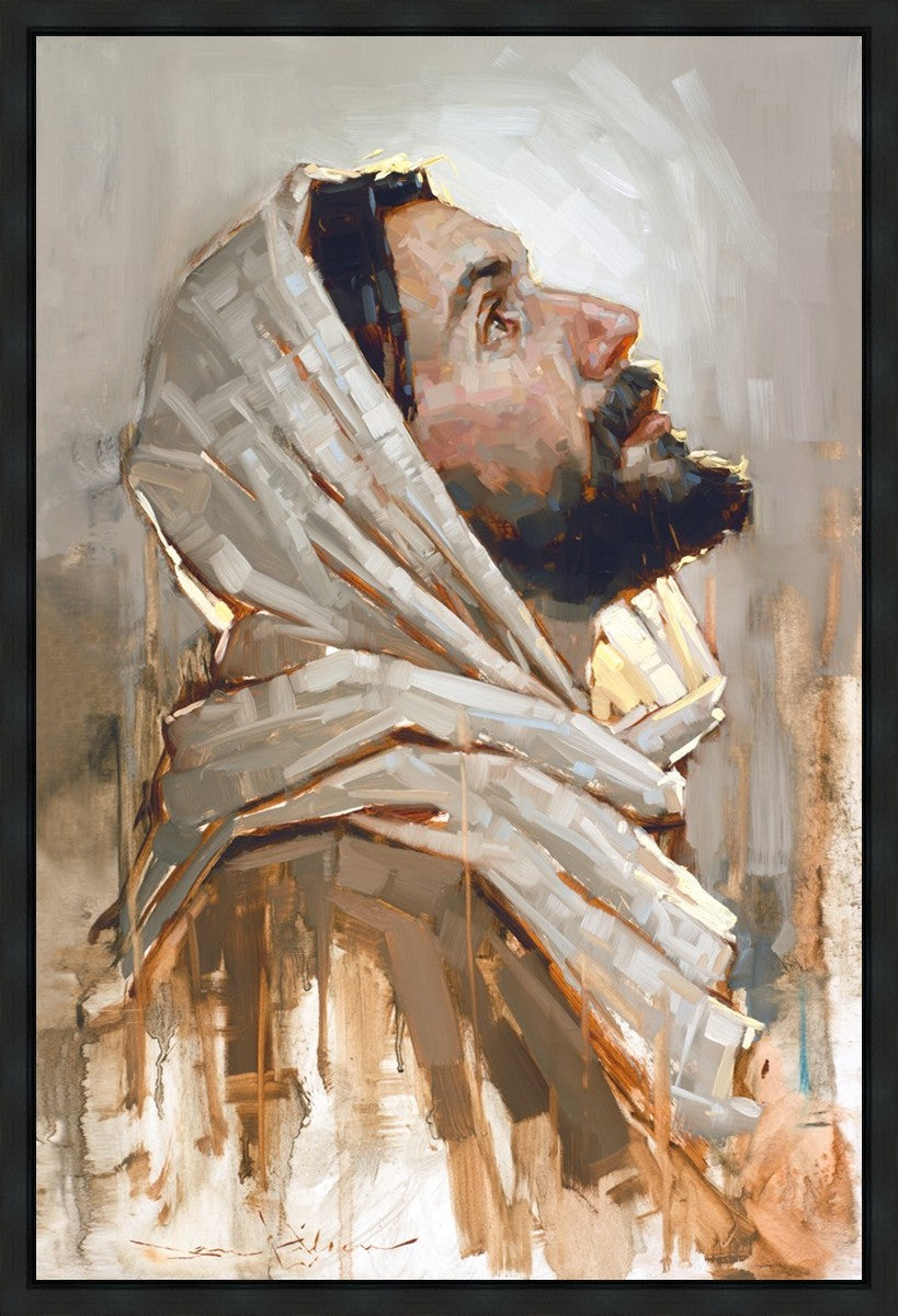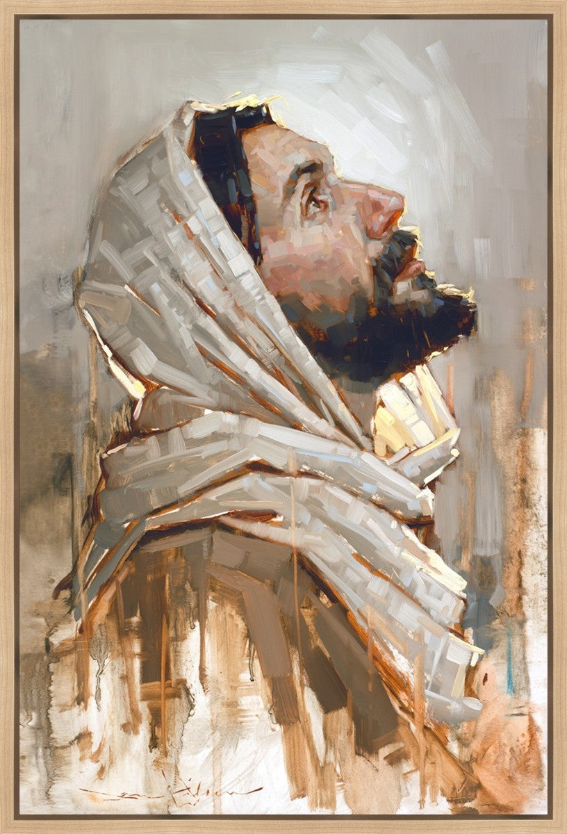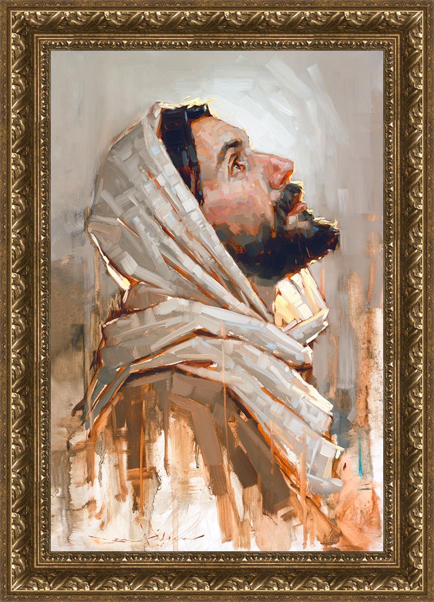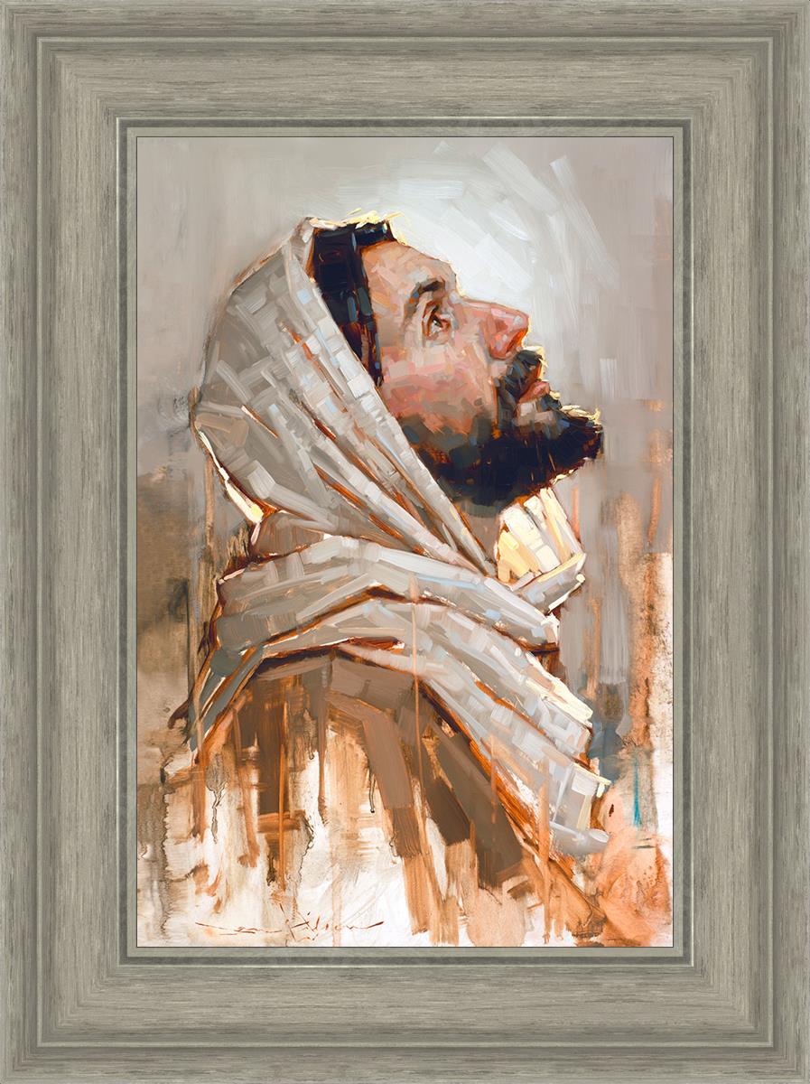 Look to God and Live" painting by Dan Wilson is an inspiring painting depicting Jesus' side profile, gazing upwards toward heaven amidst turbulent waves, symbolizing the importance of turning to God for guidance and salvation. This Christian artwork by Dan Wilson embodies themes of faith, hope, redemption, and the transformative power of turning to Him.