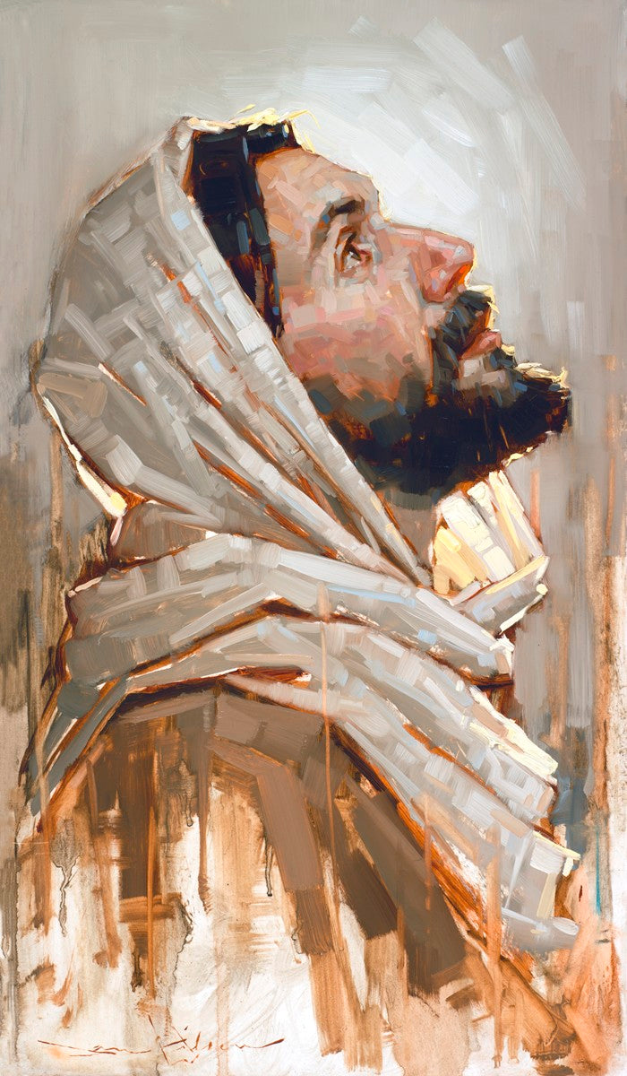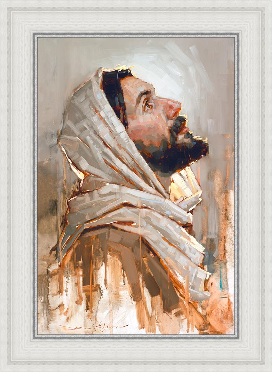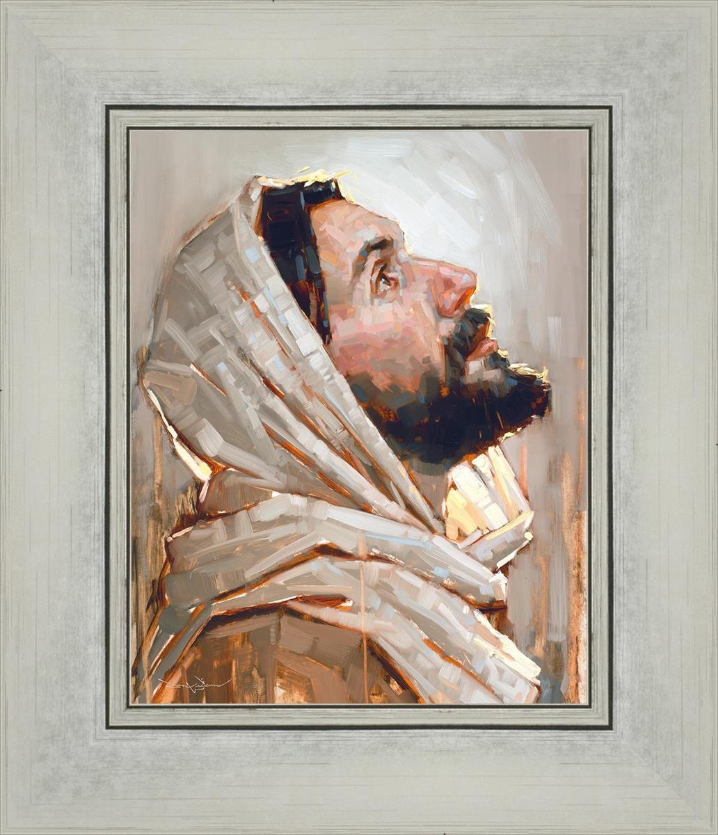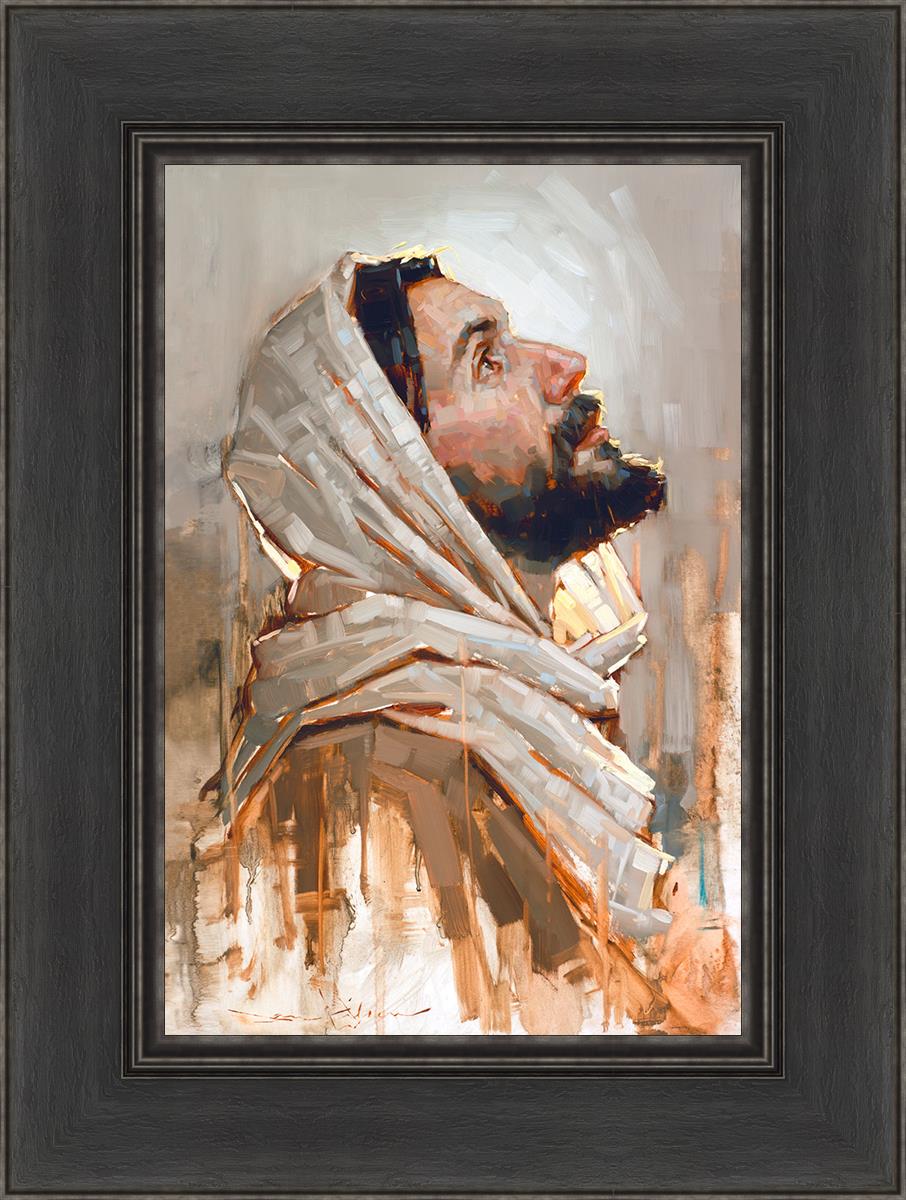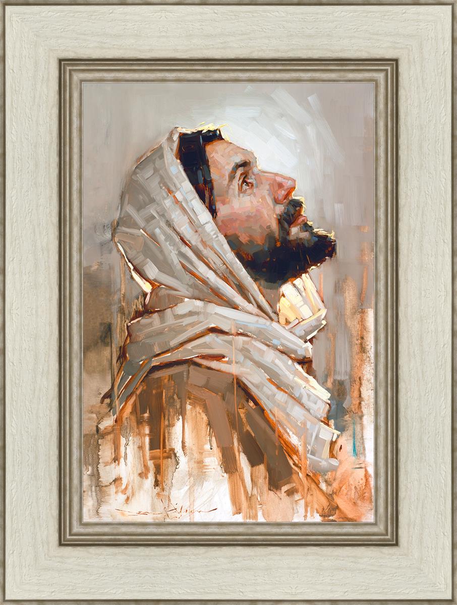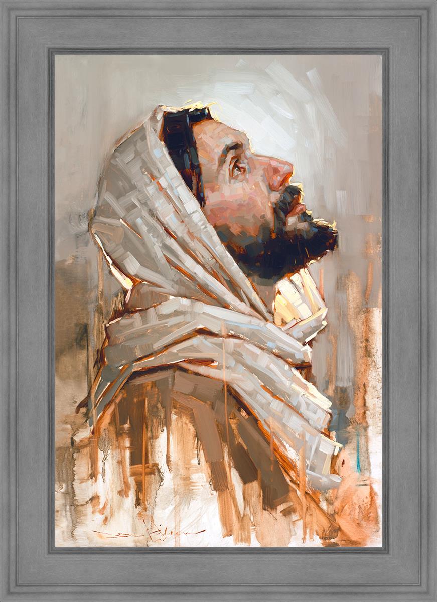 Look to God and Live" painting by Dan Wilson is an inspiring painting depicting Jesus' side profile, gazing upwards toward heaven amidst turbulent waves, symbolizing the importance of turning to God for guidance and salvation. This Christian artwork by Dan Wilson embodies themes of faith, hope, redemption, and the transformative power of turning to Him.