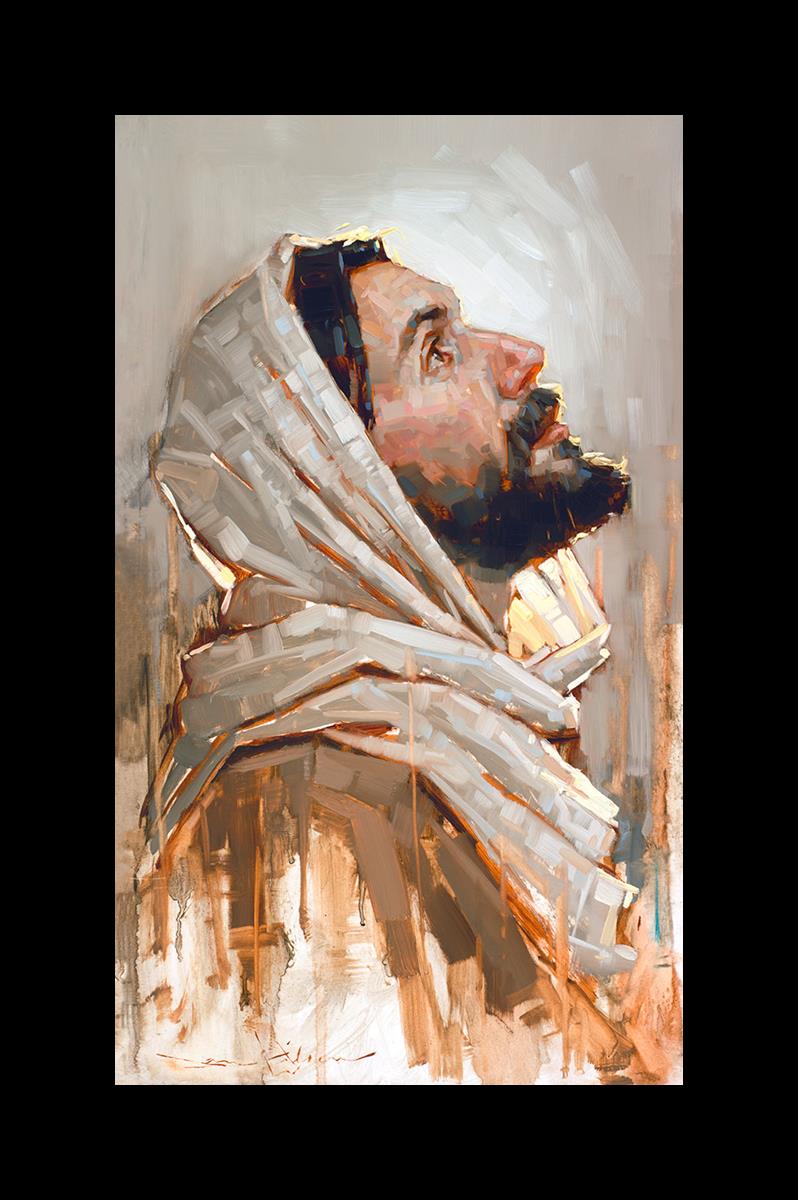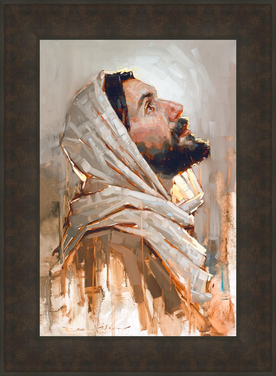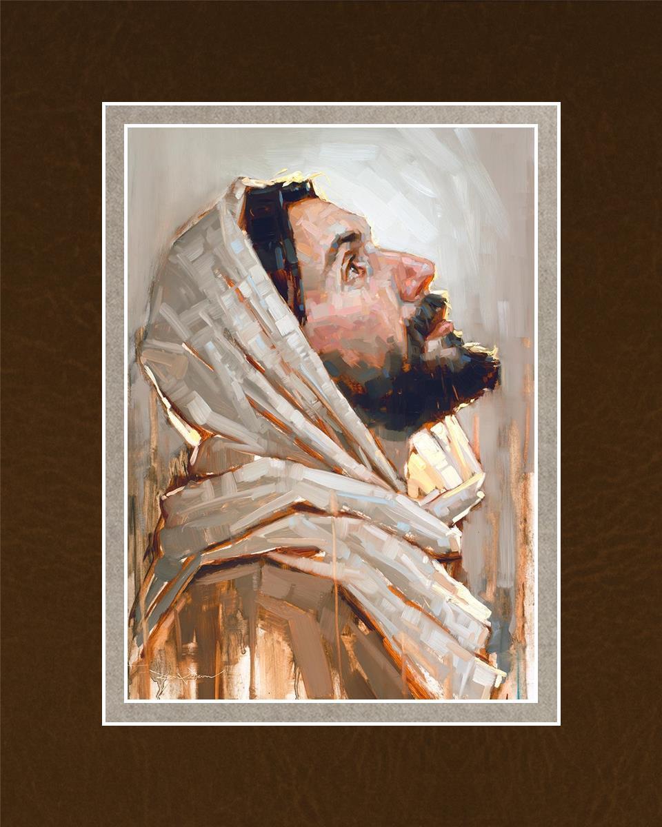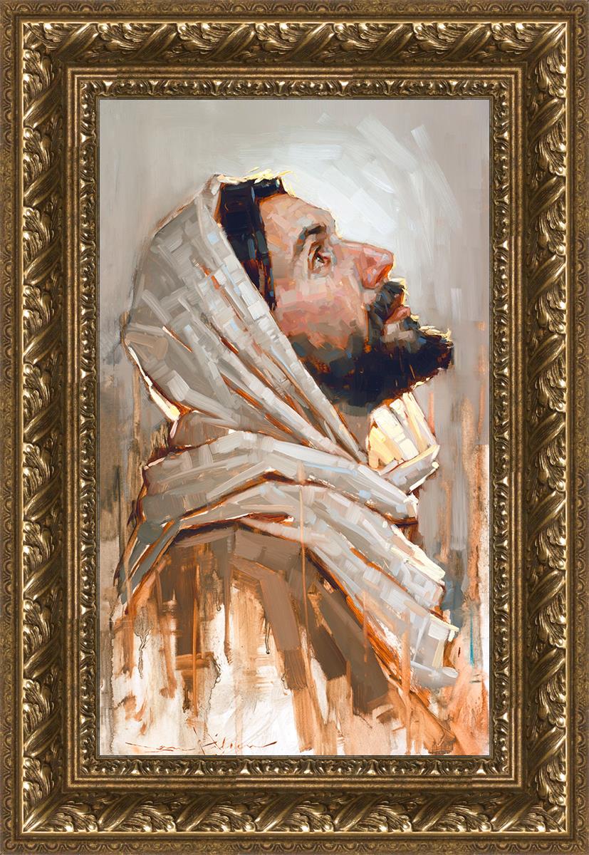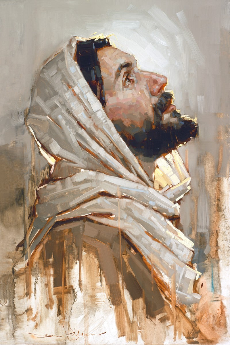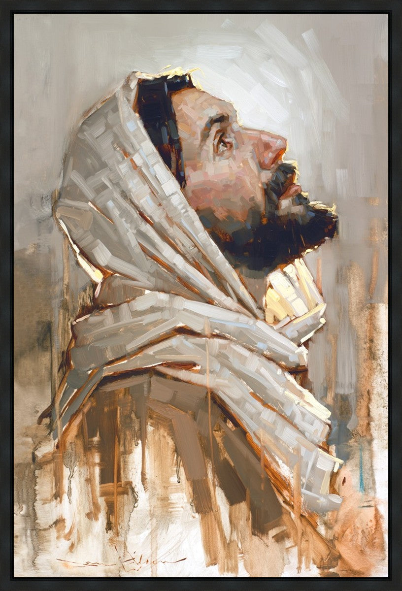 Look to God and Live" painting by Dan Wilson is an inspiring painting depicting Jesus' side profile, gazing upwards toward heaven amidst turbulent waves, symbolizing the importance of turning to God for guidance and salvation. This Christian artwork by Dan Wilson embodies themes of faith, hope, redemption, and the transformative power of turning to Him.