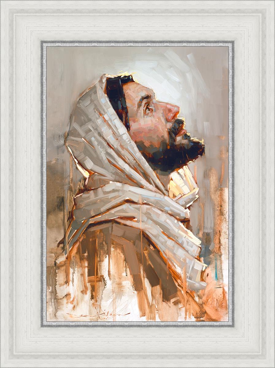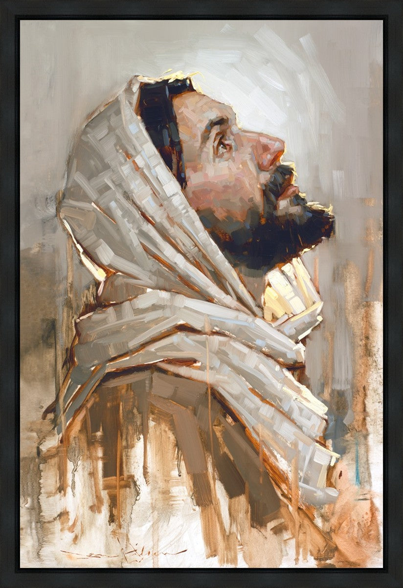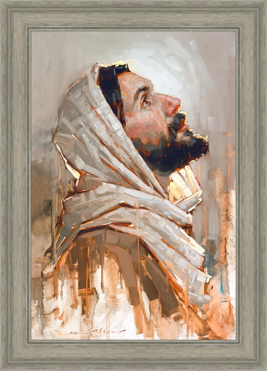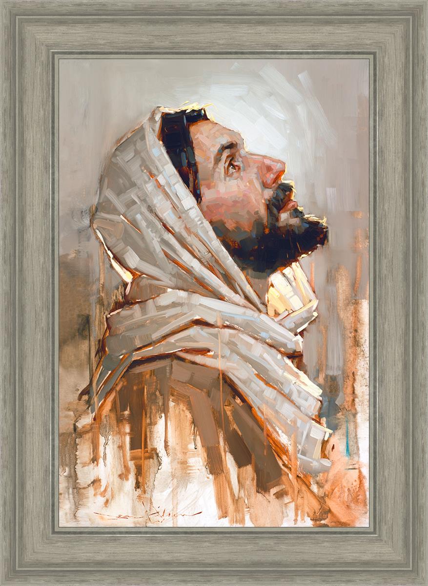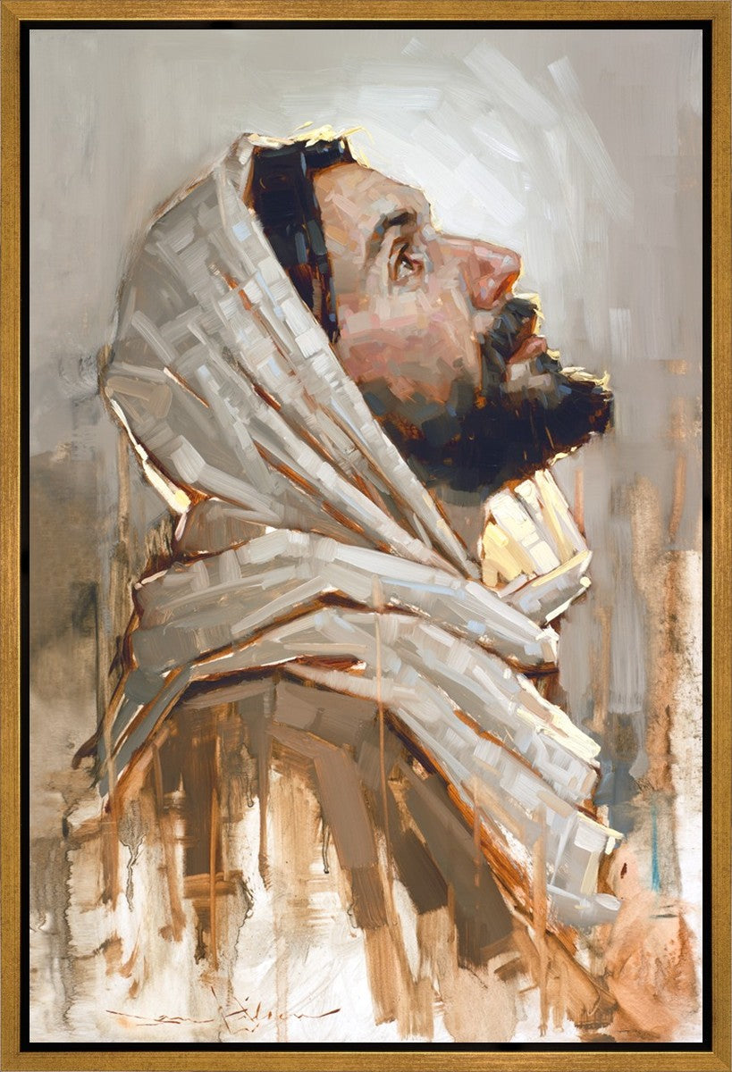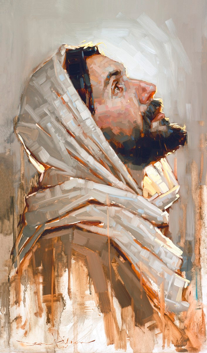 Look to God and Live" painting by Dan Wilson is an inspiring painting depicting Jesus' side profile, gazing upwards toward heaven amidst turbulent waves, symbolizing the importance of turning to God for guidance and salvation. This Christian artwork by Dan Wilson embodies themes of faith, hope, redemption, and the transformative power of turning to Him.