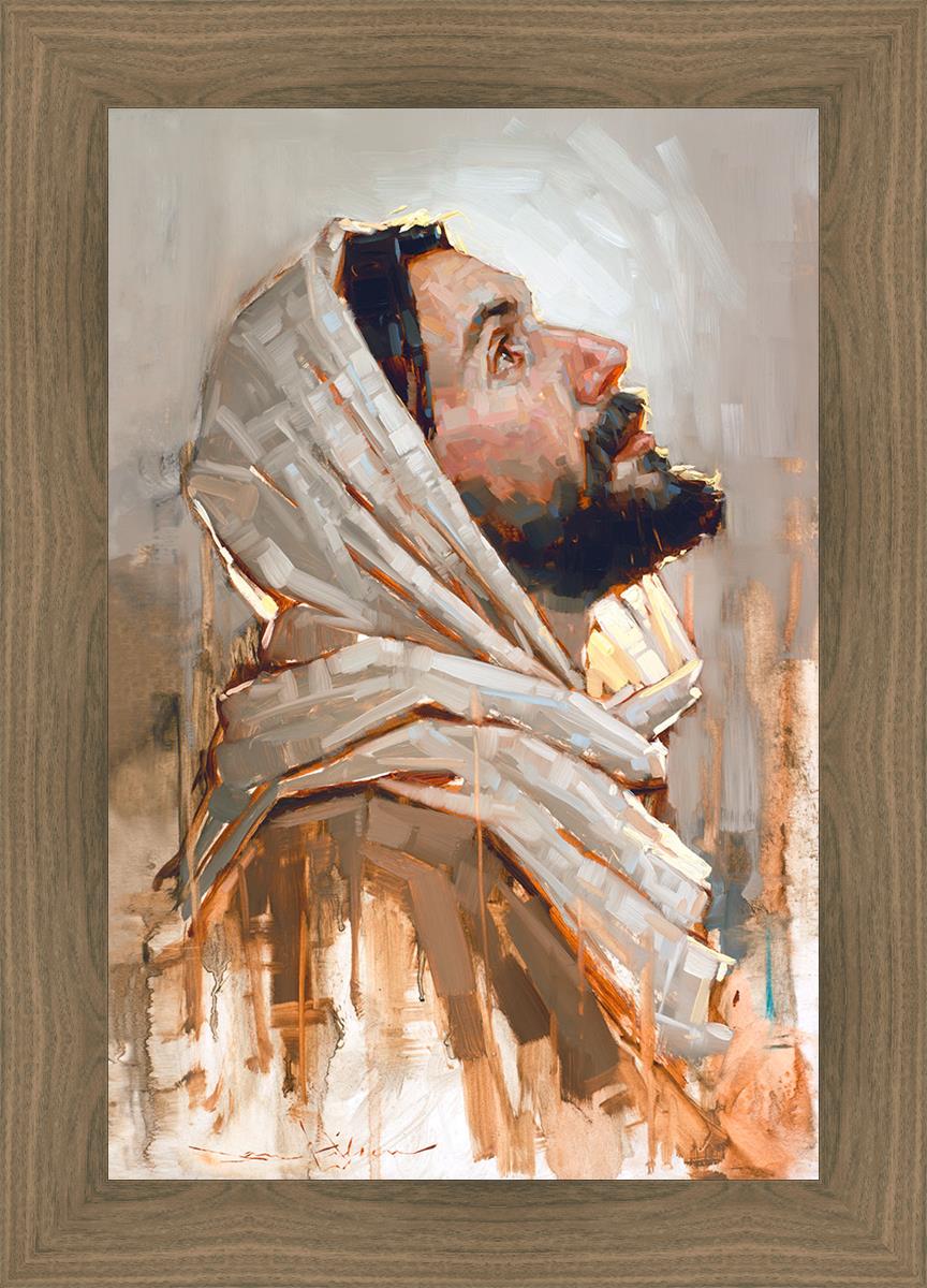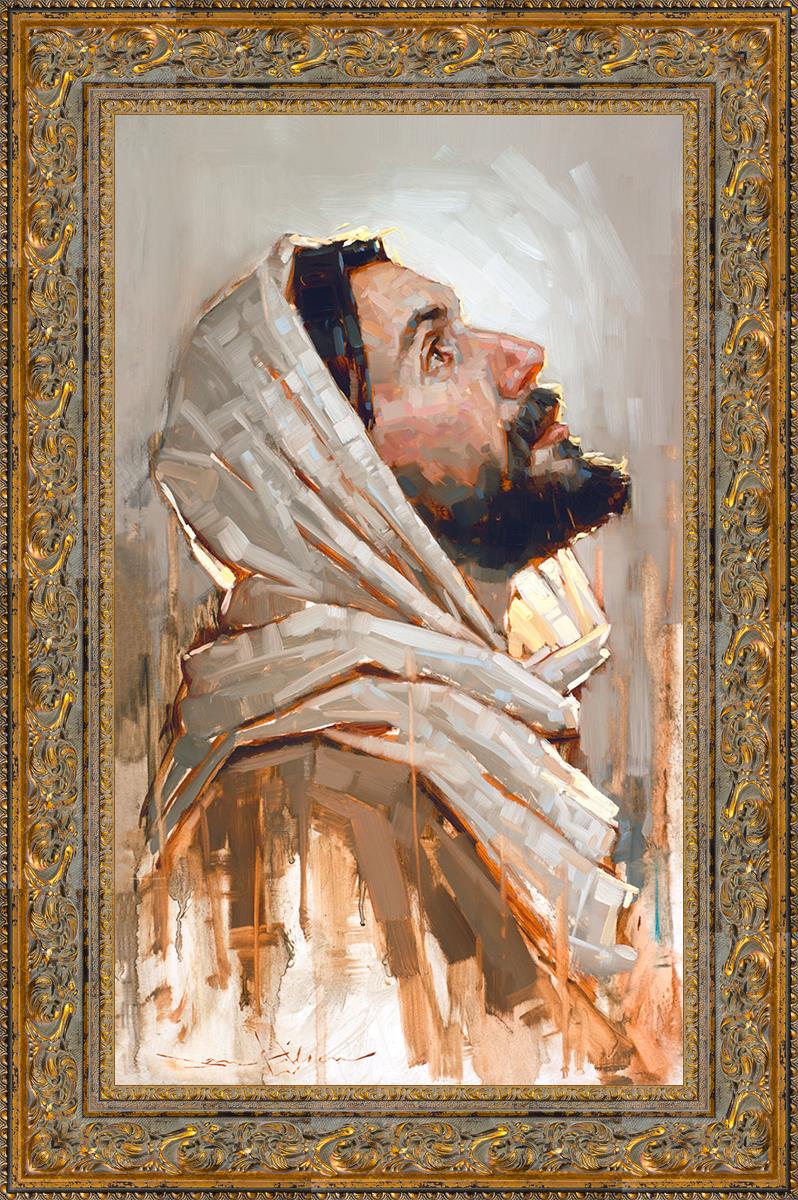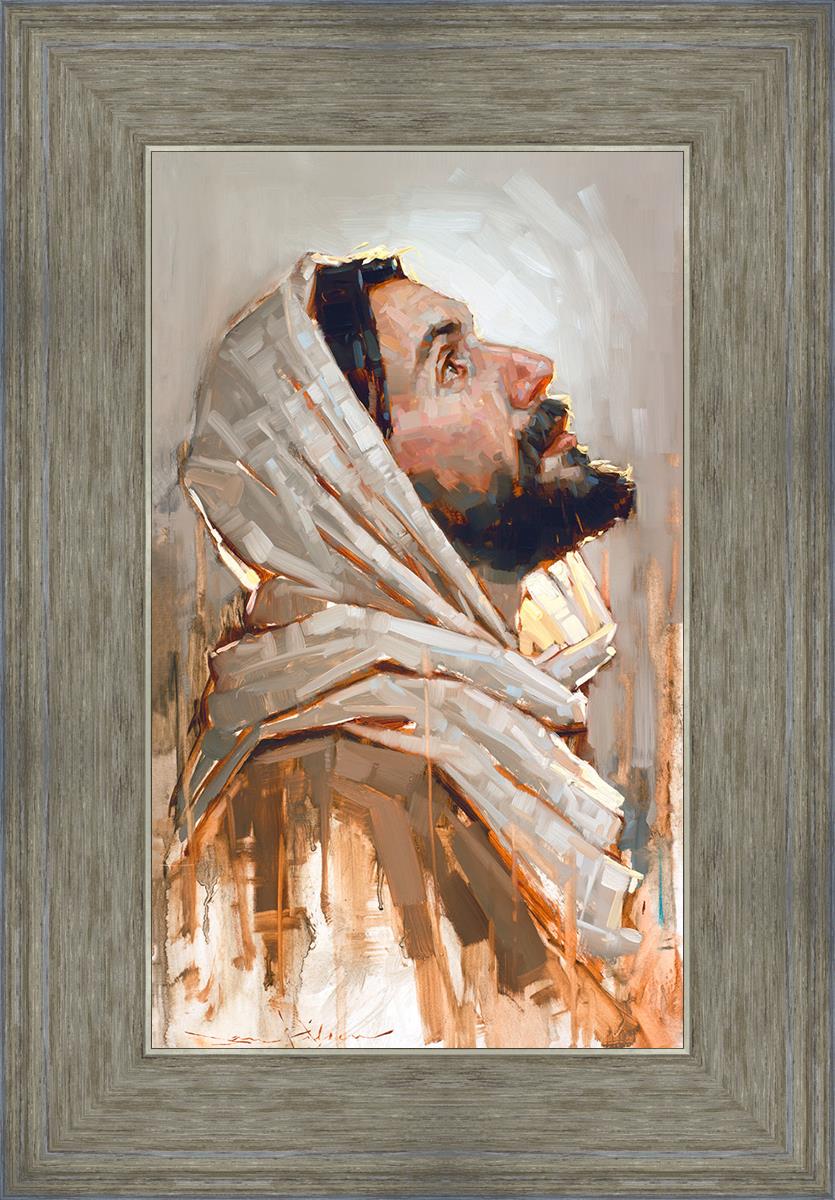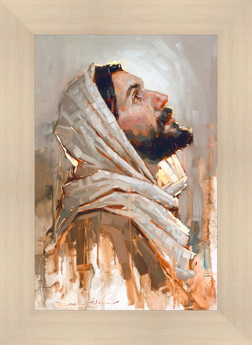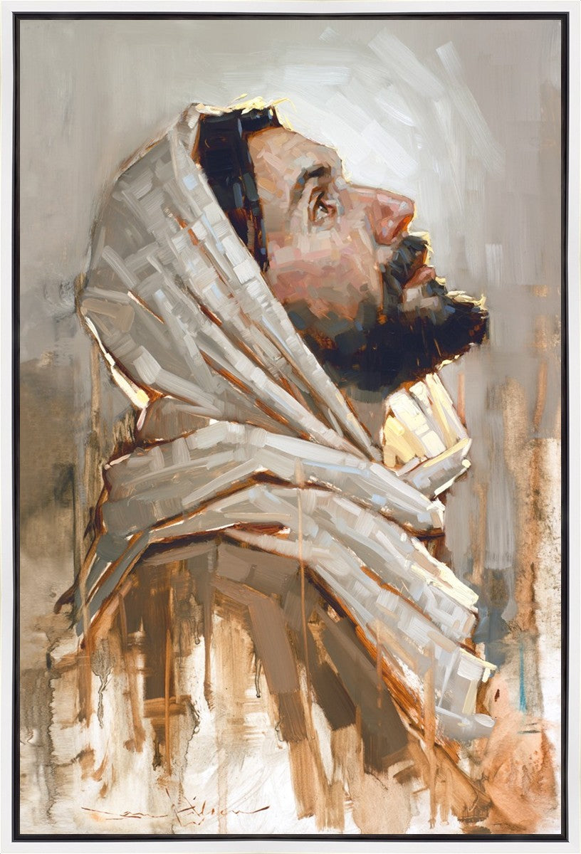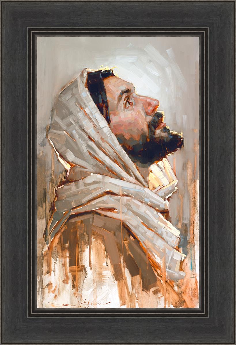 Look to God and Live" painting by Dan Wilson is an inspiring painting depicting Jesus' side profile, gazing upwards toward heaven amidst turbulent waves, symbolizing the importance of turning to God for guidance and salvation. This Christian artwork by Dan Wilson embodies themes of faith, hope, redemption, and the transformative power of turning to Him.