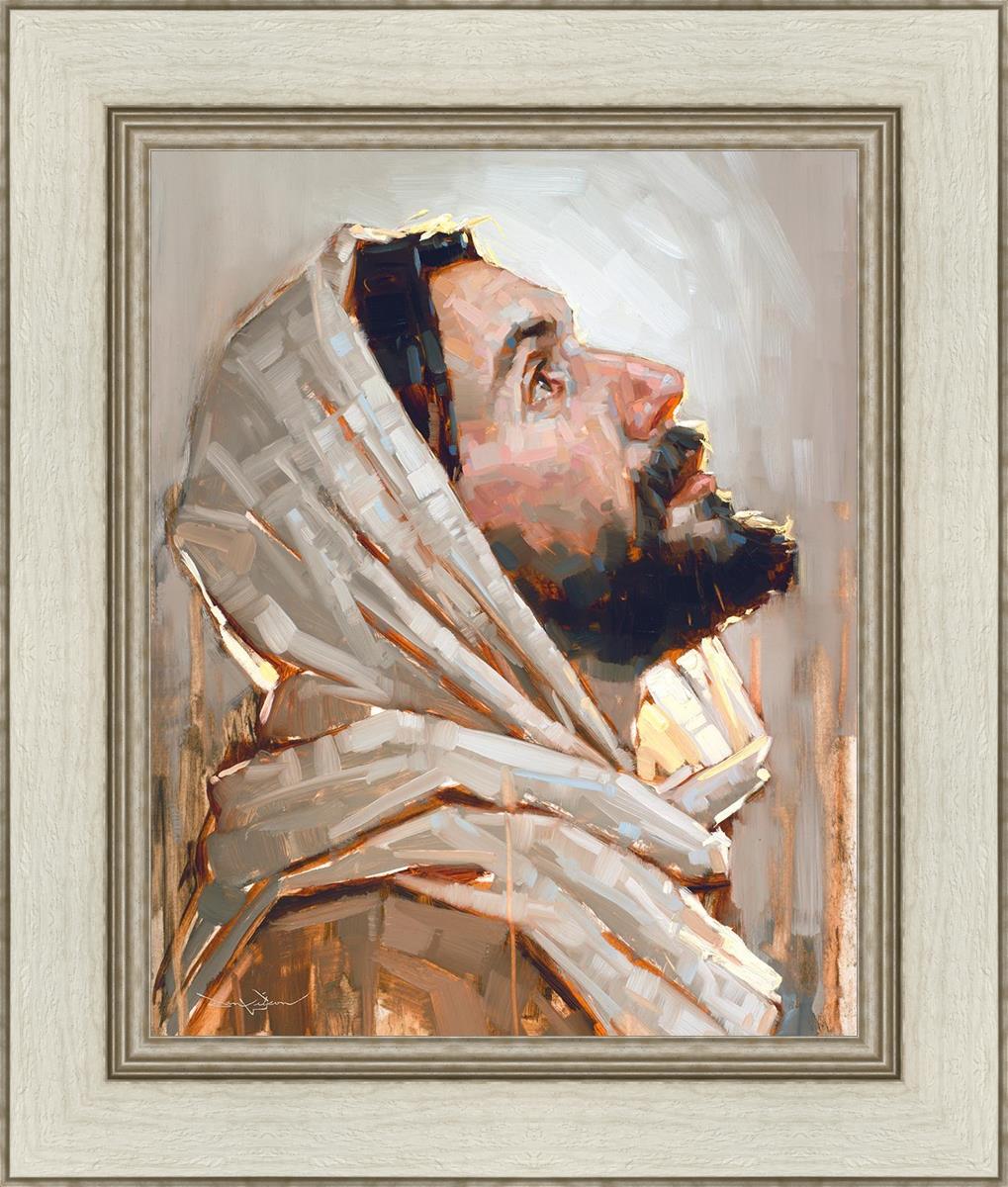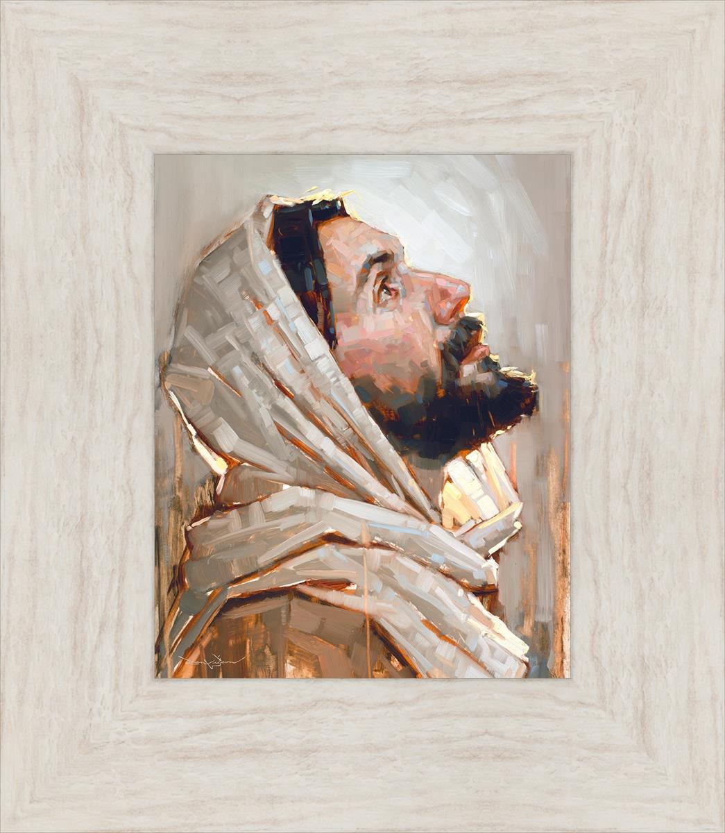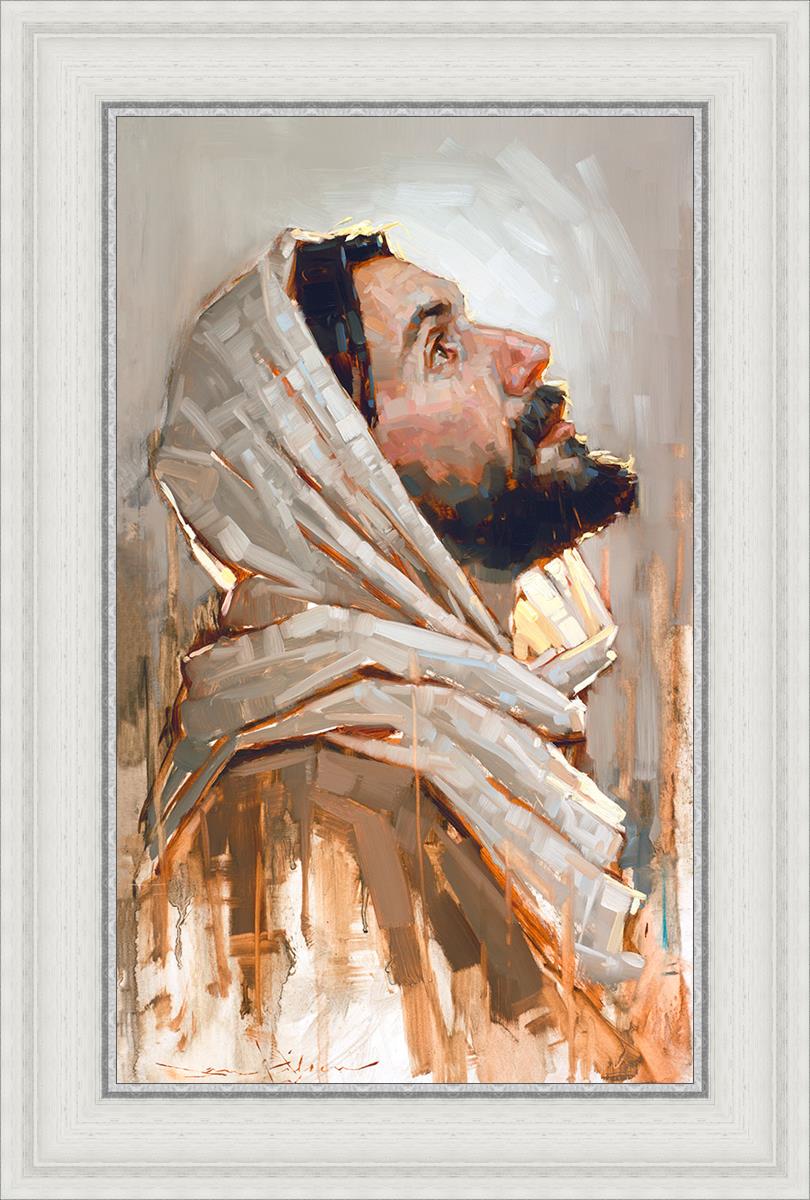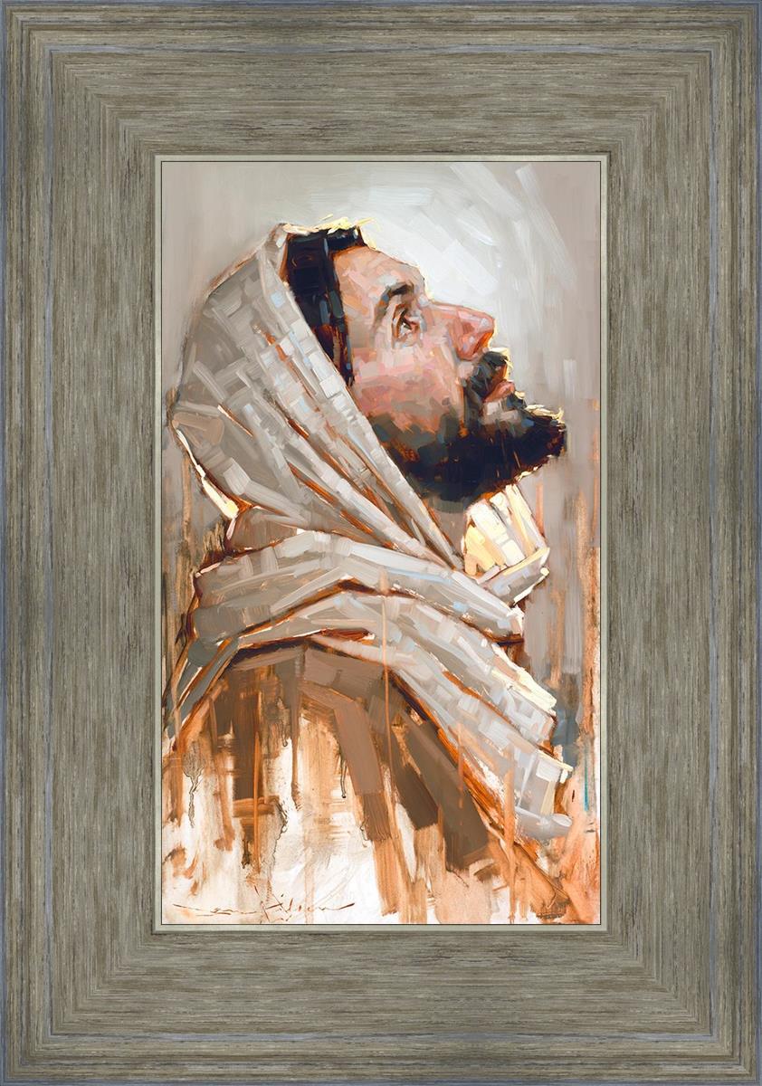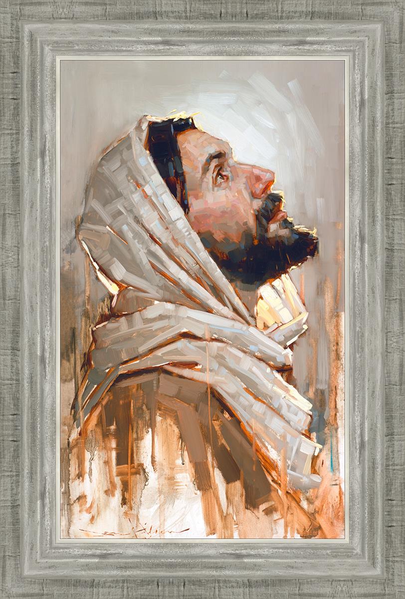 Look to God and Live" painting by Dan Wilson is an inspiring painting depicting Jesus' side profile, gazing upwards toward heaven amidst turbulent waves, symbolizing the importance of turning to God for guidance and salvation. This Christian artwork by Dan Wilson embodies themes of faith, hope, redemption, and the transformative power of turning to Him.