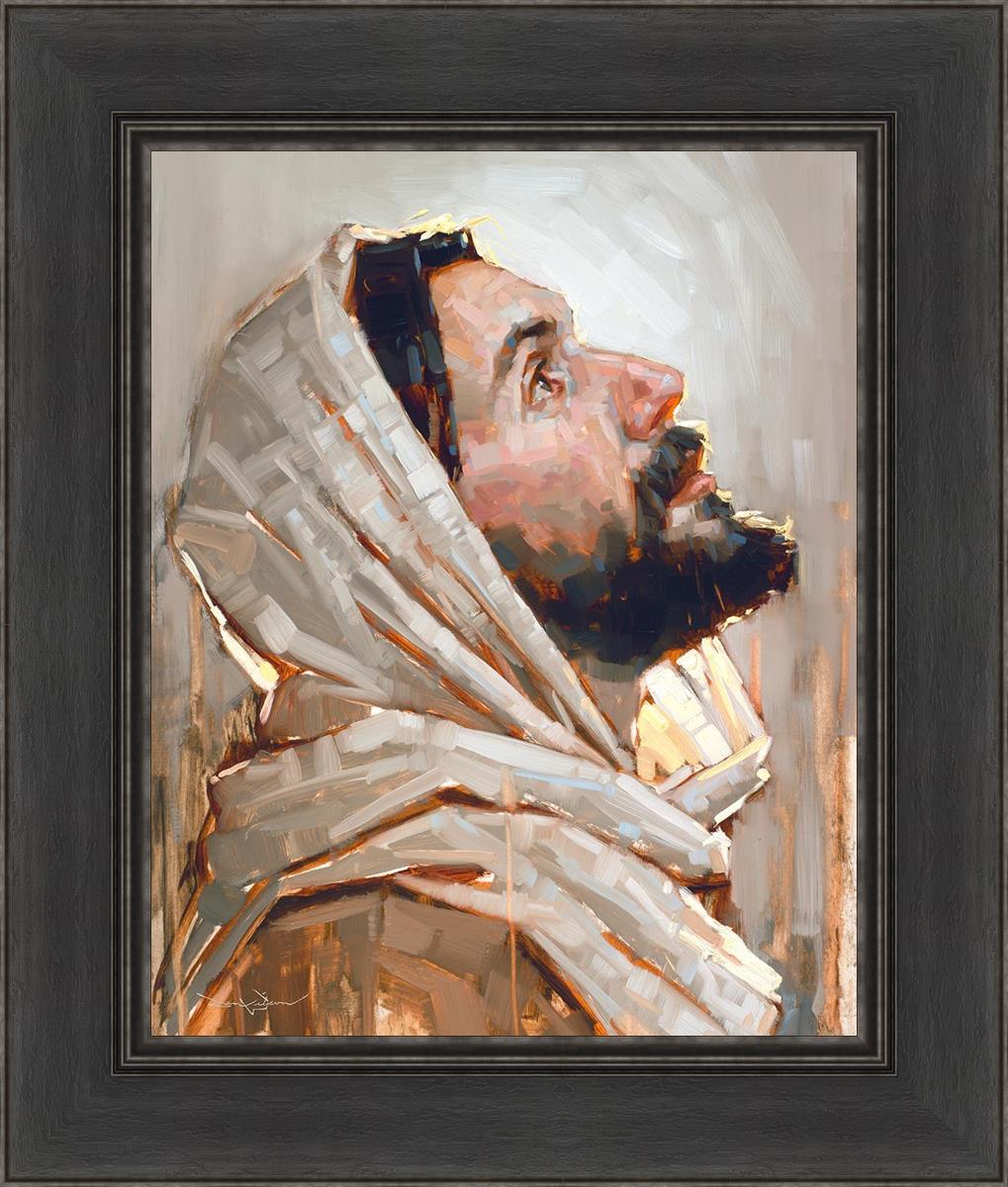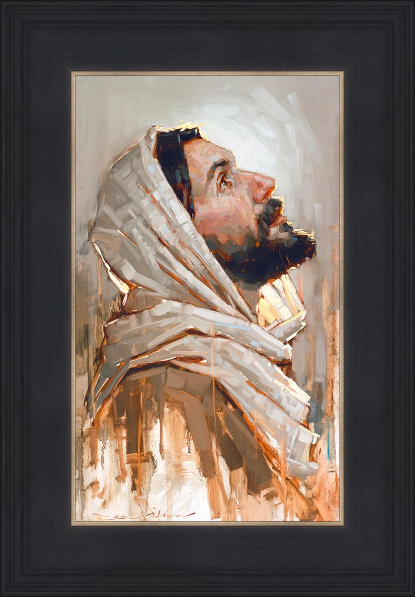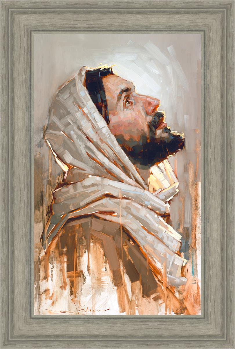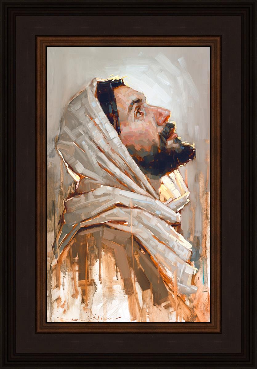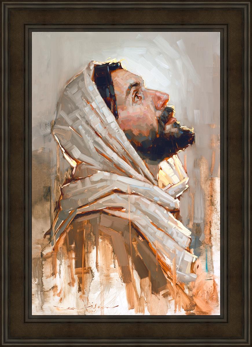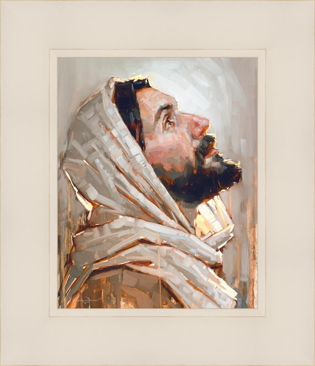 Look to God and Live" painting by Dan Wilson is an inspiring painting depicting Jesus' side profile, gazing upwards toward heaven amidst turbulent waves, symbolizing the importance of turning to God for guidance and salvation. This Christian artwork by Dan Wilson embodies themes of faith, hope, redemption, and the transformative power of turning to Him.