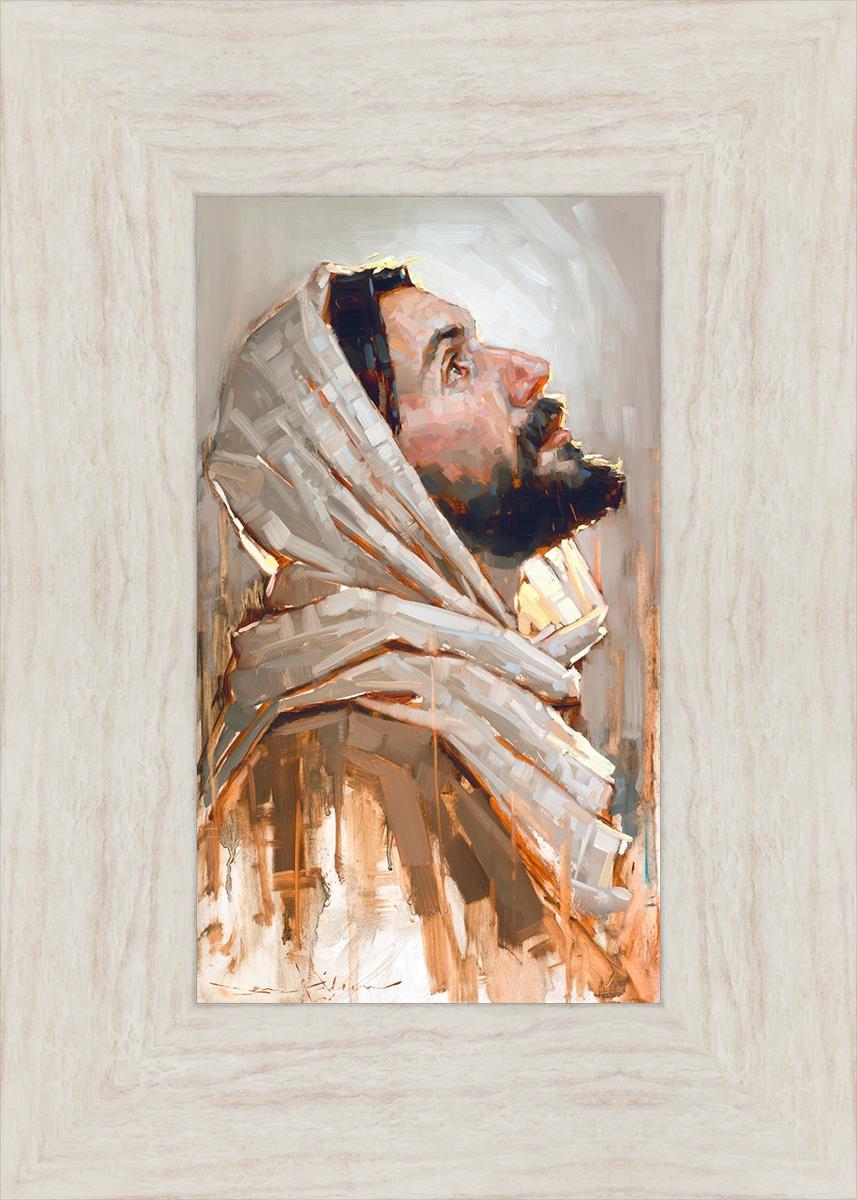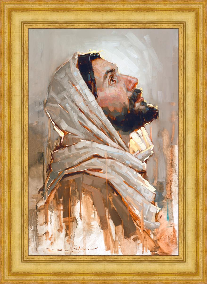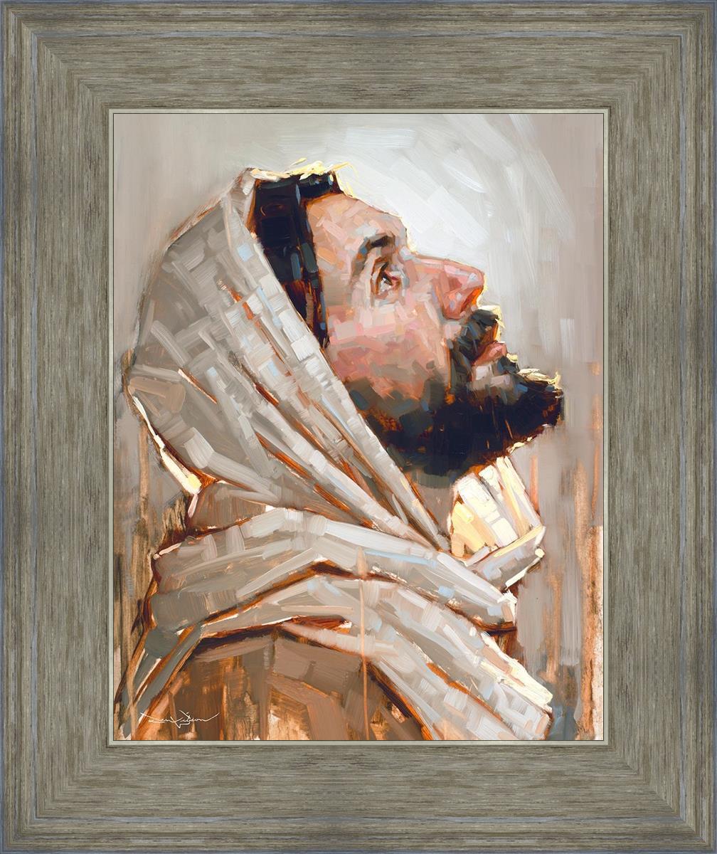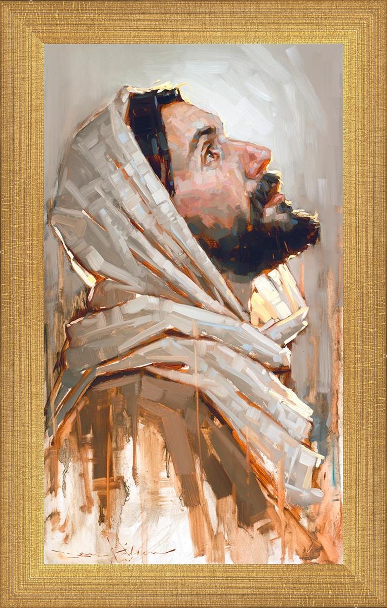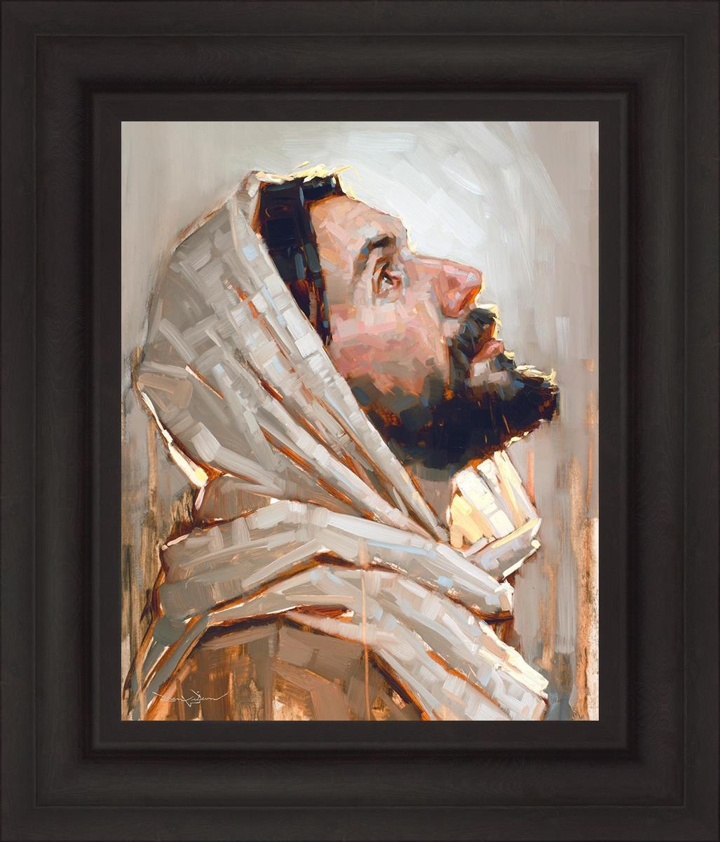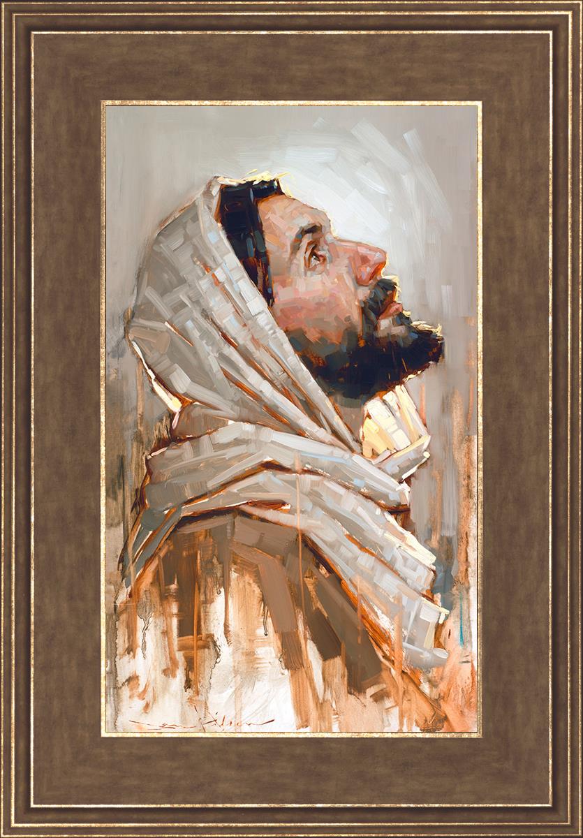 Look to God and Live" painting by Dan Wilson is an inspiring painting depicting Jesus' side profile, gazing upwards toward heaven amidst turbulent waves, symbolizing the importance of turning to God for guidance and salvation. This Christian artwork by Dan Wilson embodies themes of faith, hope, redemption, and the transformative power of turning to Him.