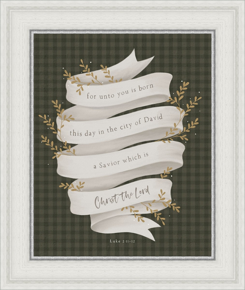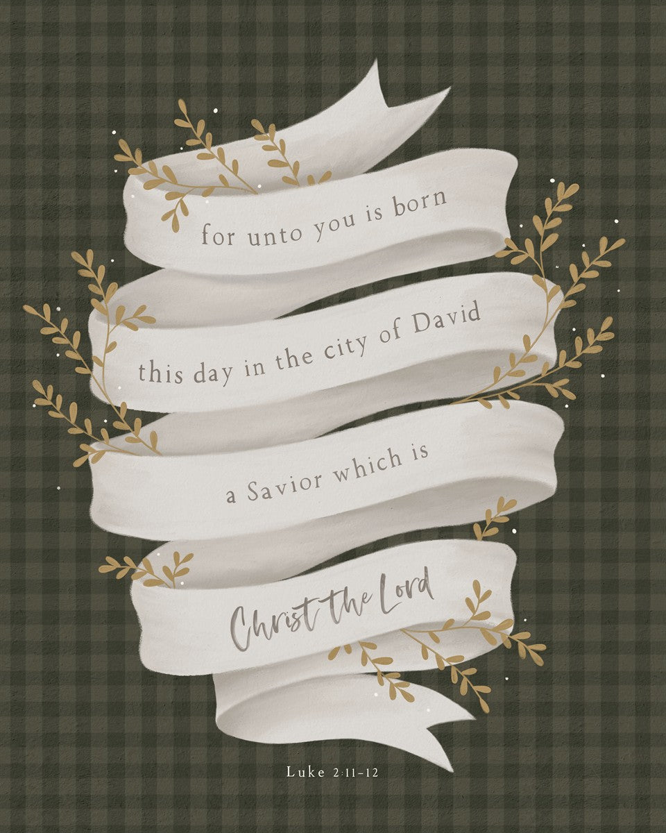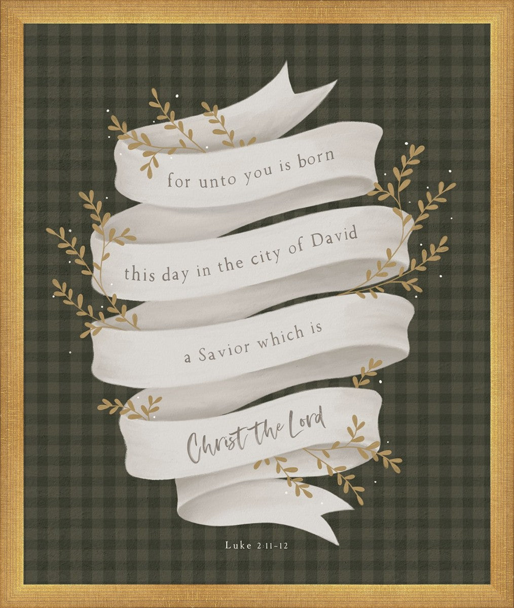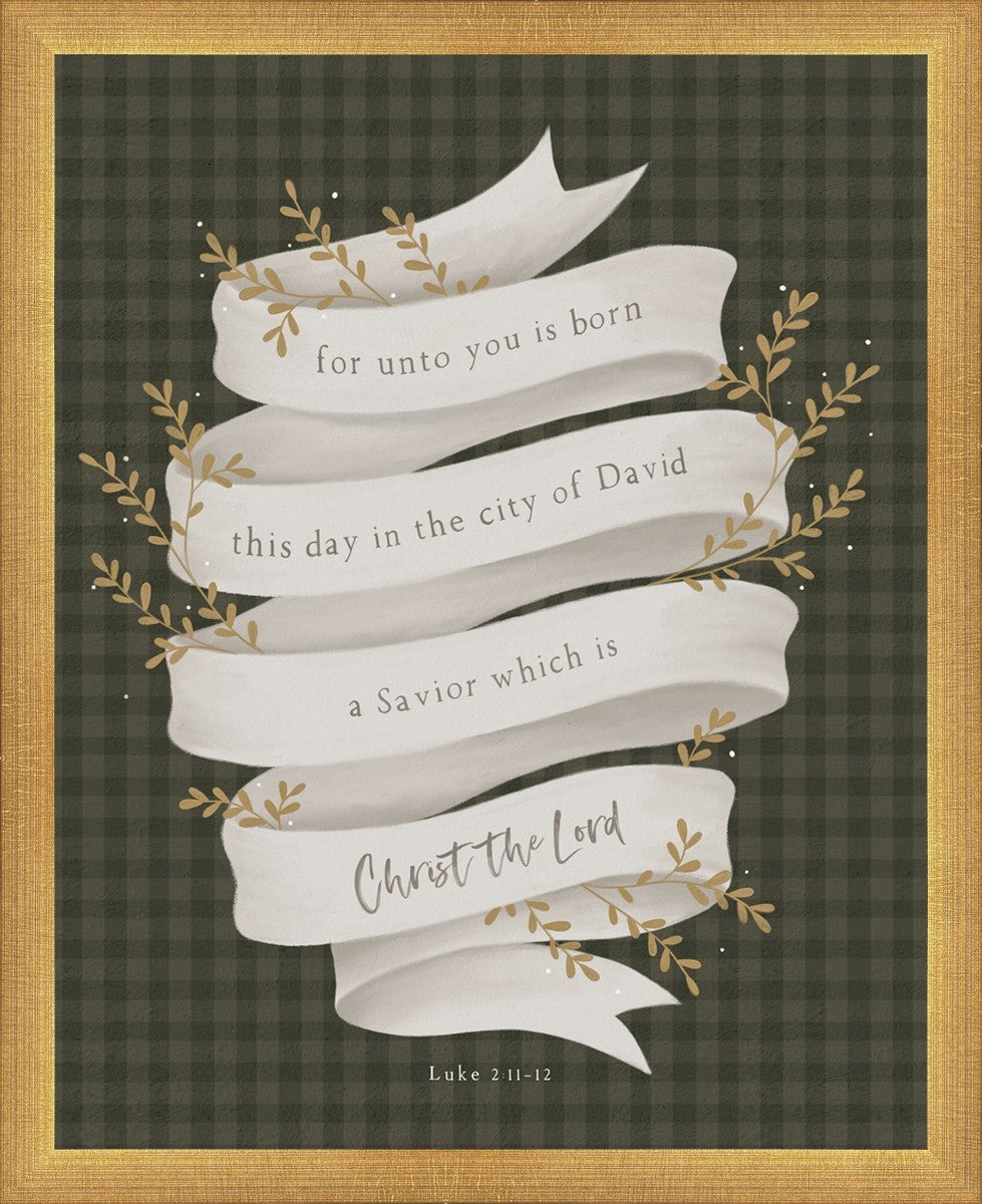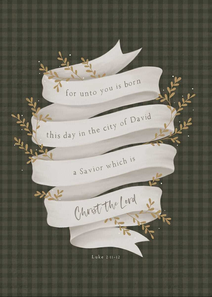 A a scroll containing Luke's "for Unto You" over a green checkerboard background