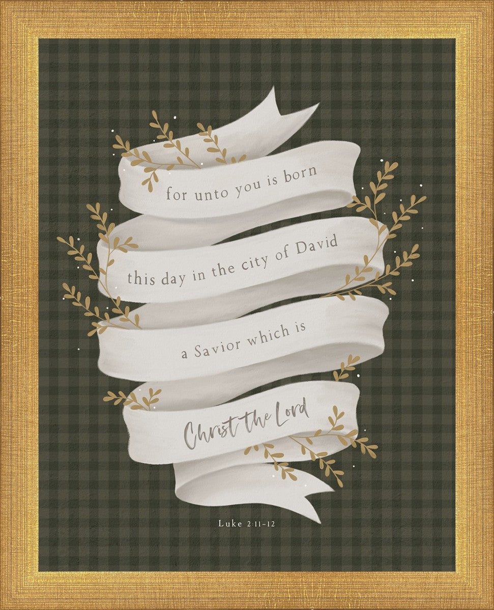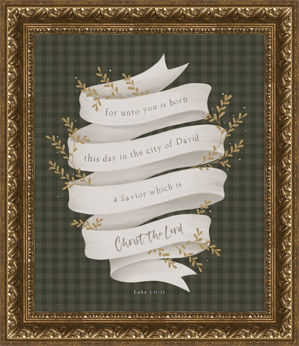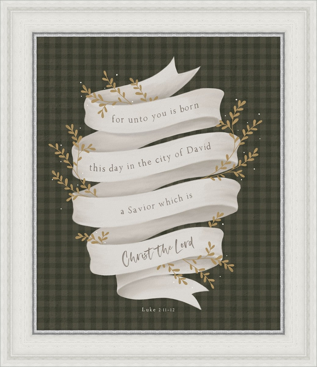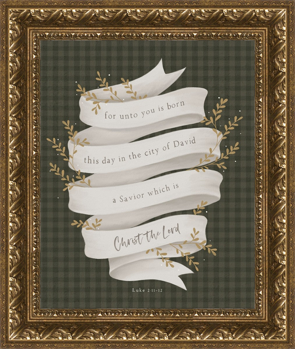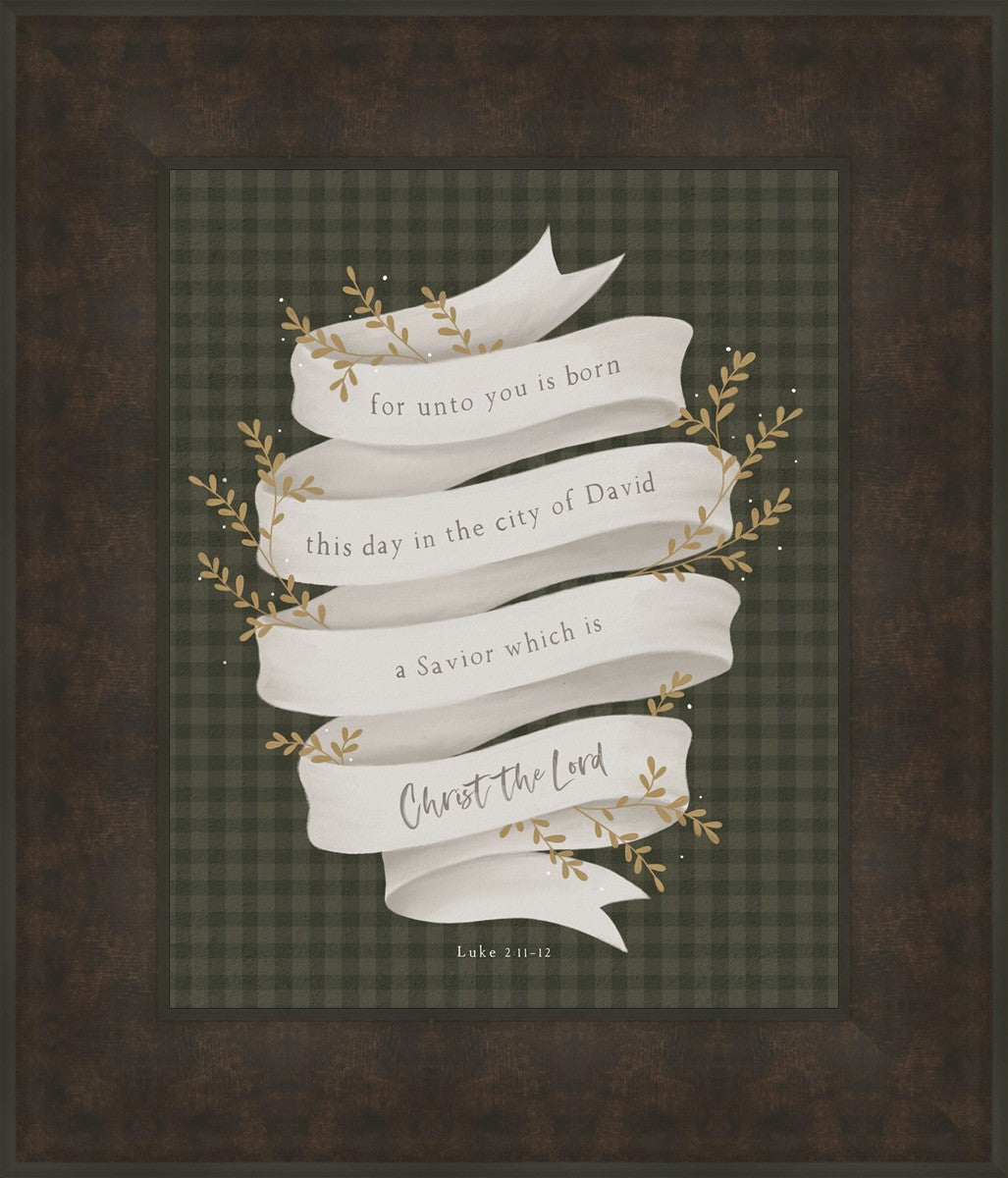 A a scroll containing Luke's "for Unto You" over a green checkerboard background