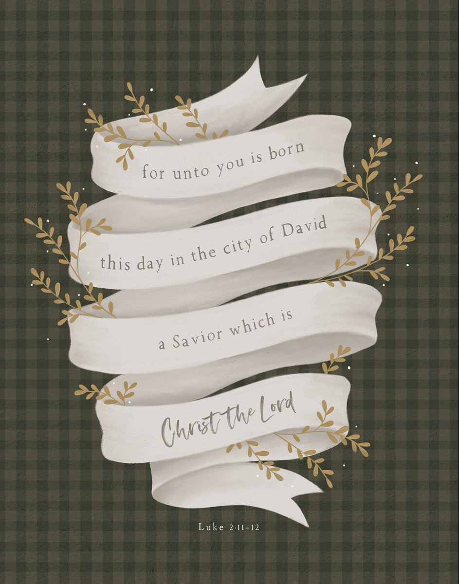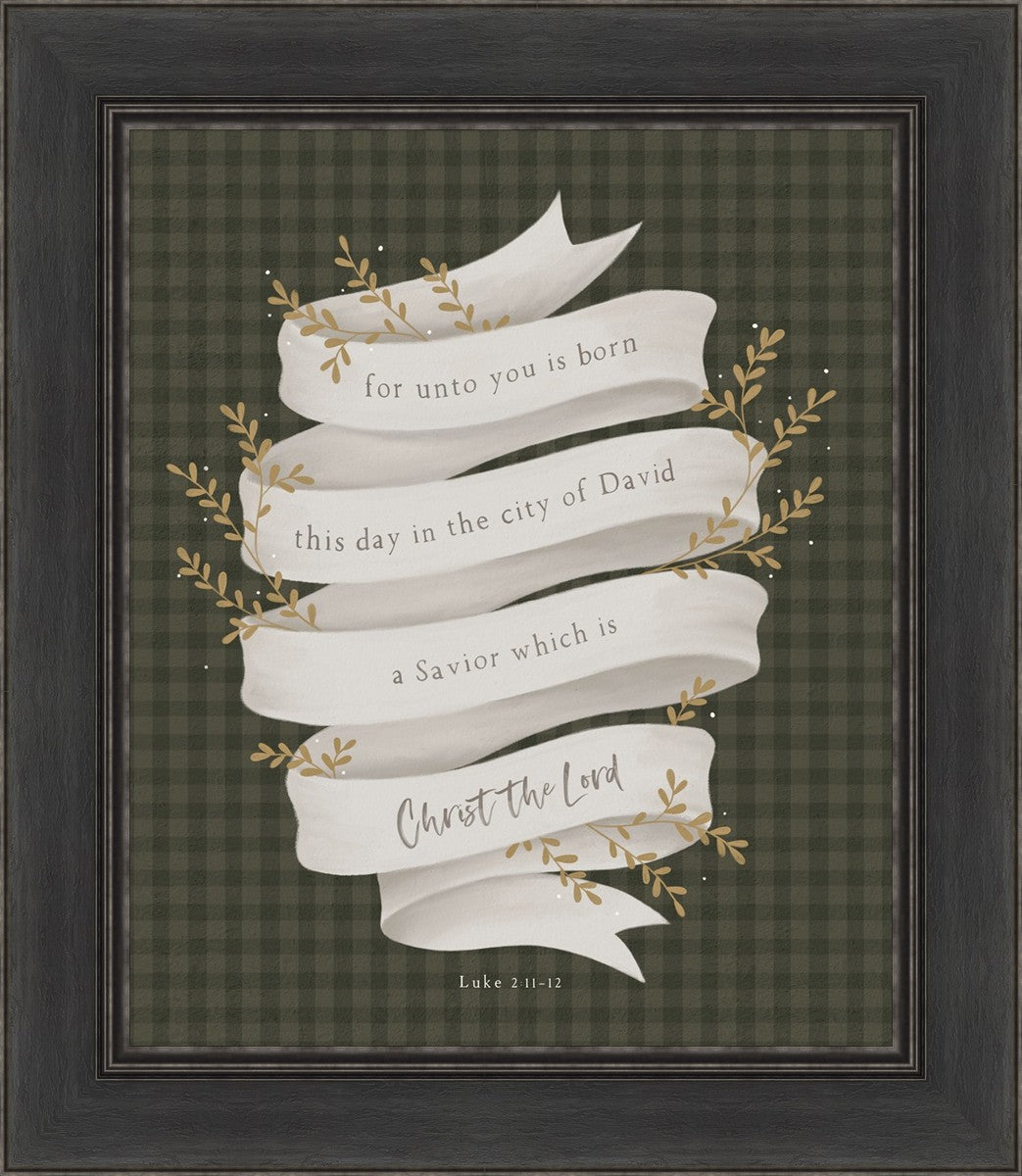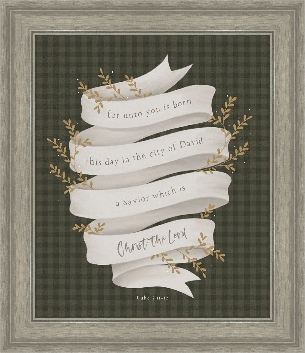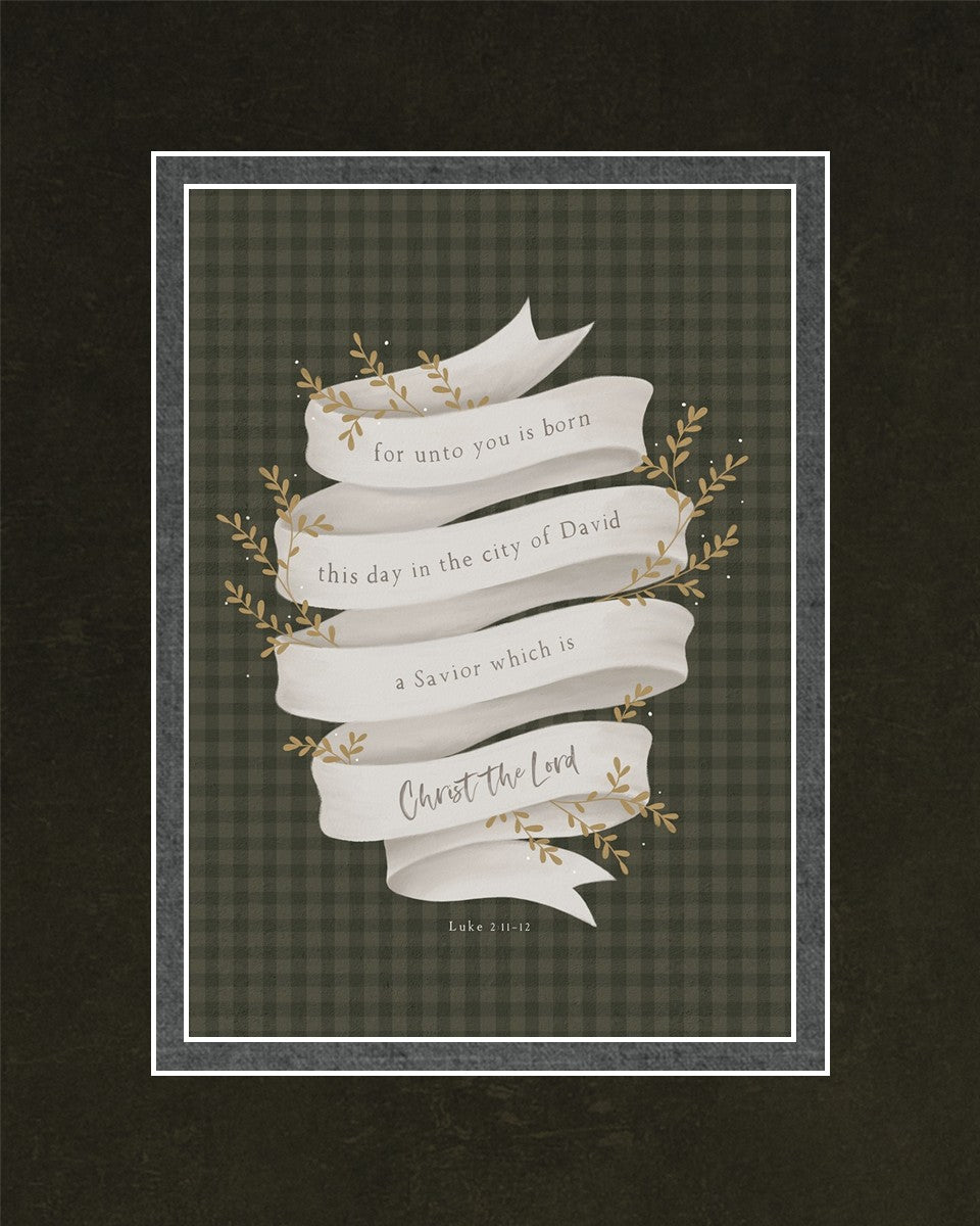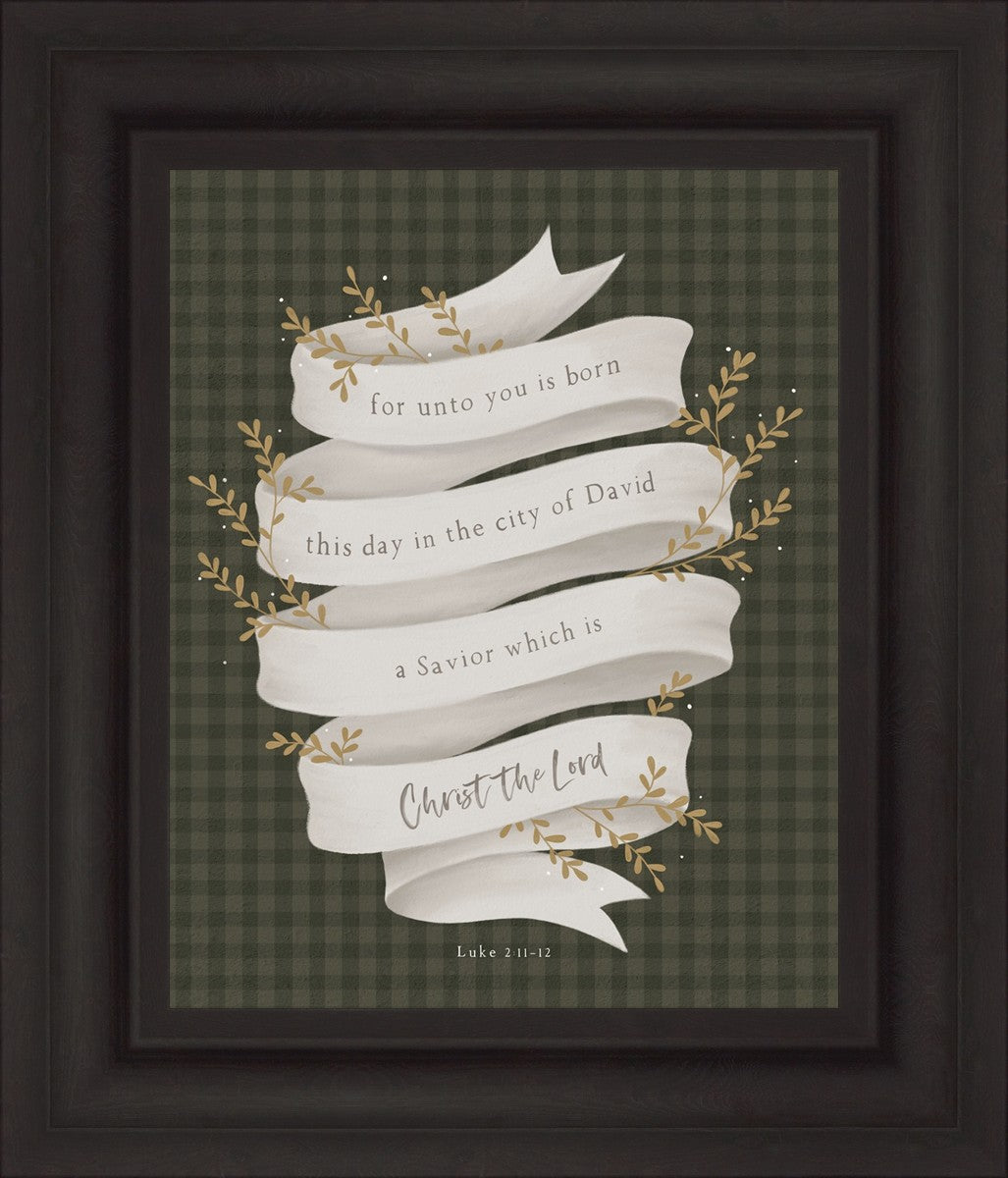 A a scroll containing Luke's "for Unto You" over a green checkerboard background