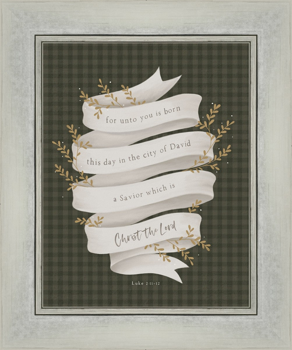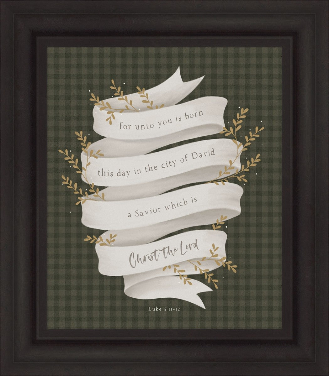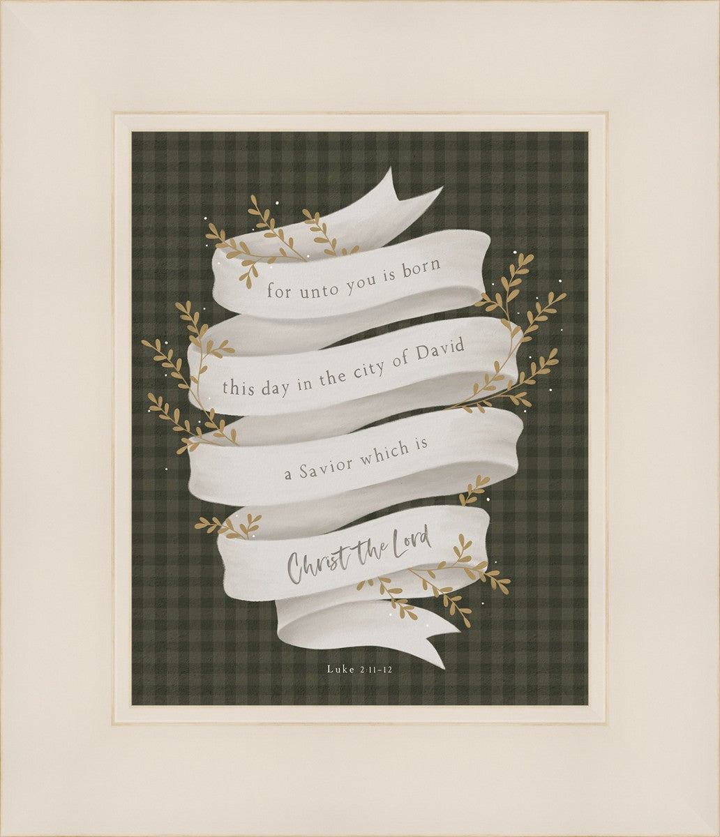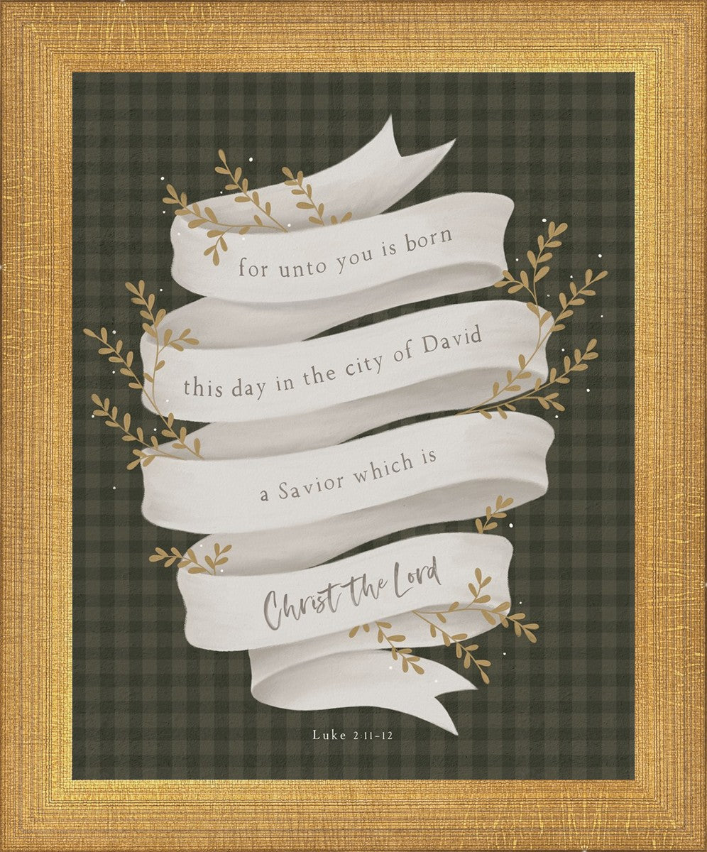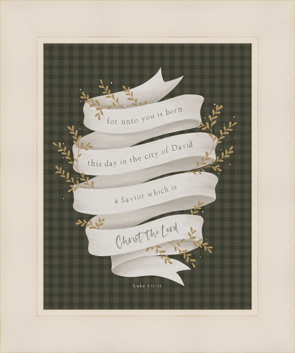A a scroll containing Luke's "for Unto You" over a green checkerboard background