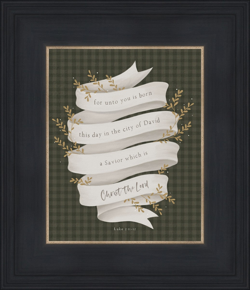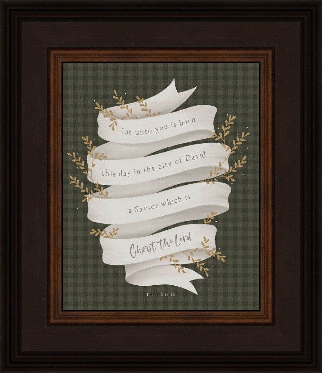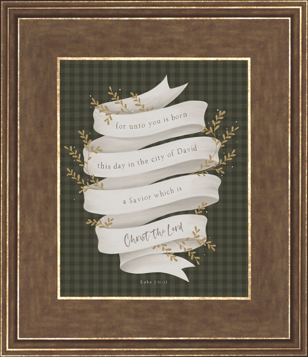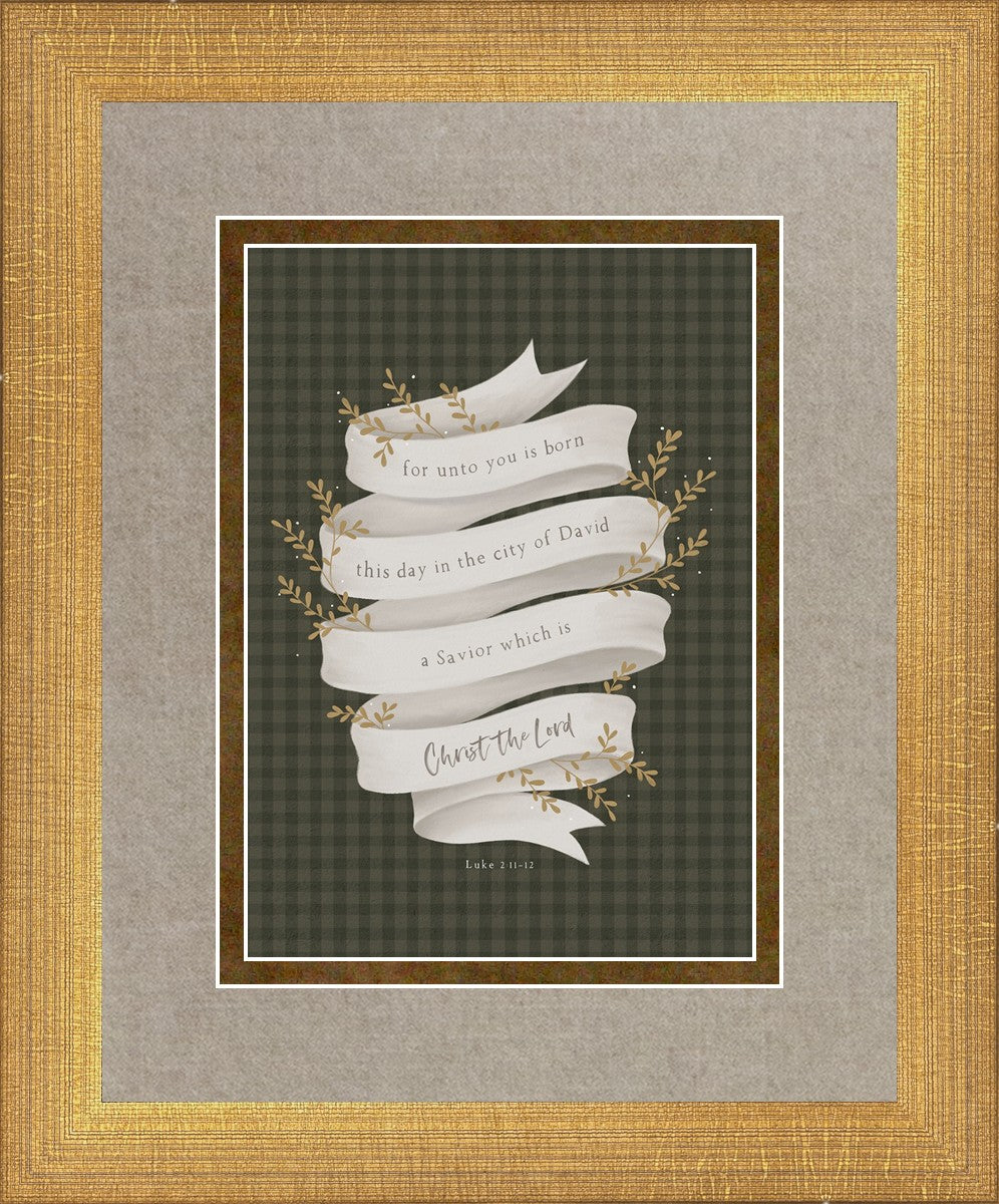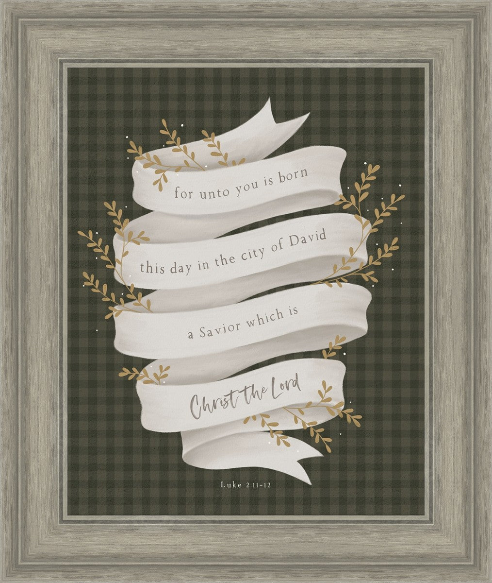 A a scroll containing Luke's "for Unto You" over a green checkerboard background