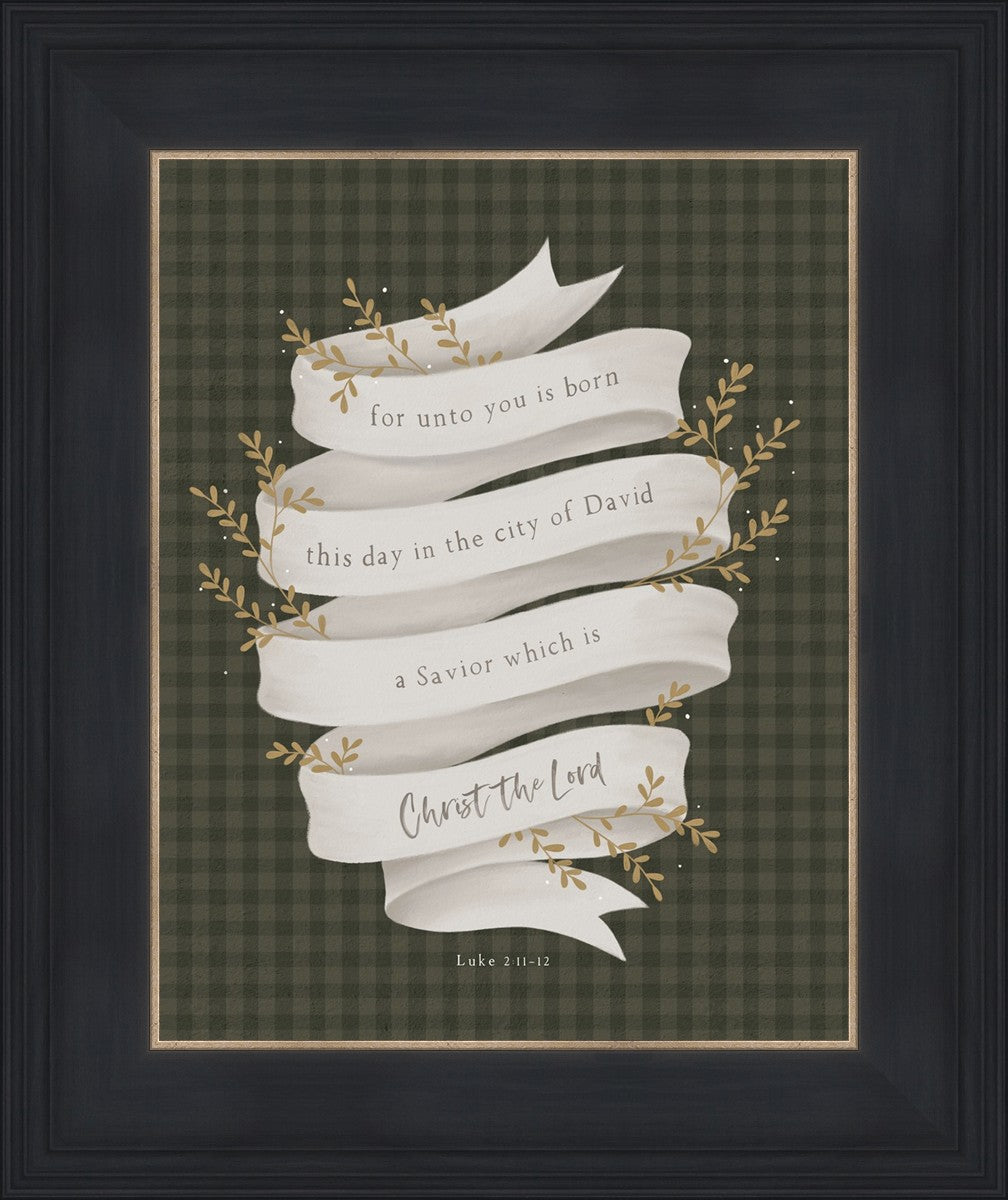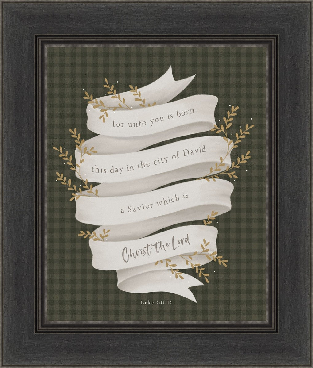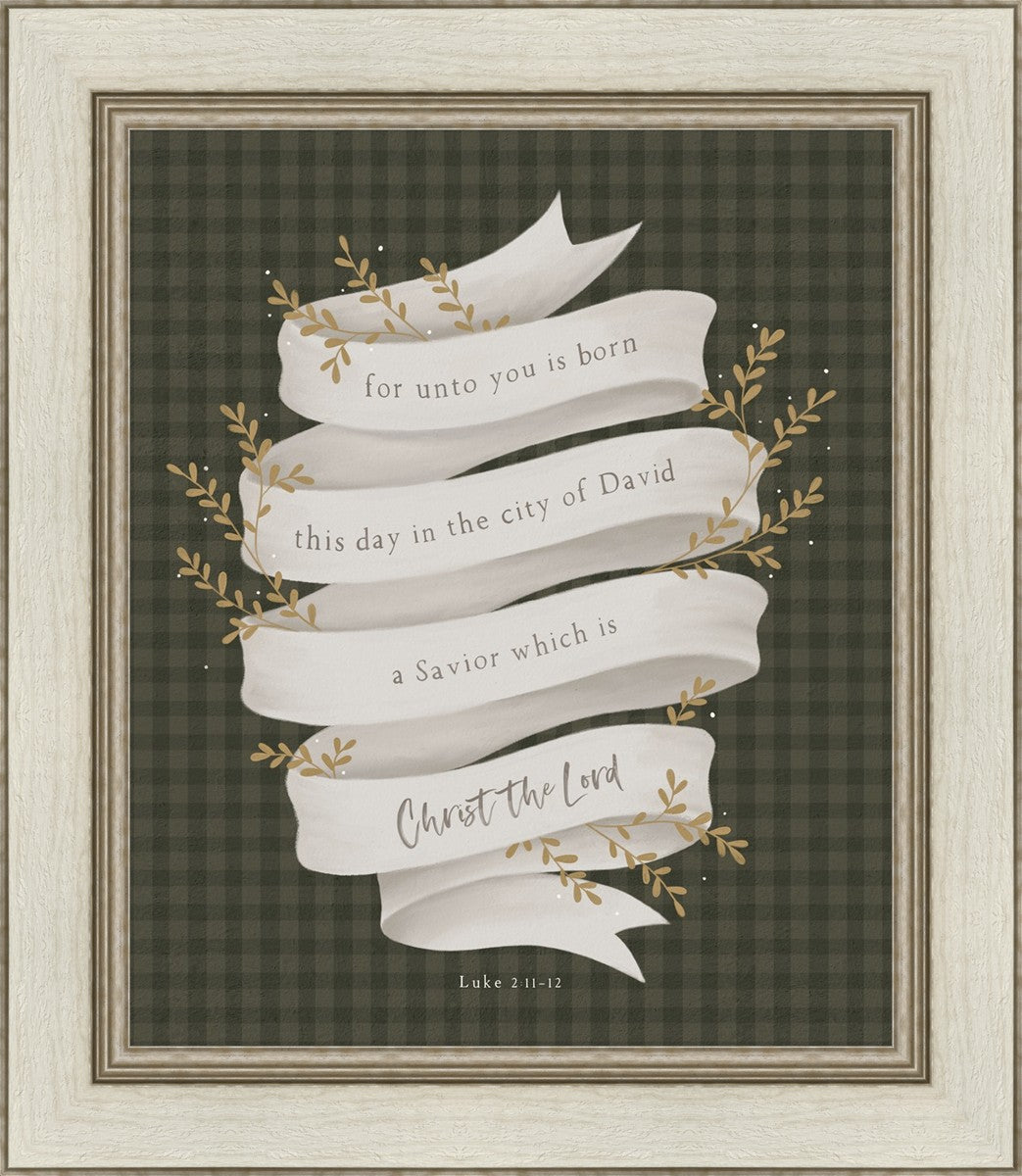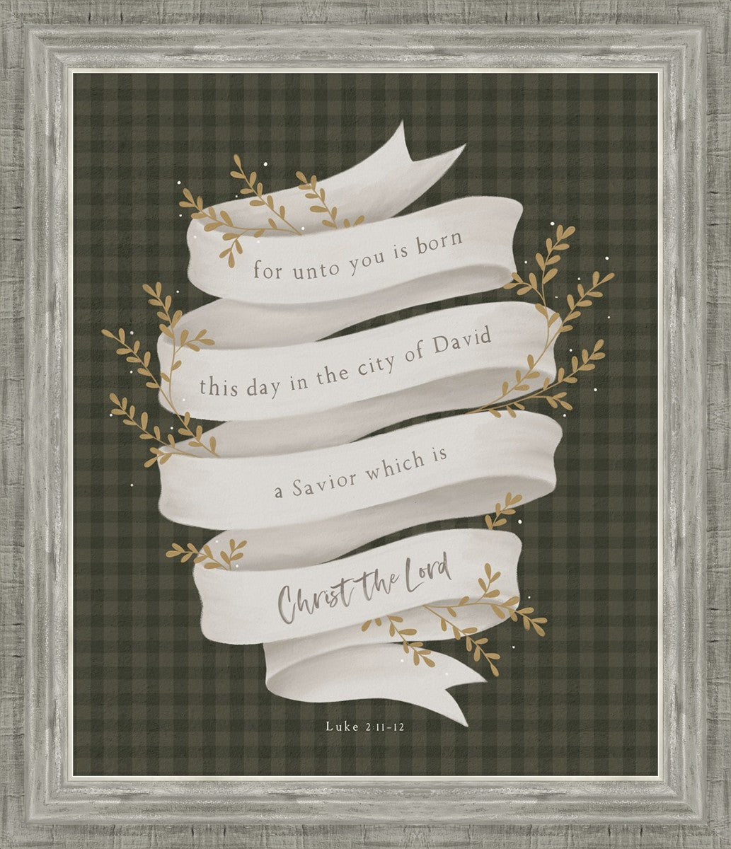 A a scroll containing Luke's "for Unto You" over a green checkerboard background