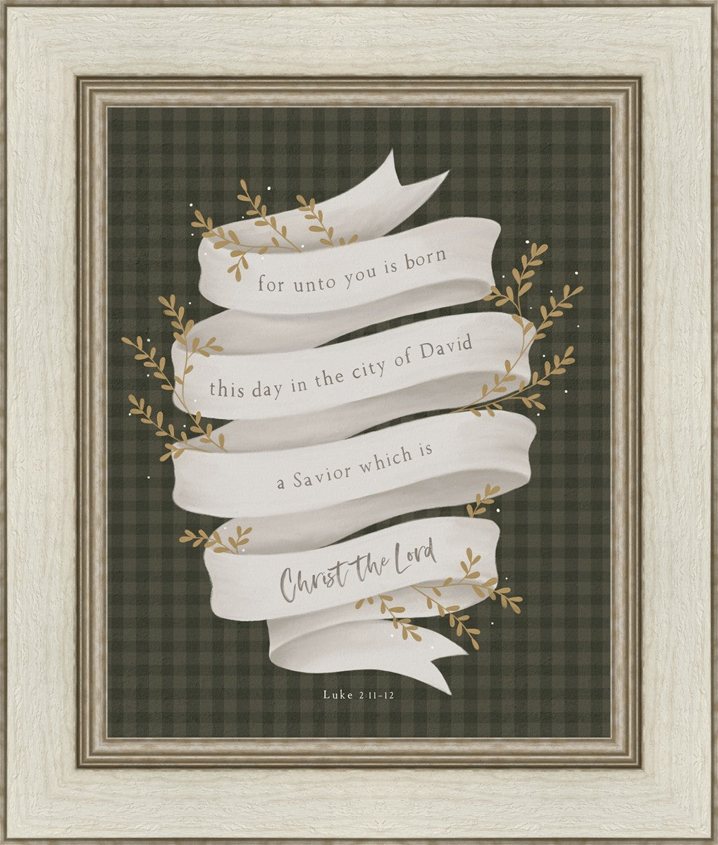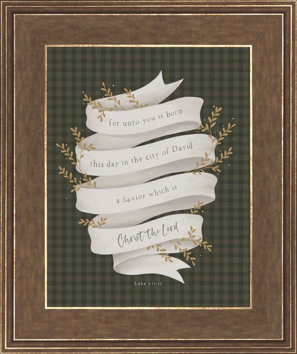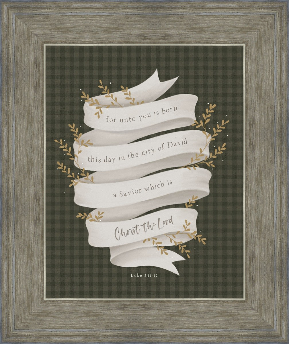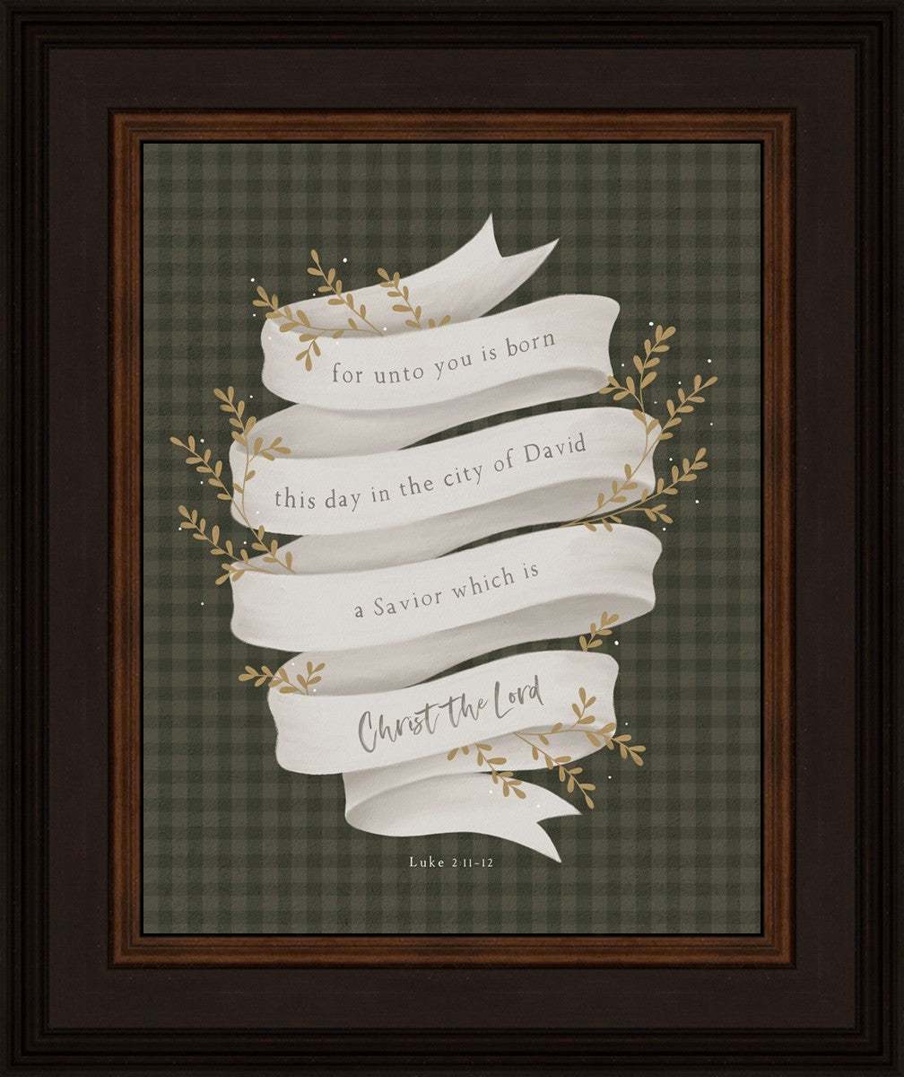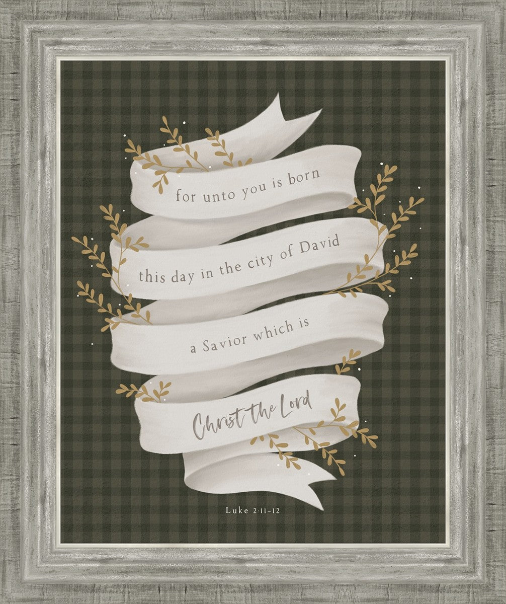 A a scroll containing Luke's "for Unto You" over a green checkerboard background