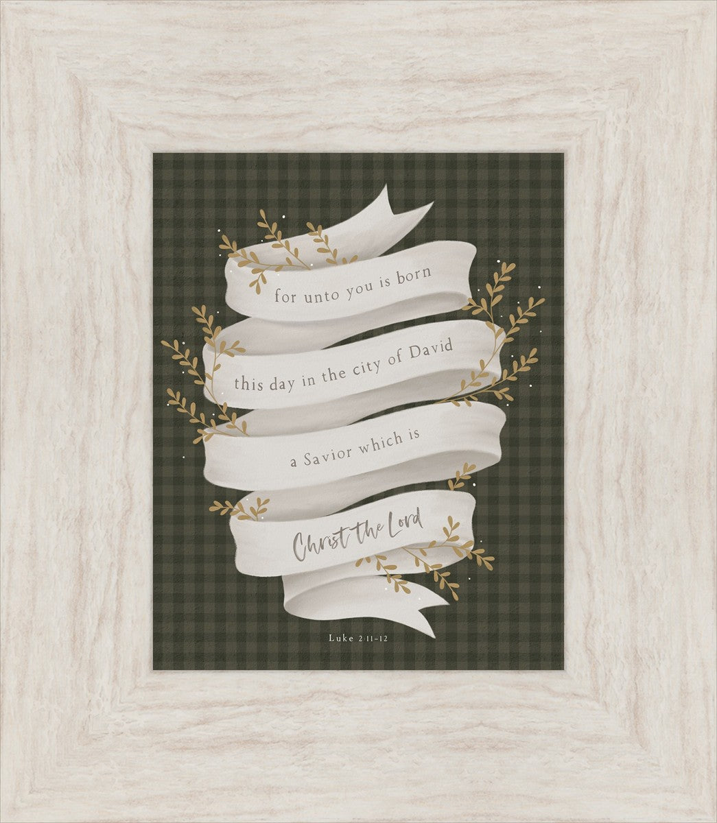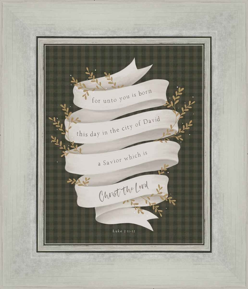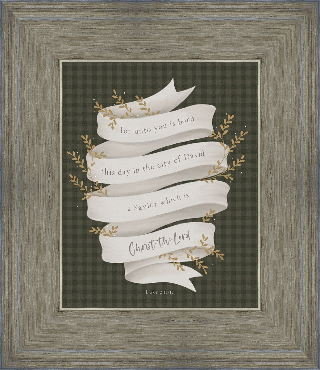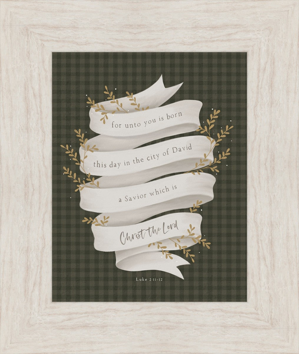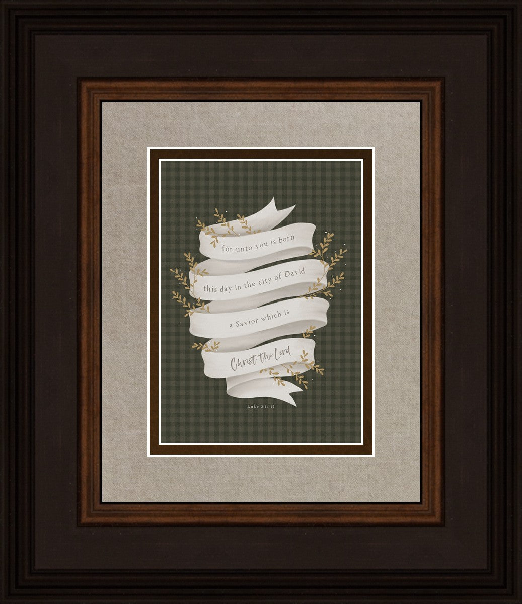 A a scroll containing Luke's "for Unto You" over a green checkerboard background