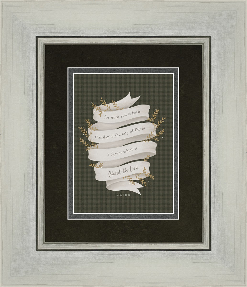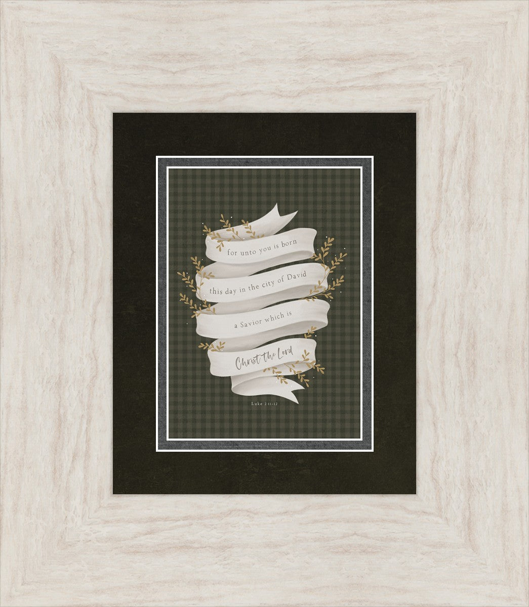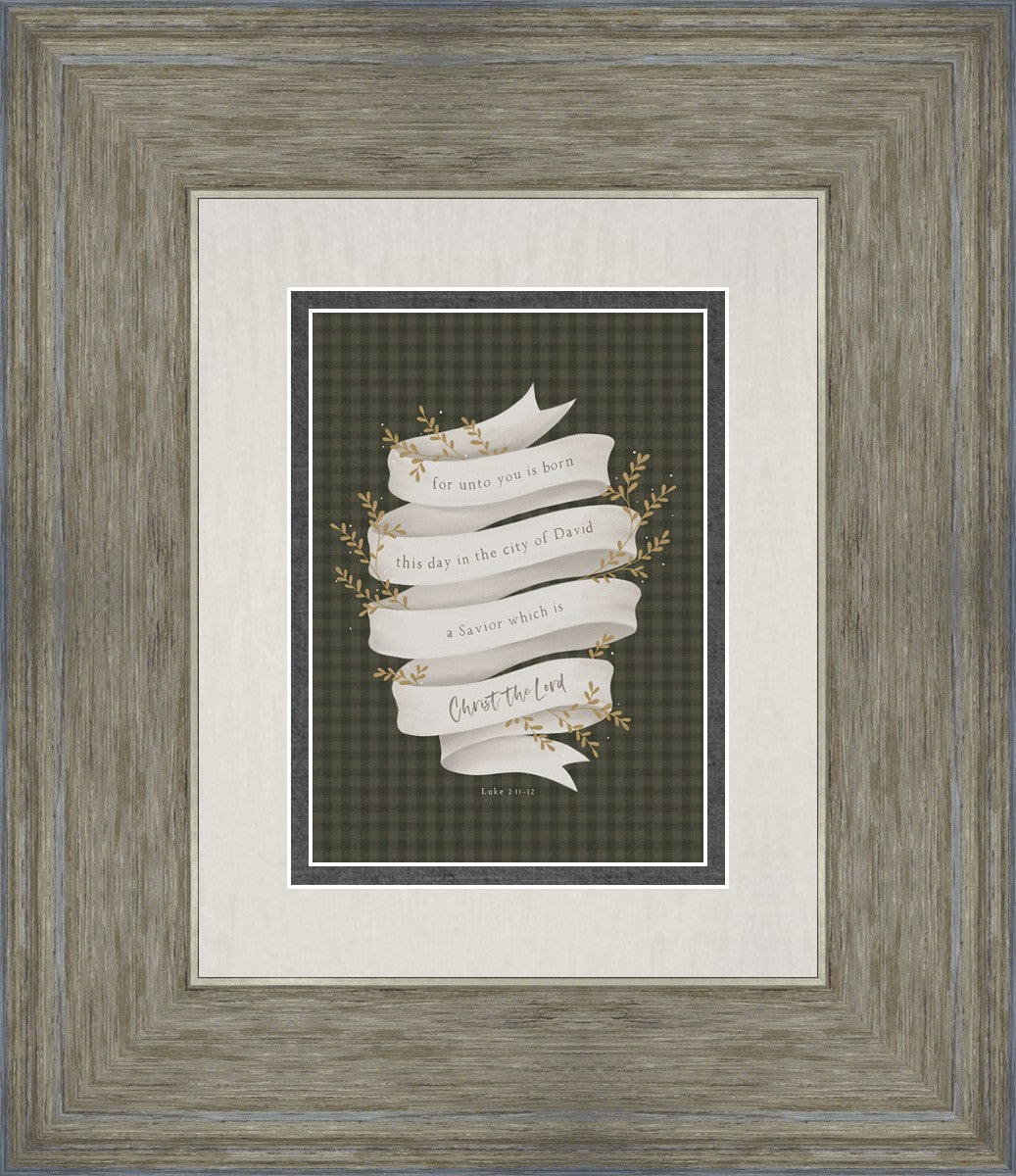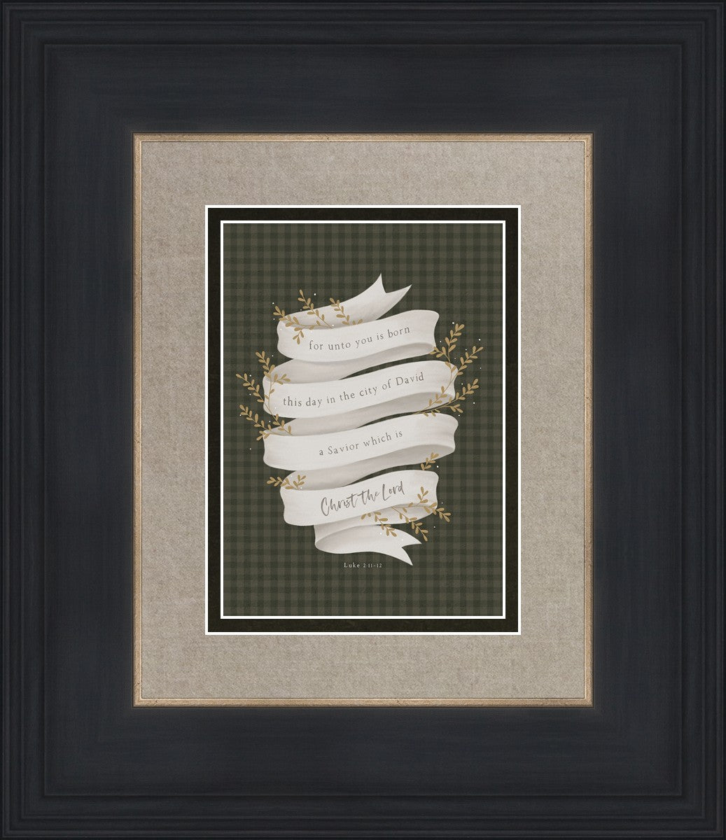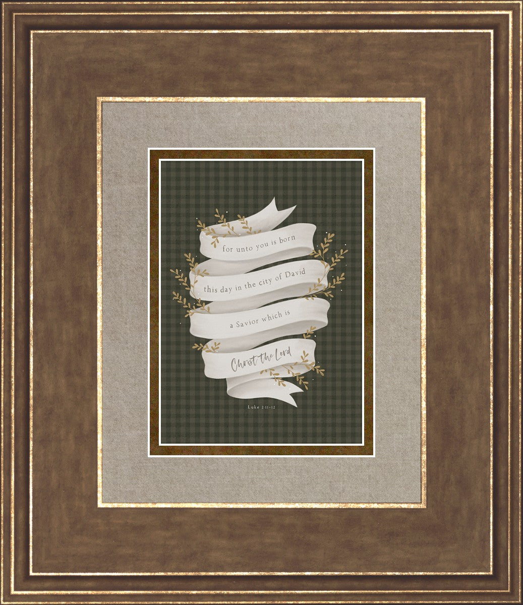A a scroll containing Luke's "for Unto You" over a green checkerboard background
