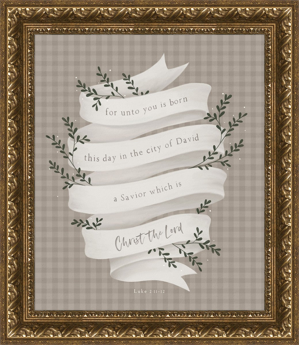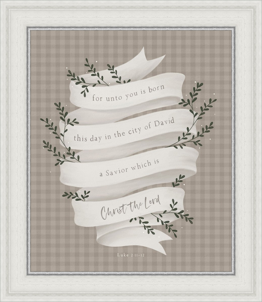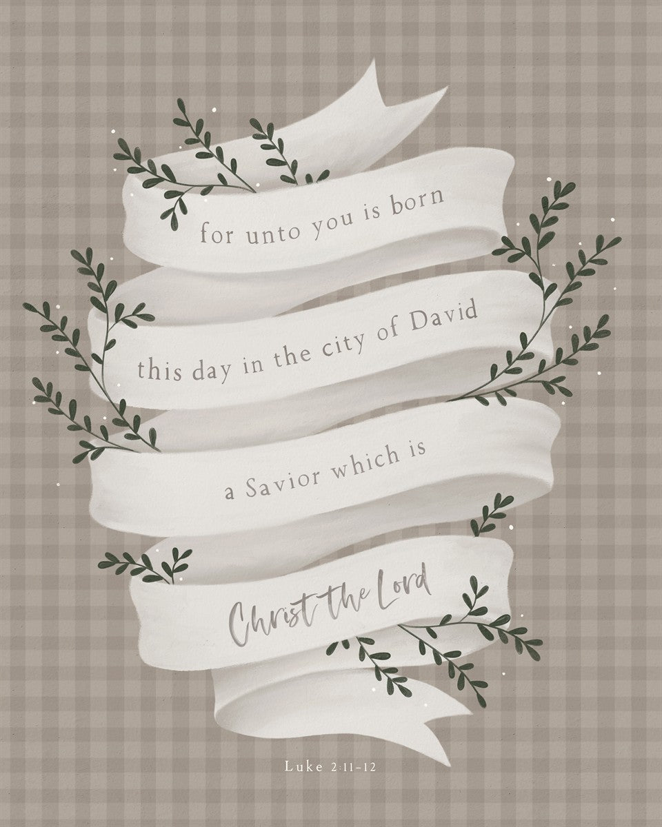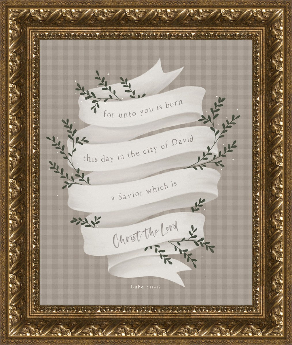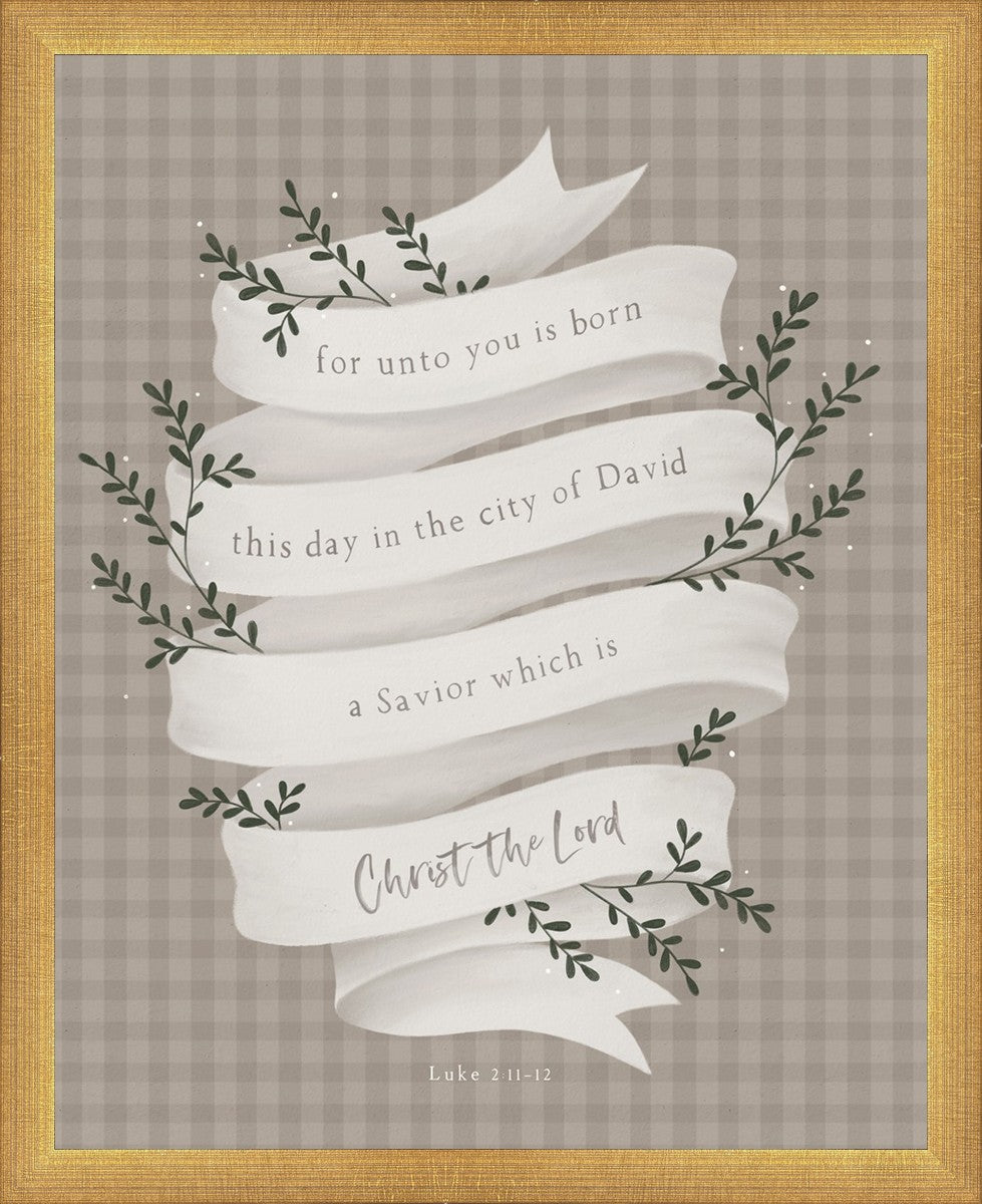 A a scroll containing Luke's "for Unto You" over a tan checkerboard background