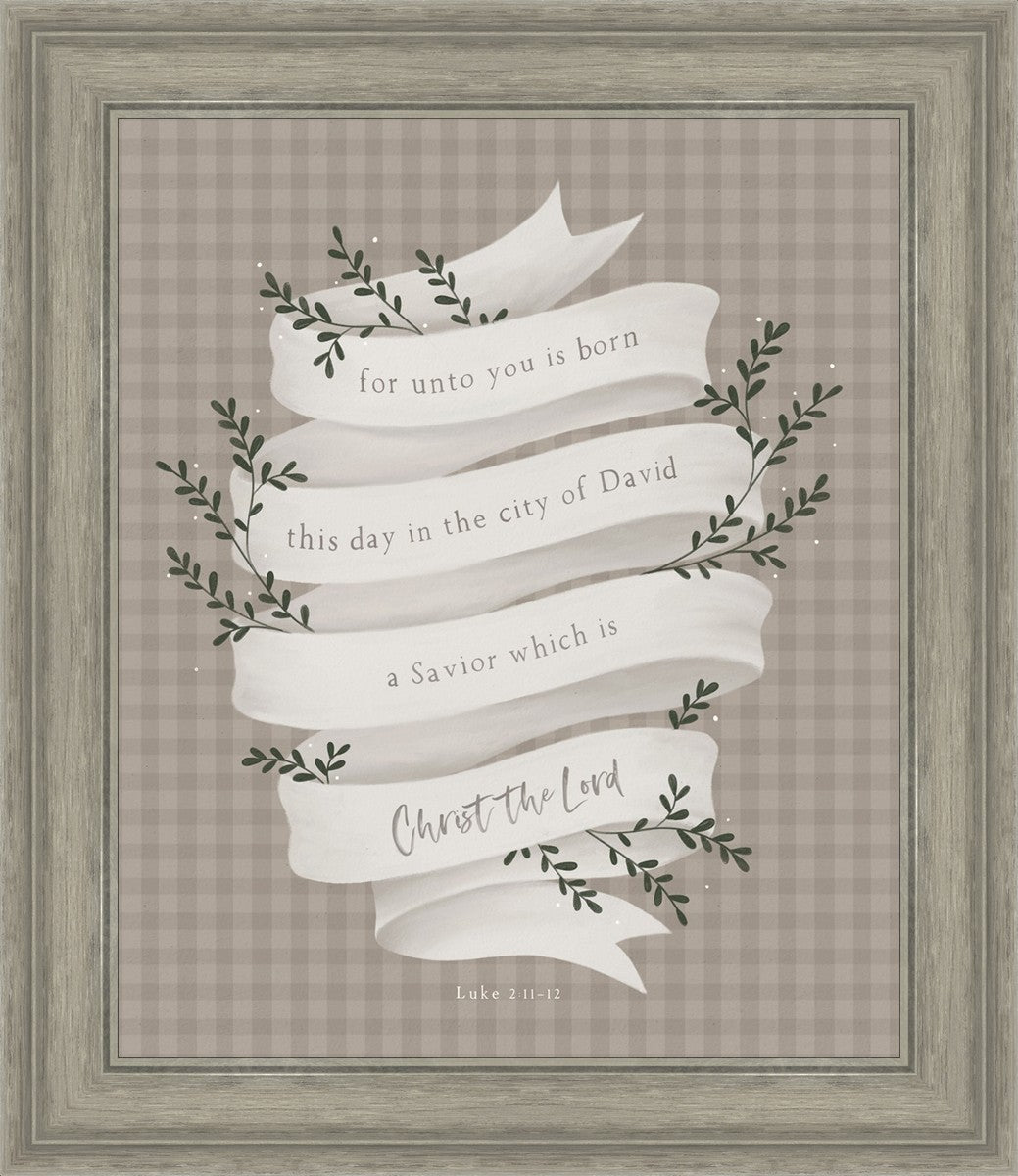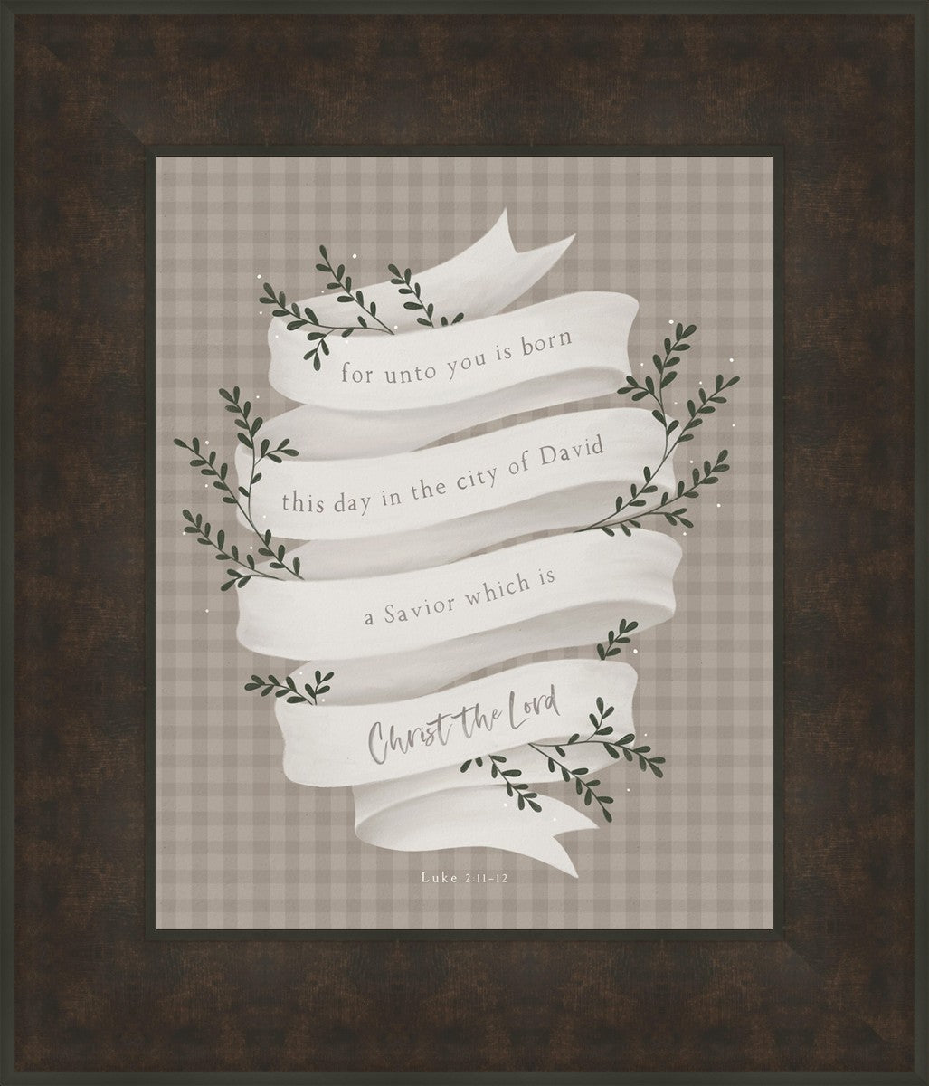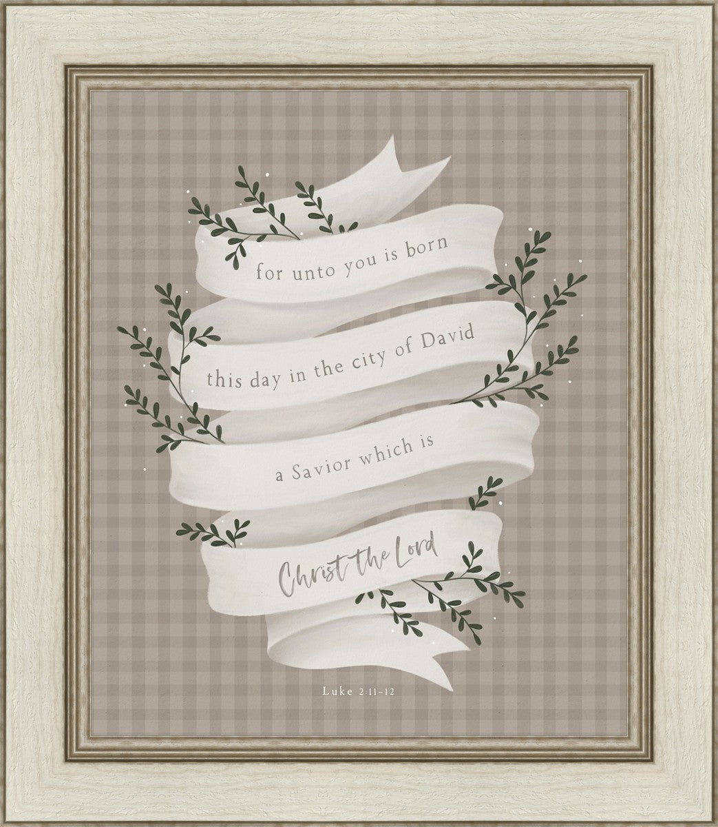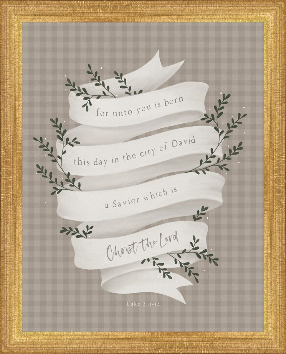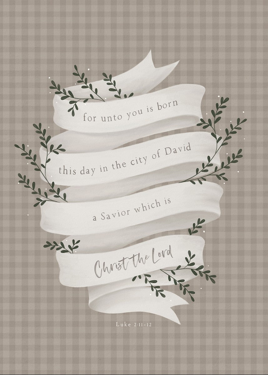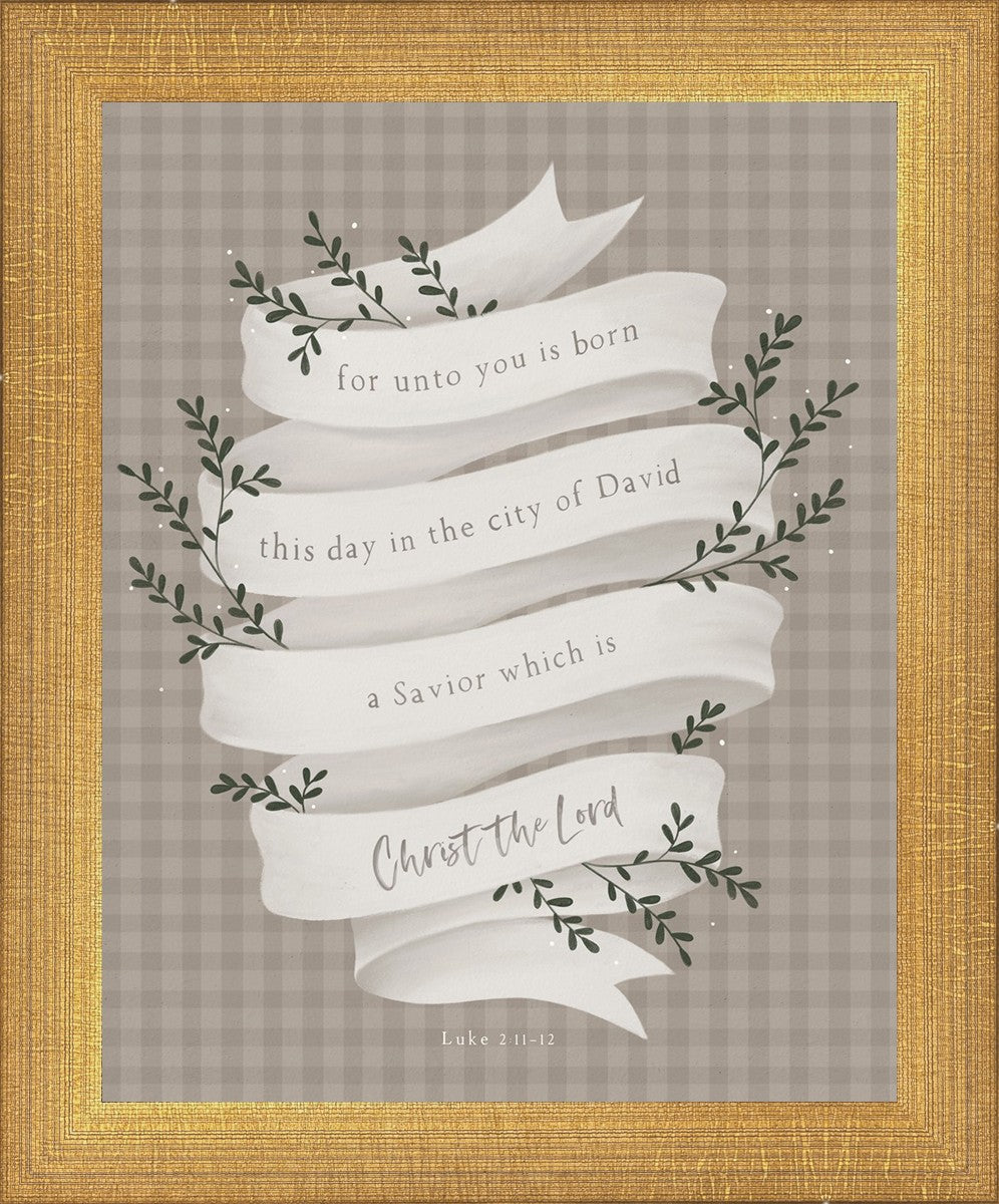 A a scroll containing Luke's "for Unto You" over a tan checkerboard background