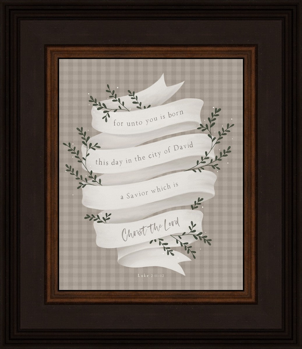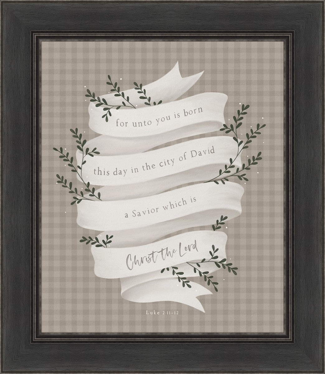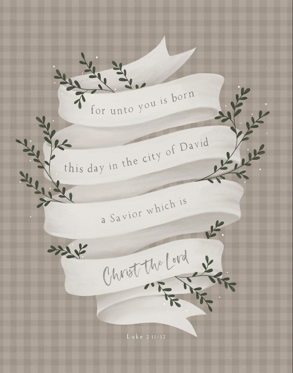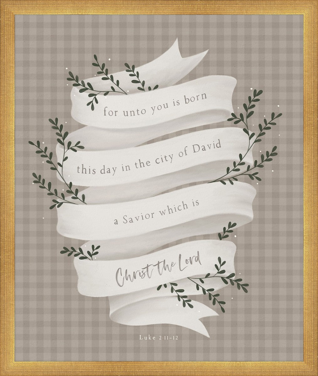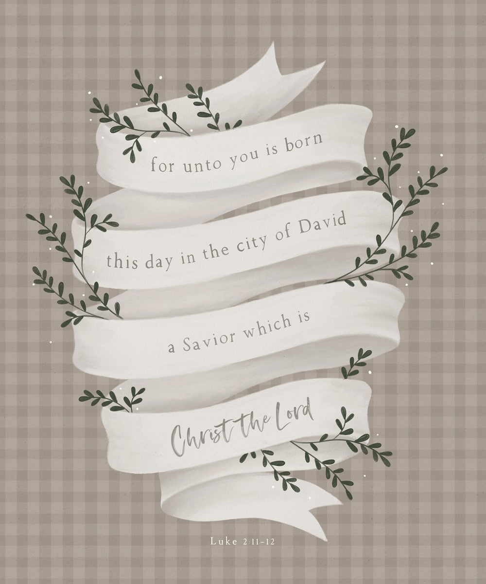 A a scroll containing Luke's "for Unto You" over a tan checkerboard background