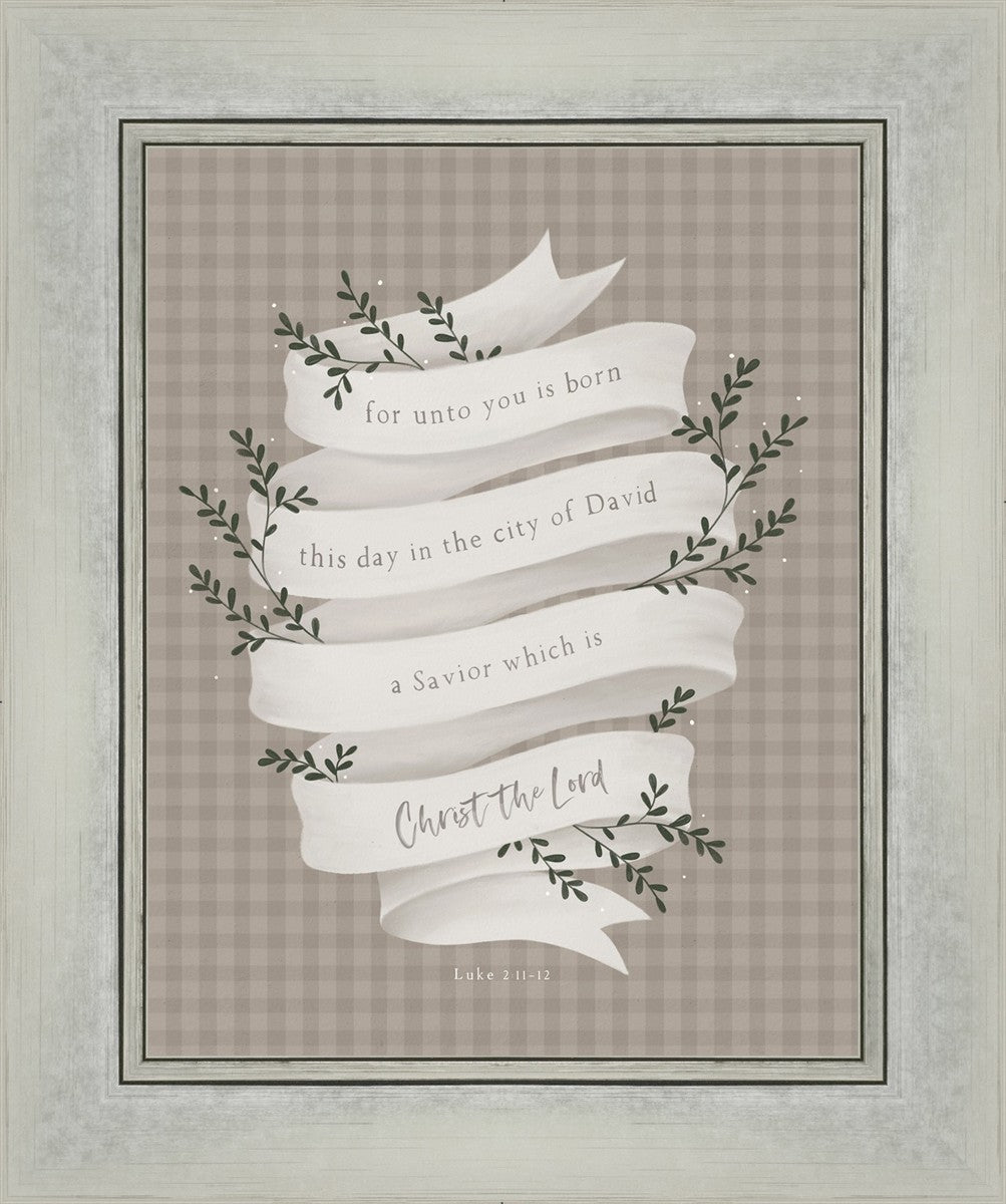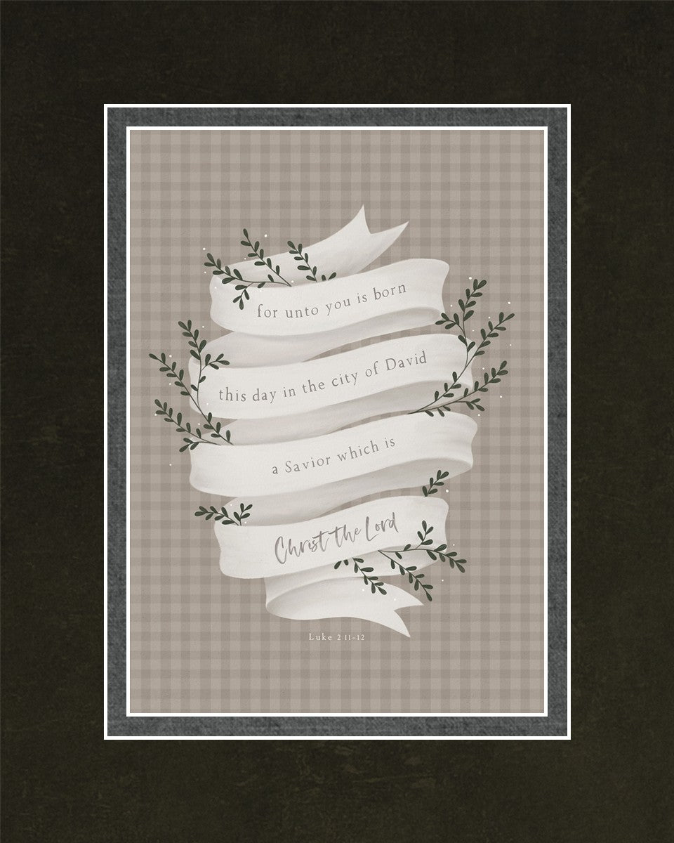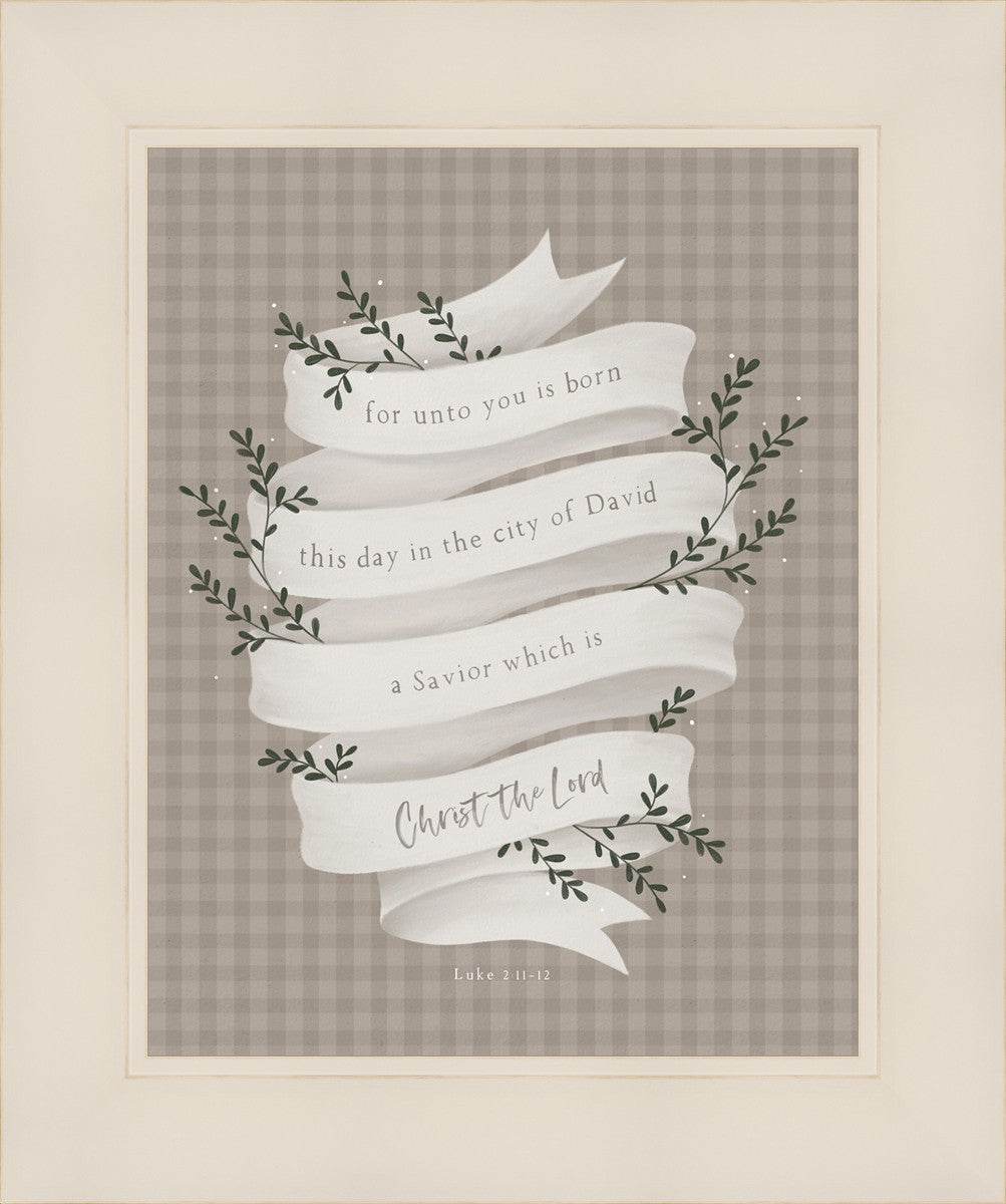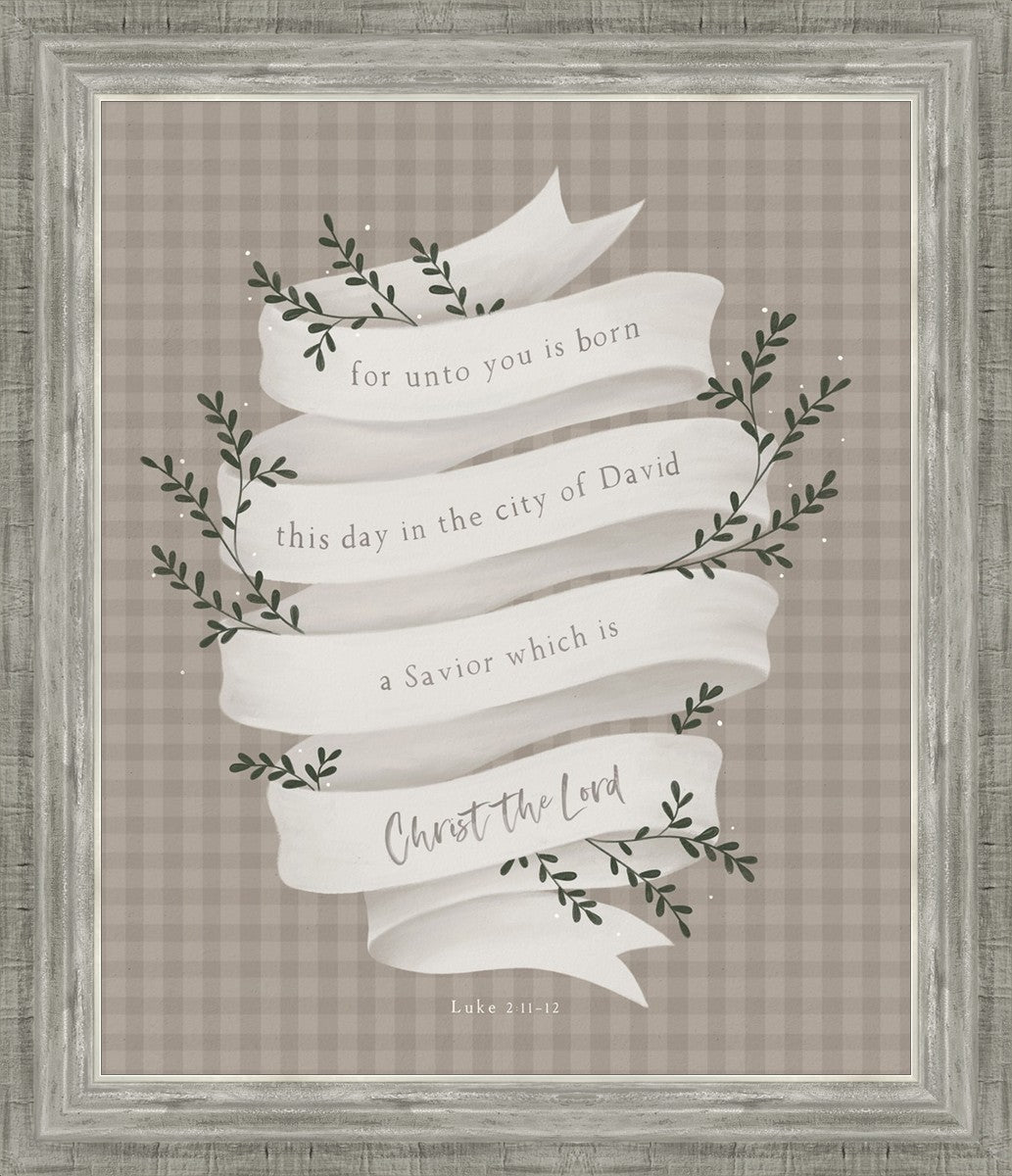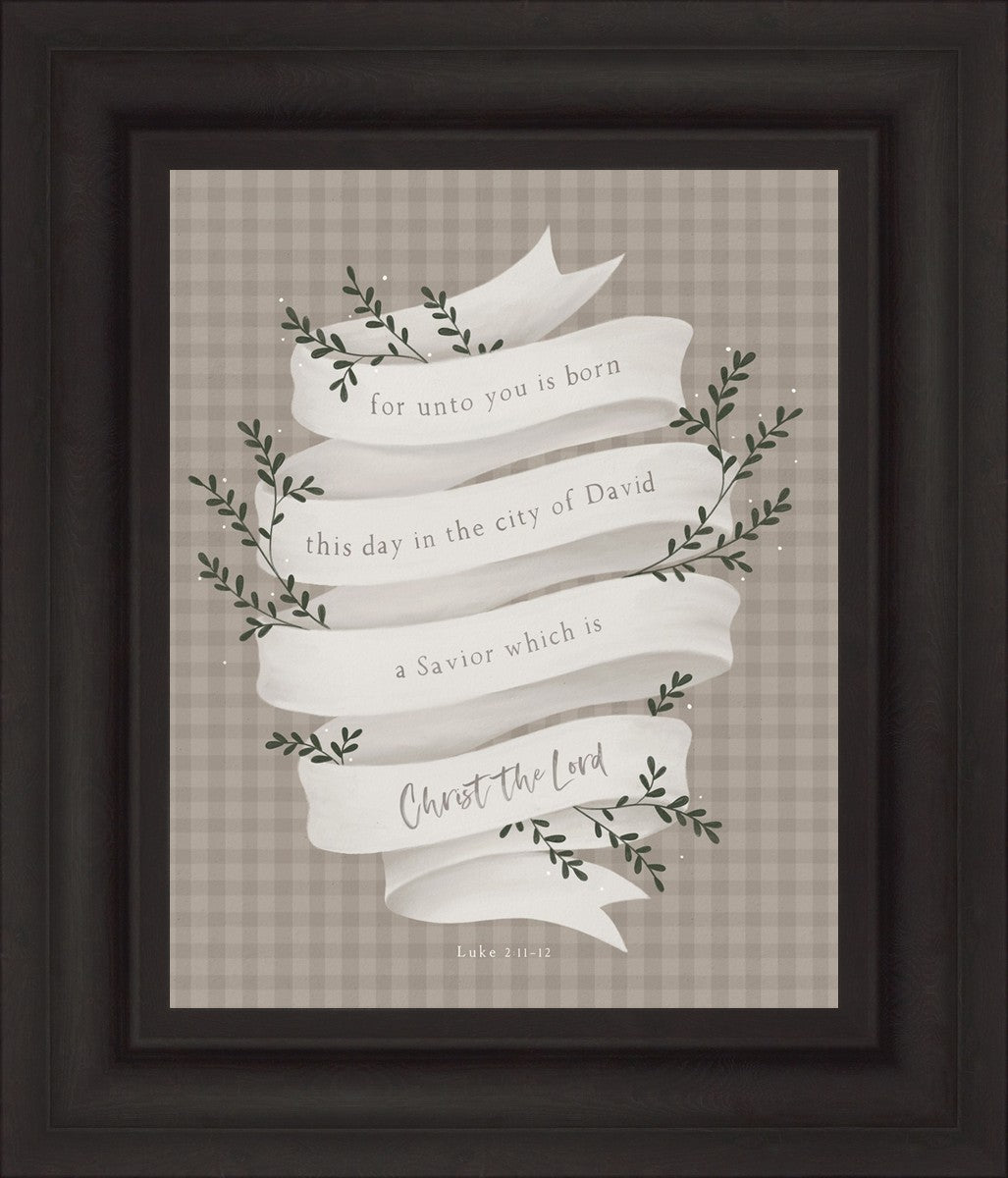 A a scroll containing Luke's "for Unto You" over a tan checkerboard background