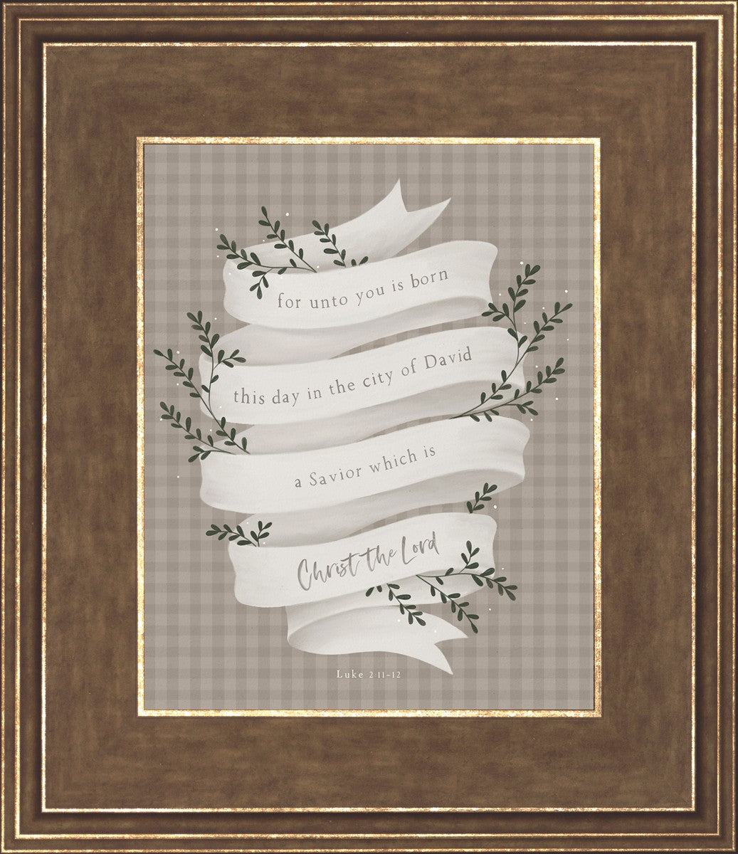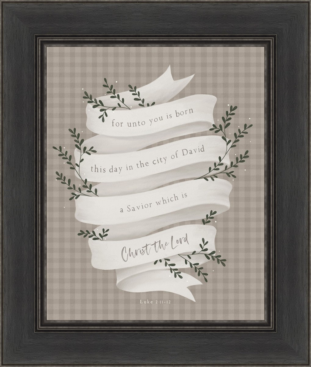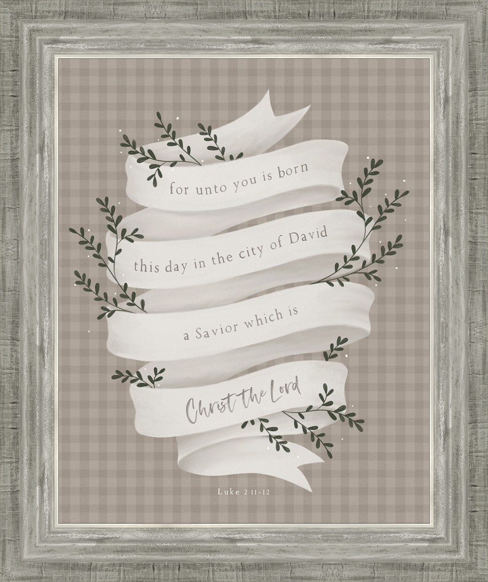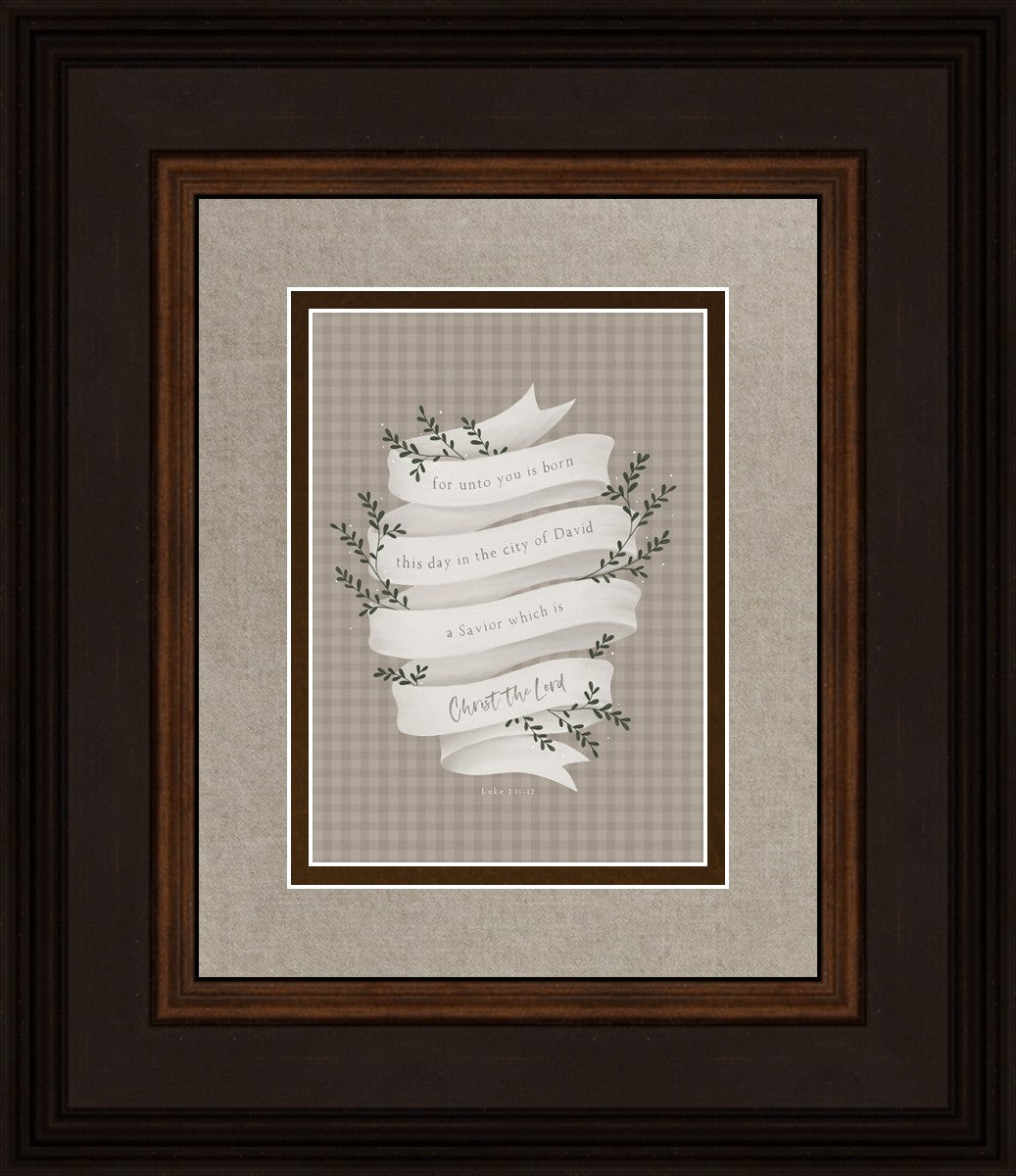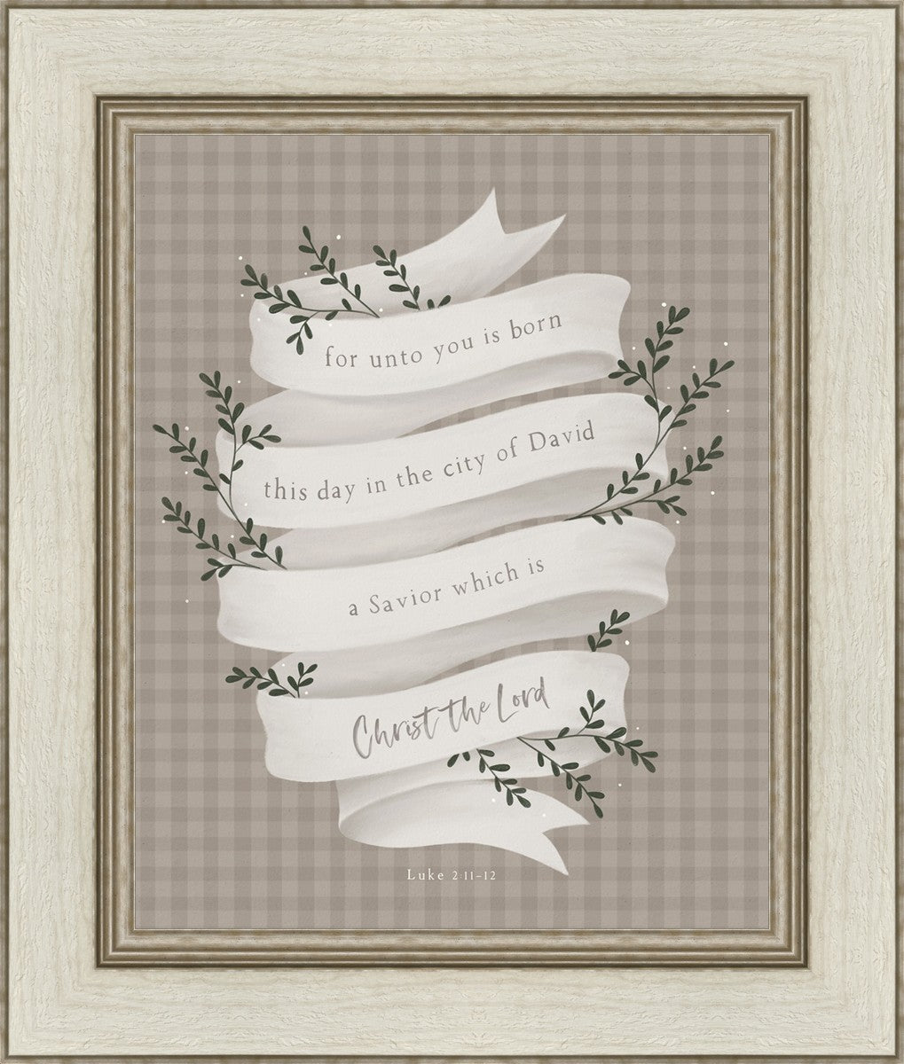 A a scroll containing Luke's "for Unto You" over a tan checkerboard background