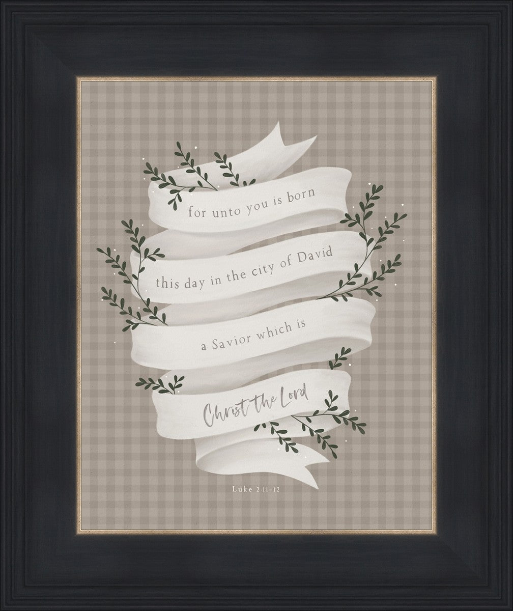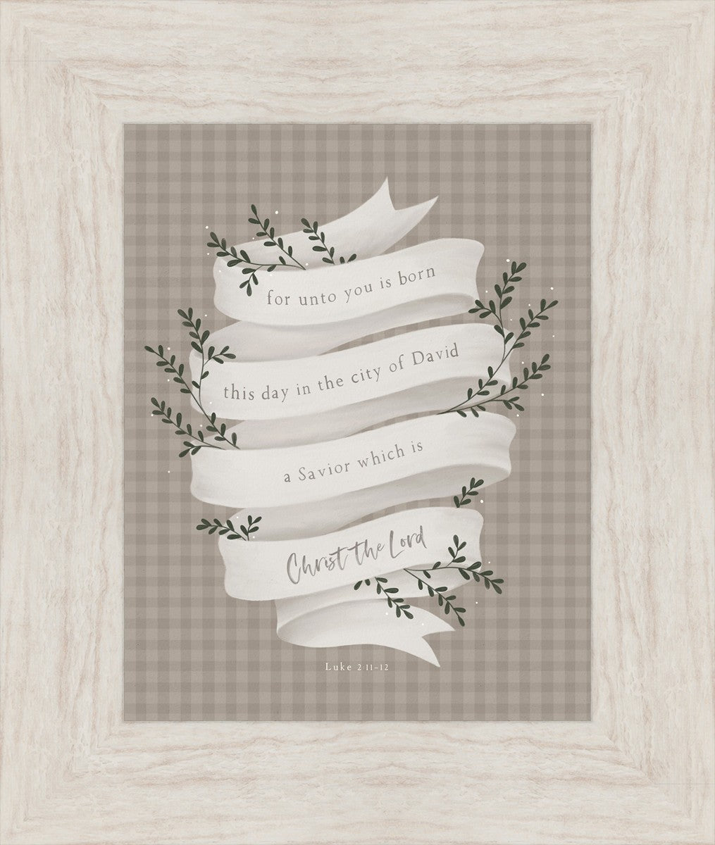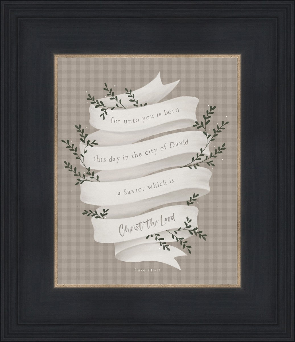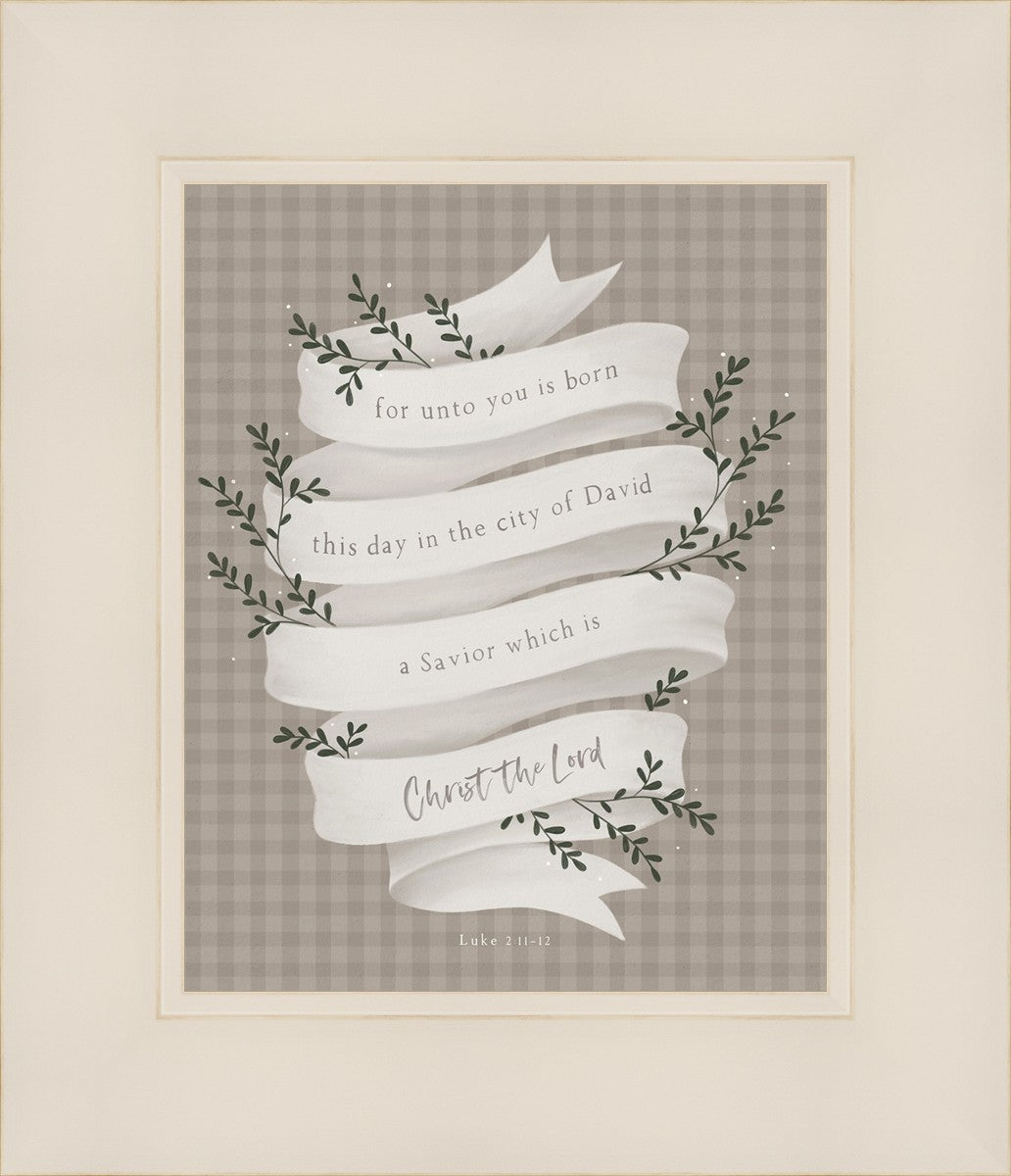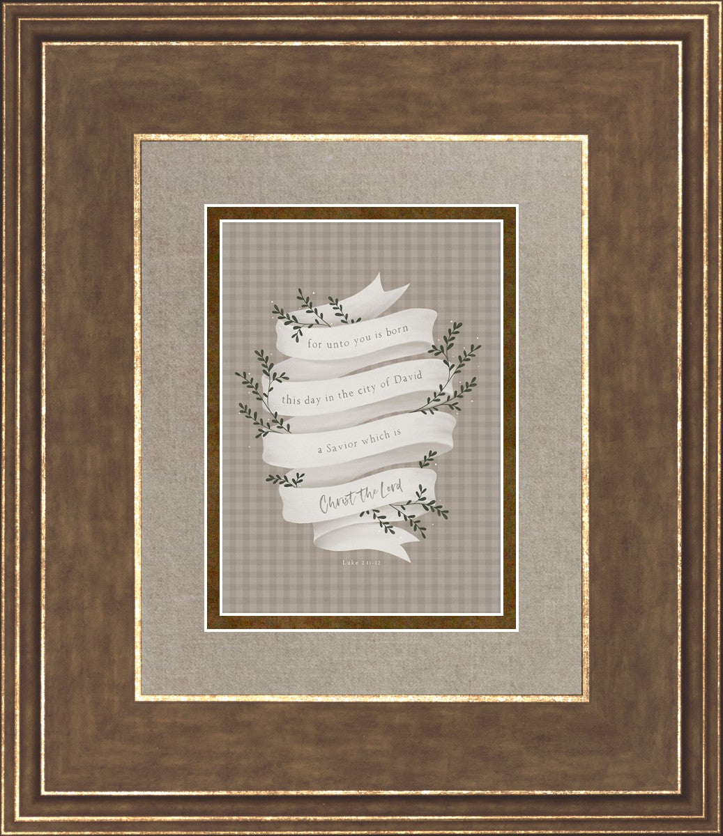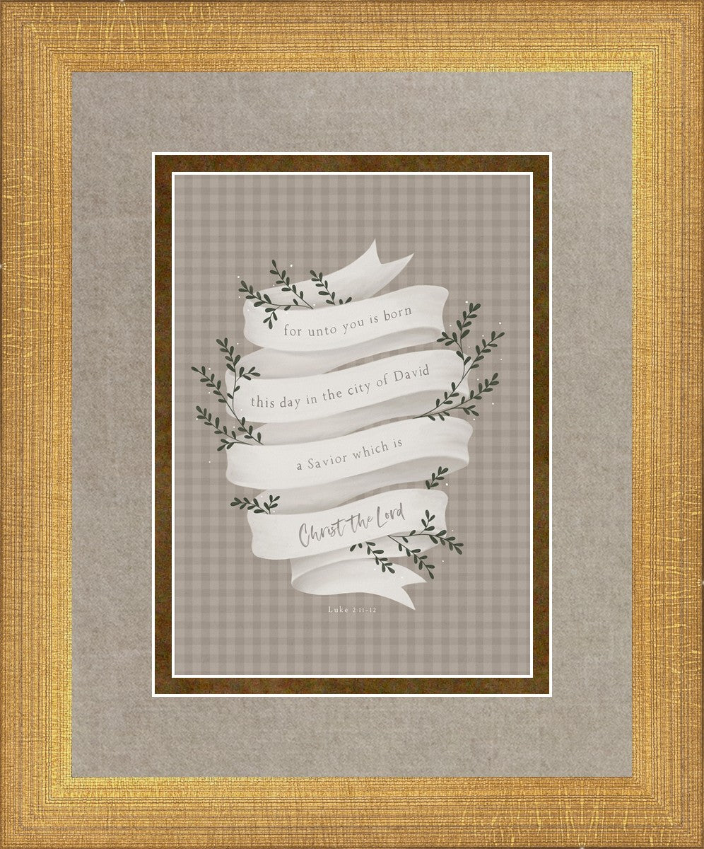 A a scroll containing Luke's "for Unto You" over a tan checkerboard background
