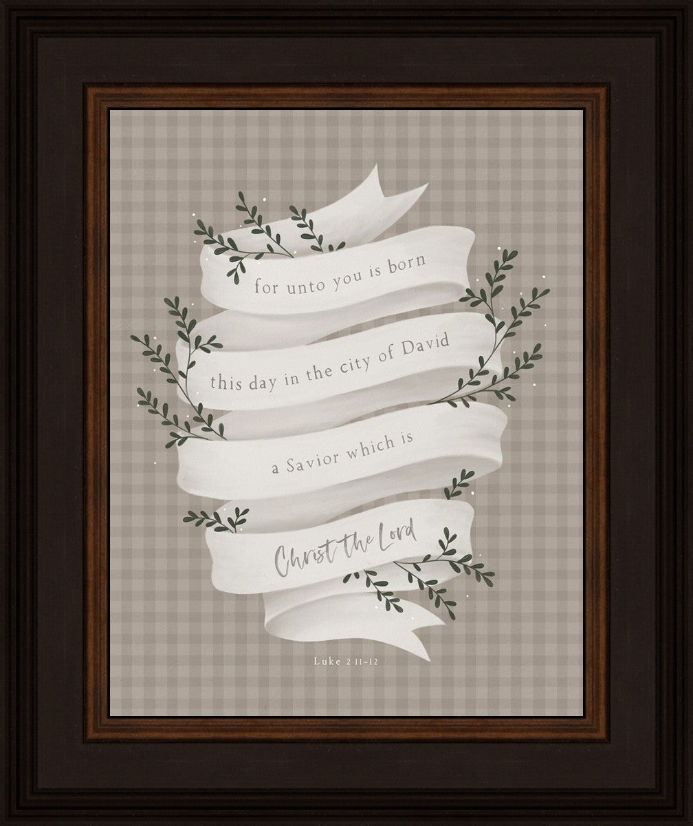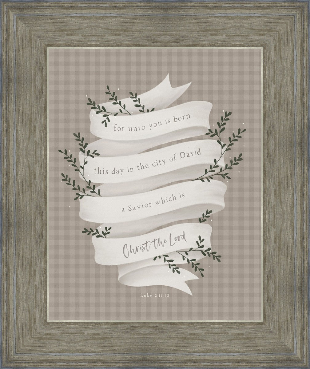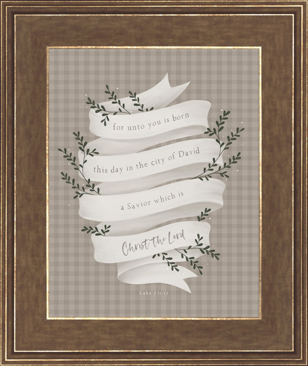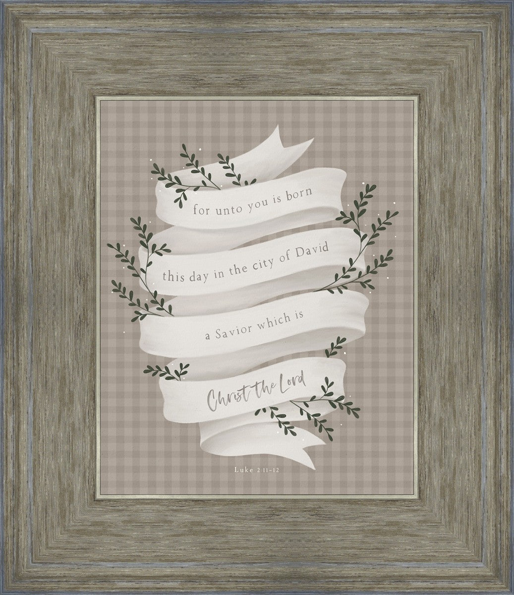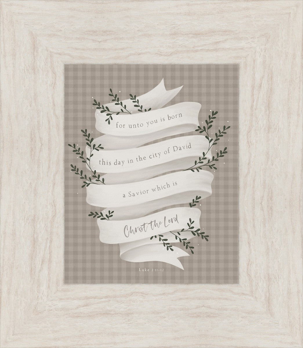 A a scroll containing Luke's "for Unto You" over a tan checkerboard background