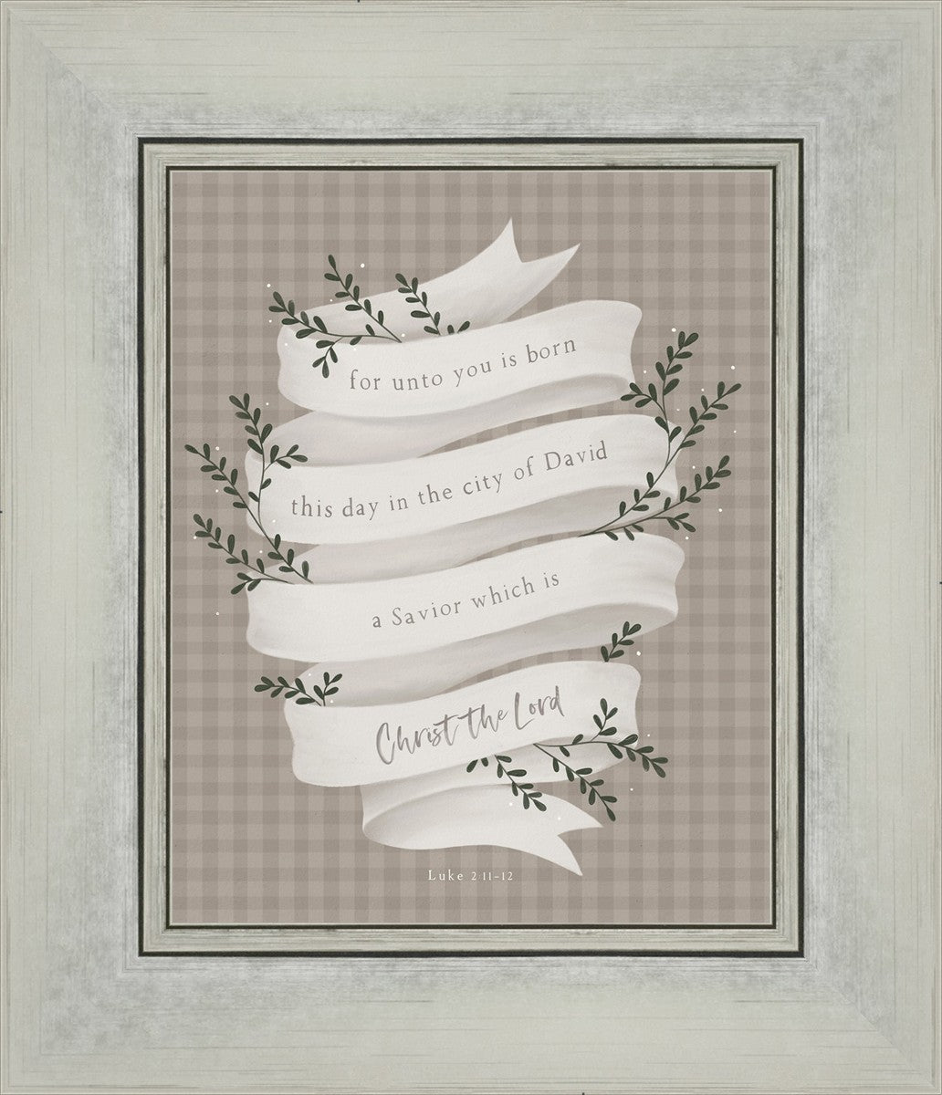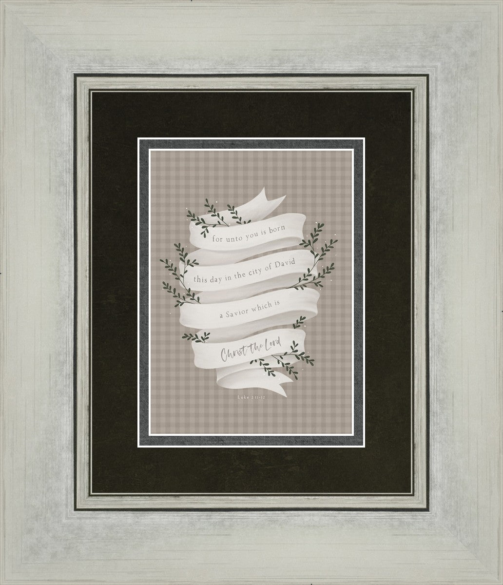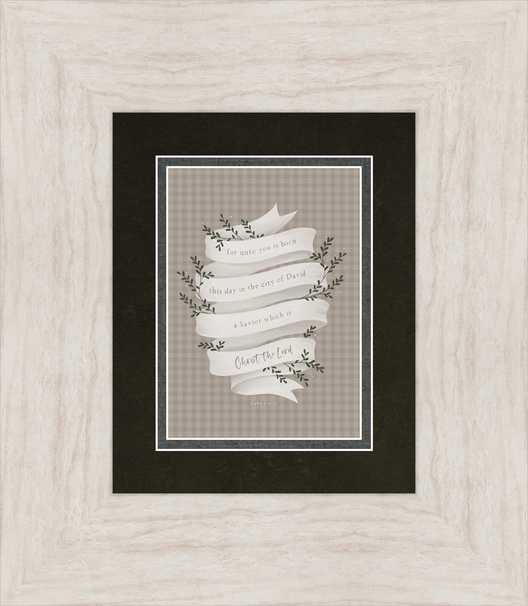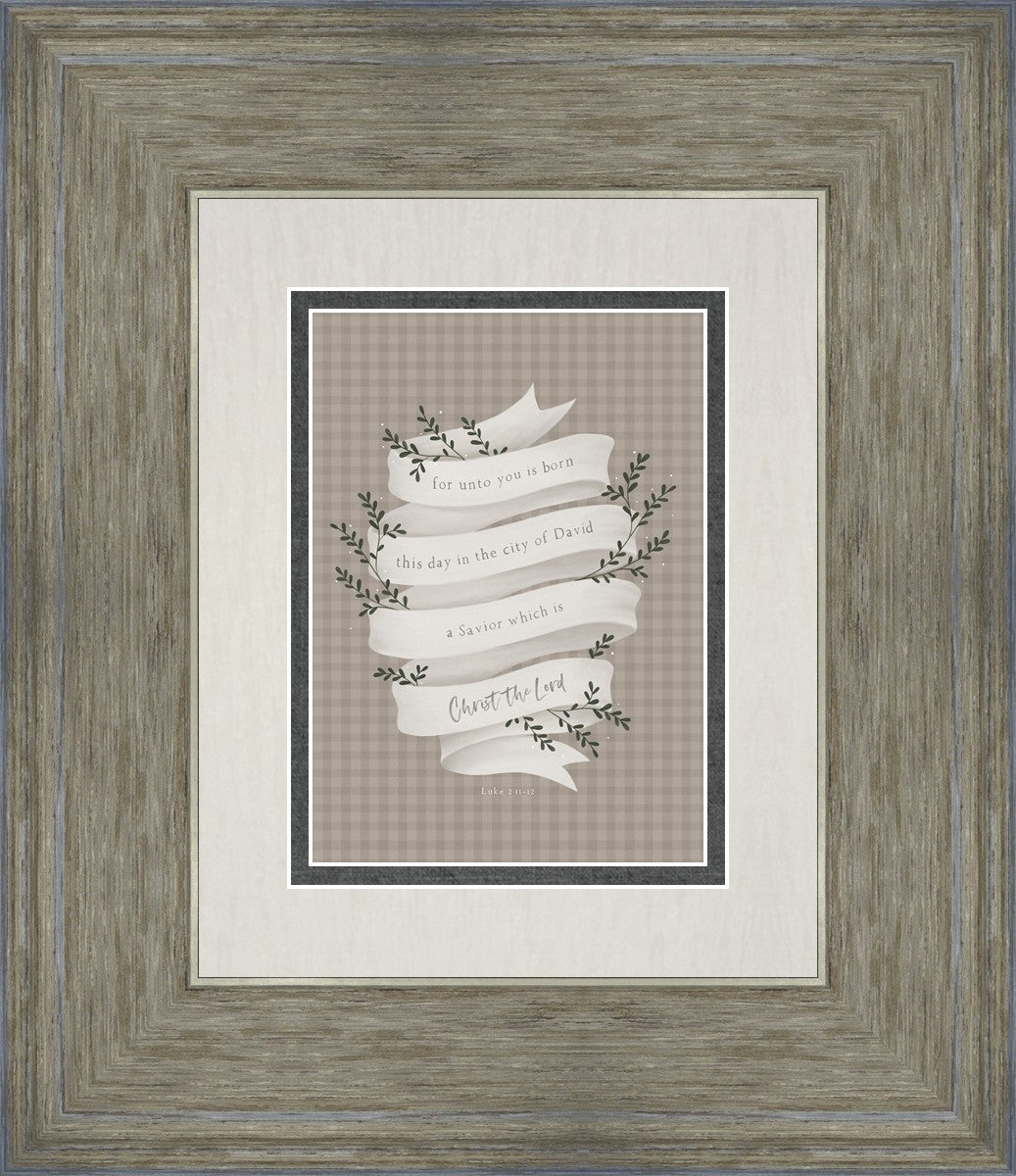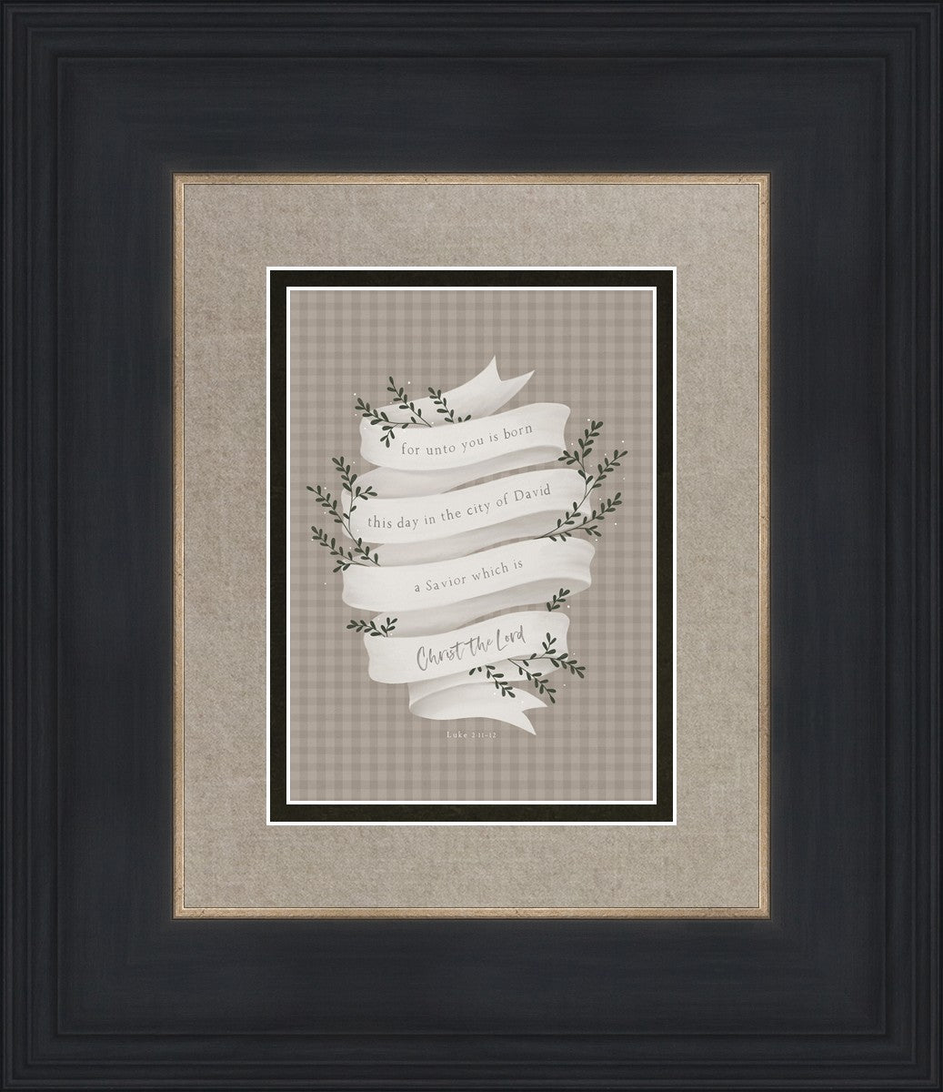A a scroll containing Luke's "for Unto You" over a tan checkerboard background