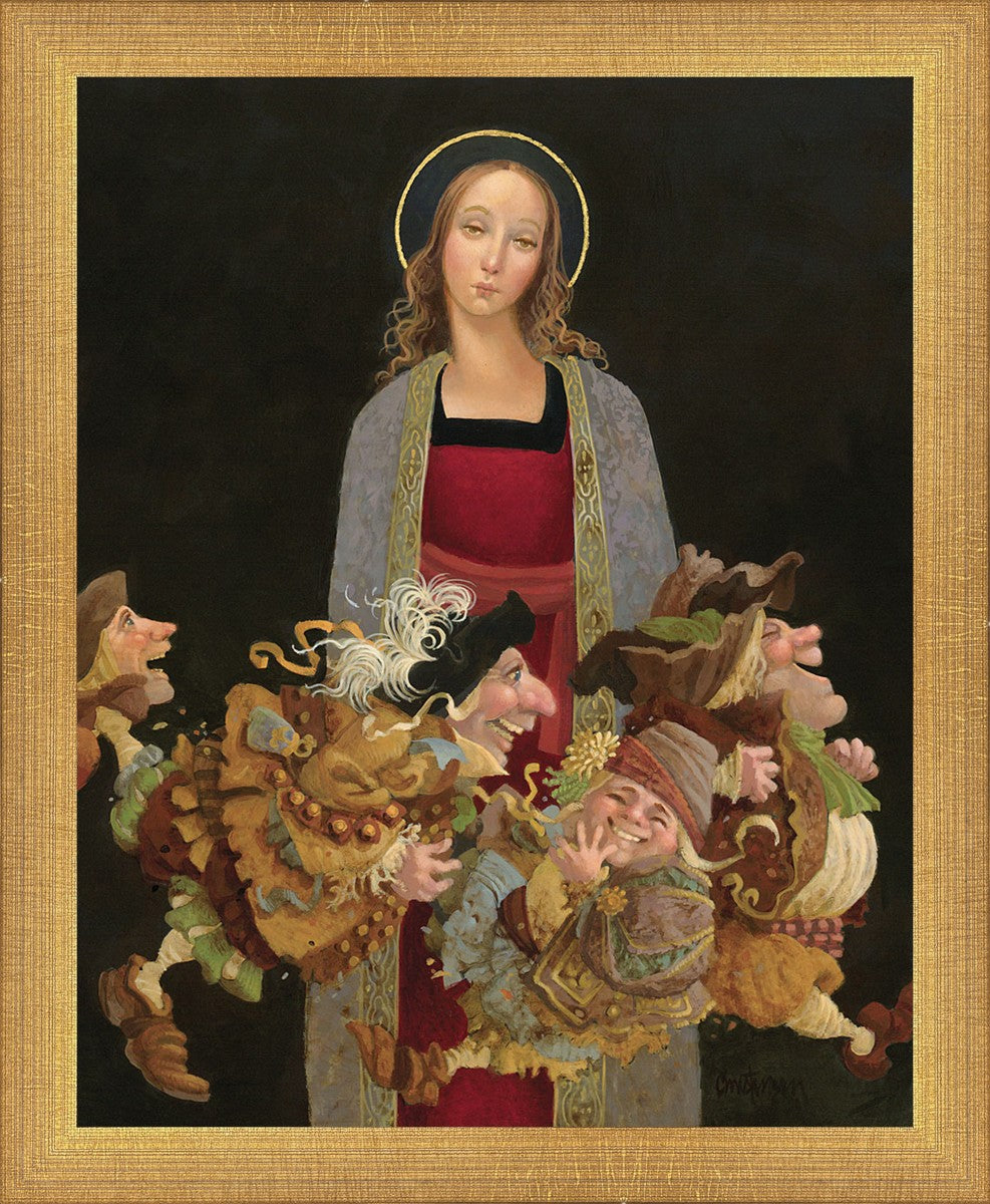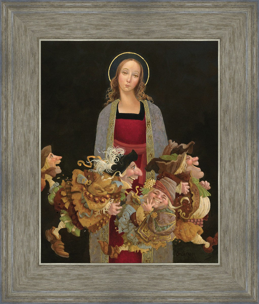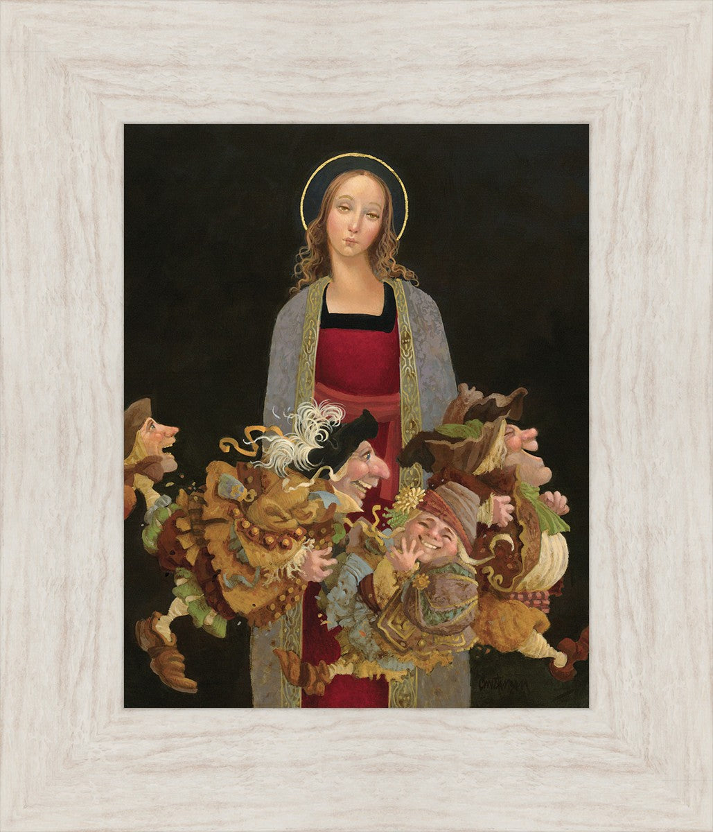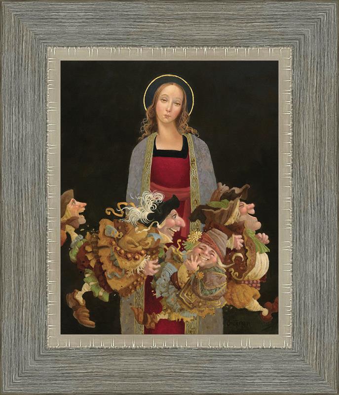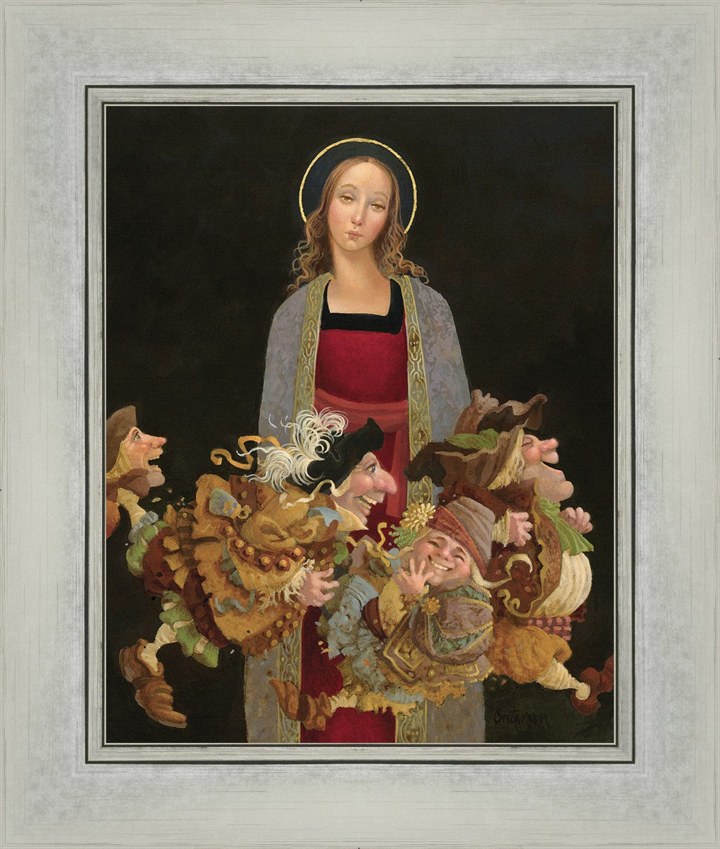 James Christensen said, “We paint to extol the beauty of the subject. I have found that, with very few exceptions, men and women alike relate to the foibles of the poofy guys and enjoy the grace and loveliness of beautiful women. We are God’s most perfect creation, and painting lovely women is a joyful way for me to celebrate that miracle.” In his depiction of Madonna, Christensen says that it is a tribute to all women who patiently endure, “...while the guys rough house in the dining room of life.”