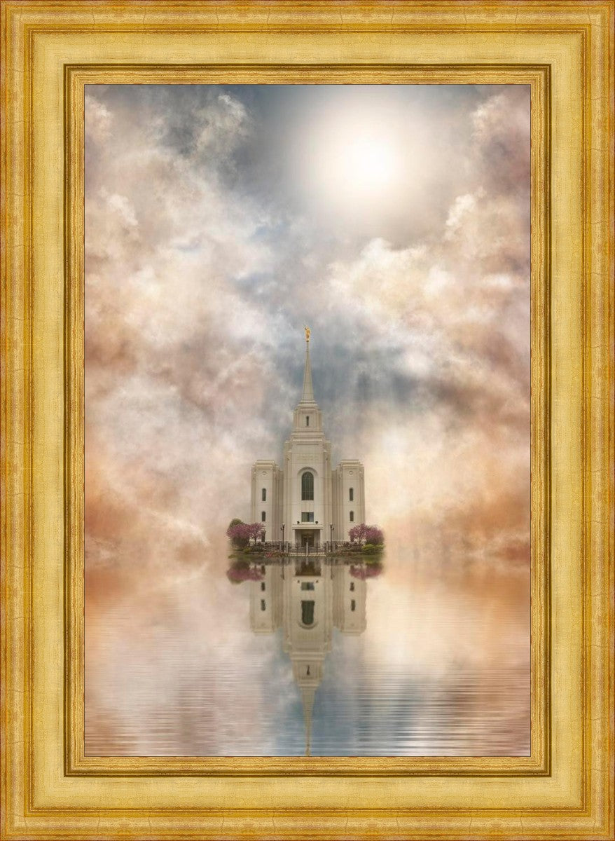 Millennial reflection of the Brigham City Utah Temple with pastel clouds in the sky.