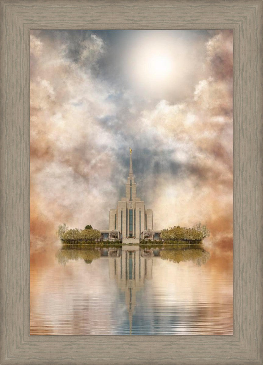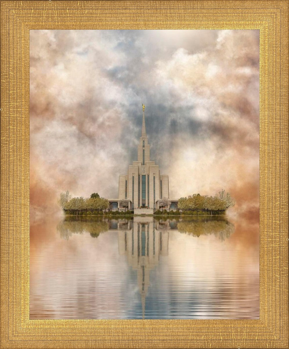 Millennial reflection of the Oquirrh Mountain Utah Temple with pastel clouds in the sky.