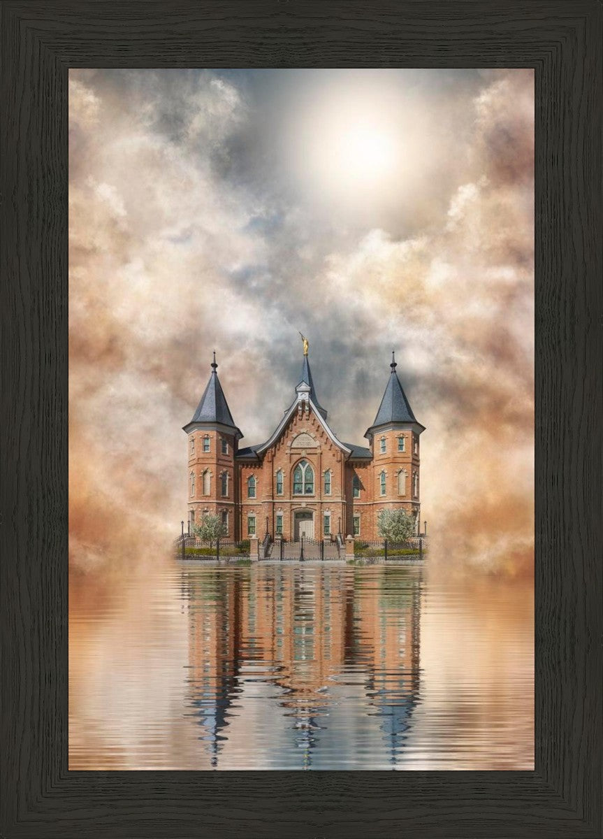 Reflection of the Provo City Center Temple with pastel clouds in the sky.