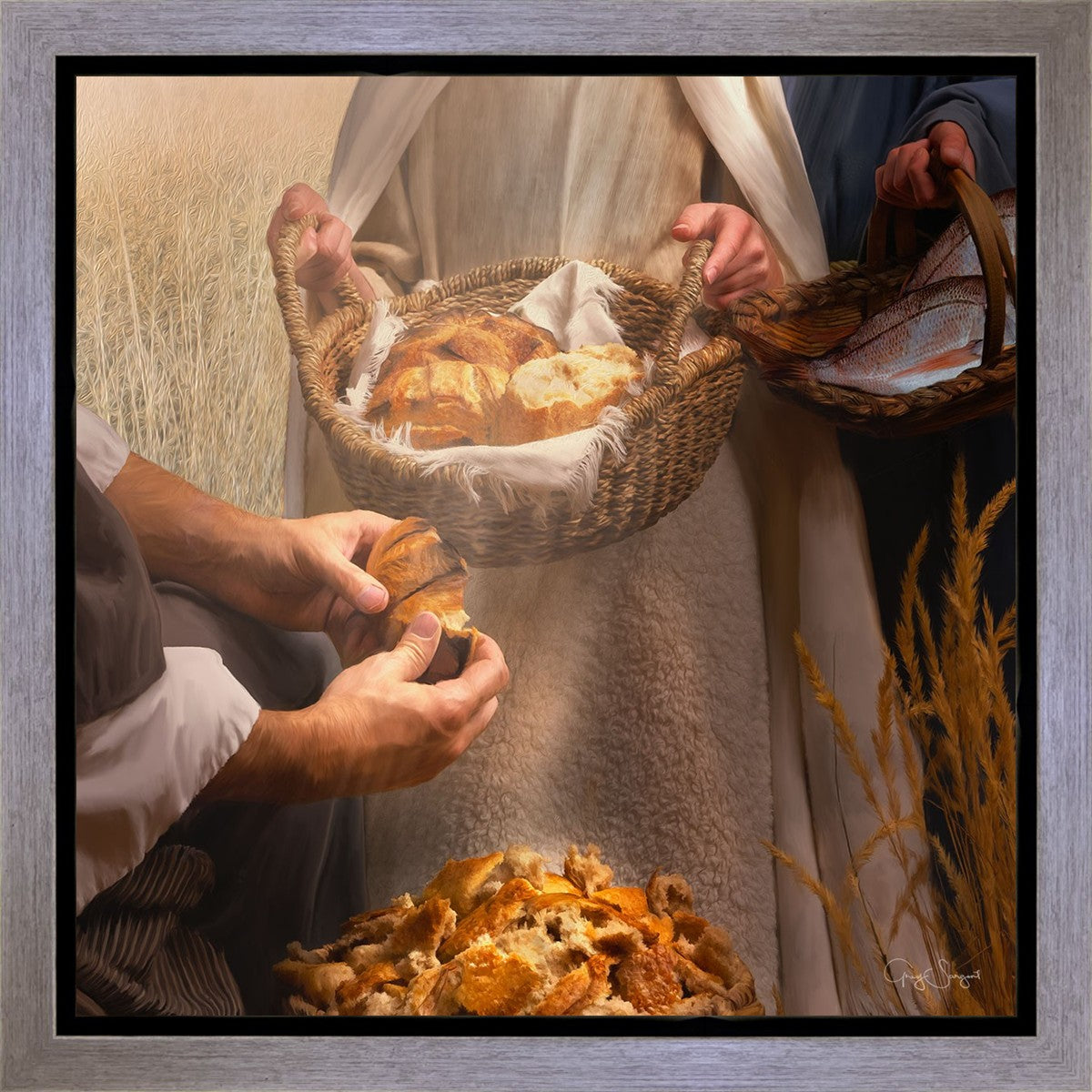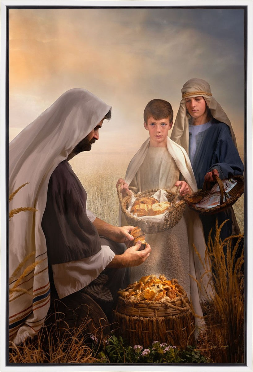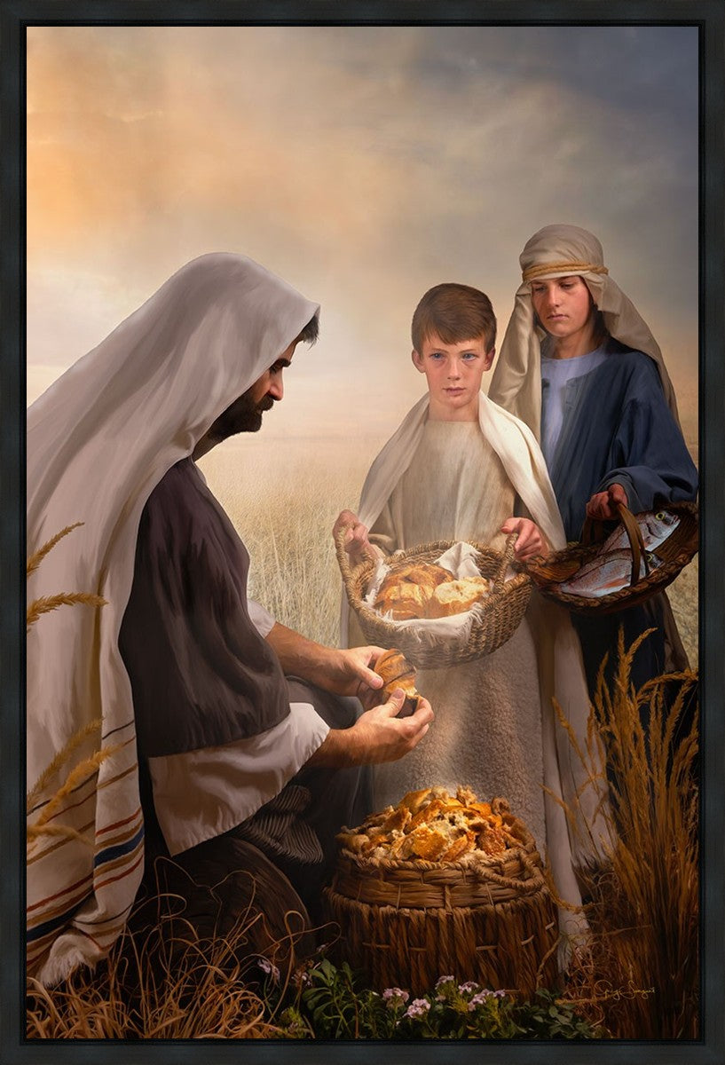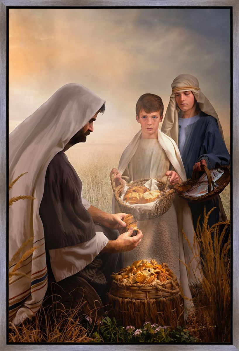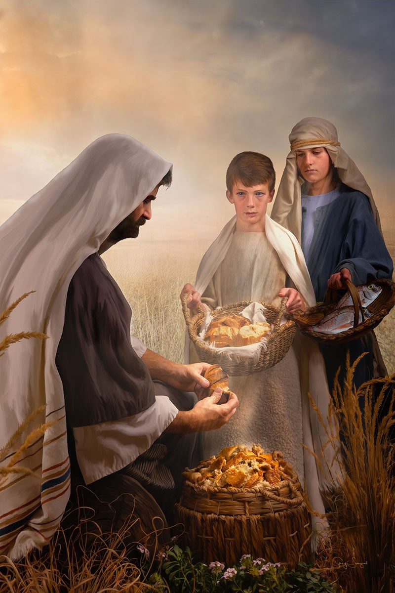 Miracle by the Sea by Greg Sargent features Jesus Christ performing the miracle of turning five loaves and two fish into food for the multitude as two young men gather it all in baskets