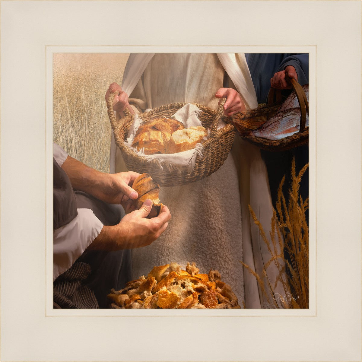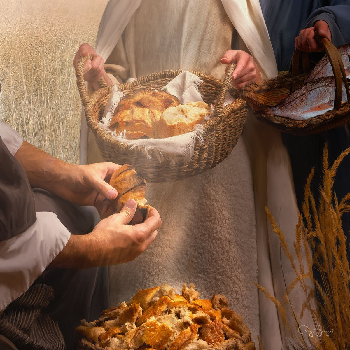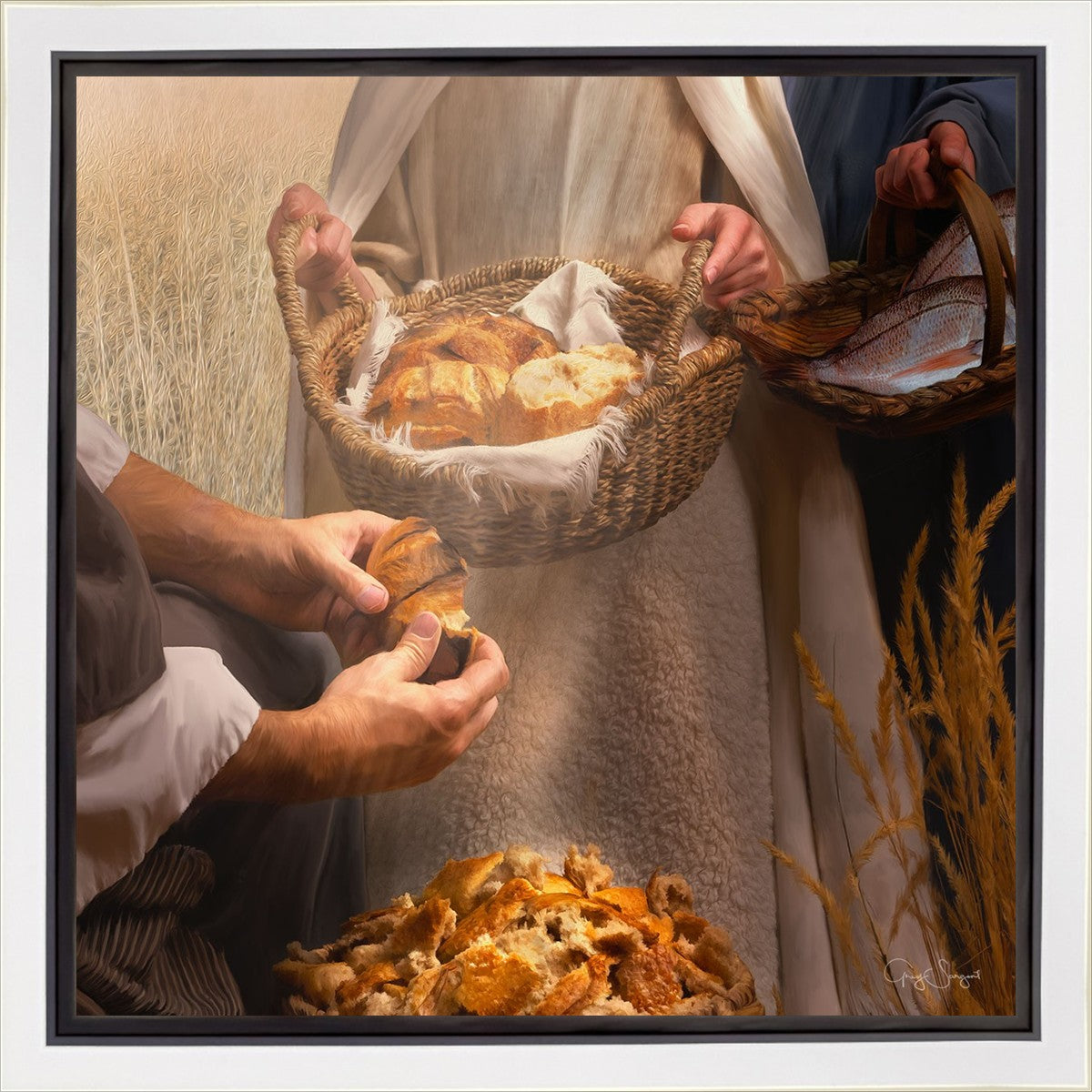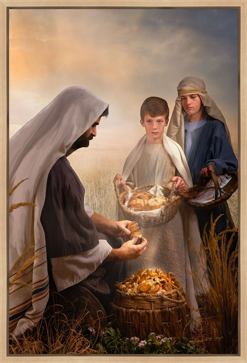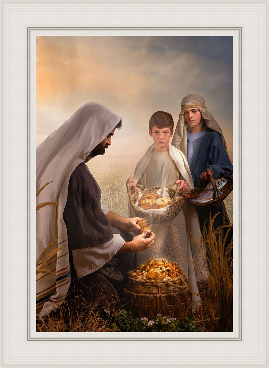 Miracle by the Sea by Greg Sargent features Jesus Christ performing the miracle of turning five loaves and two fish into food for the multitude as two young men gather it all in baskets